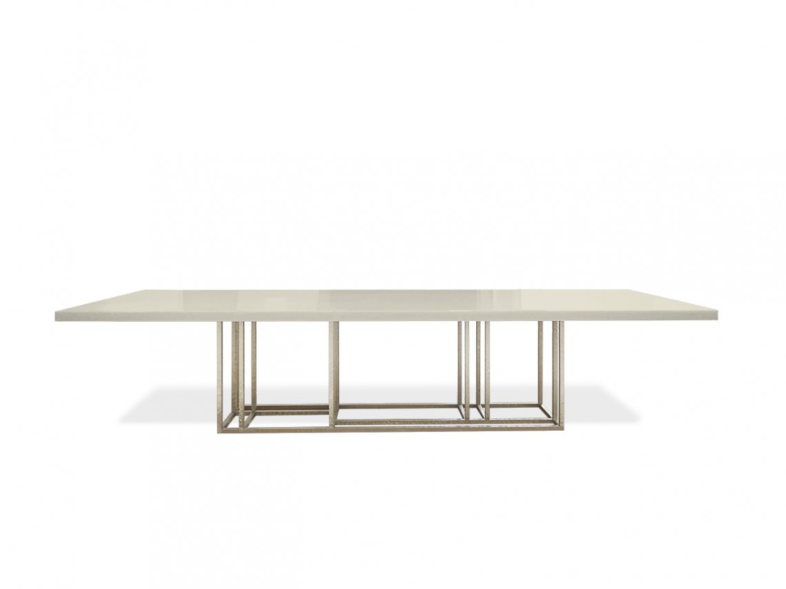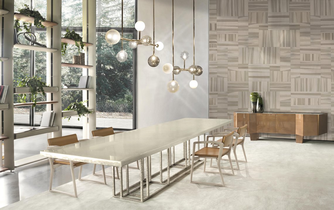 The tables of Lineup collection are available in round and rectangular shape, both in several different sizes. The skillful manual method of metal engraving is inspired by the working techniques of Italian premium class jewelry. The essential and rigorous metal structure creates a harmonious contrast with the top, realized with a decorative finish composed of resins, coloured pigments and natural elements. The extraordinary decorative strength of this table with geometric lines perfectly fits a contemporary dining area.