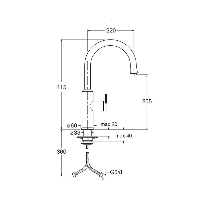 Single-control kitchen mixer, single-hole deck-mounted swivel spout, with right-hand side mechanical mixing and double click opening system, H. 415 mm