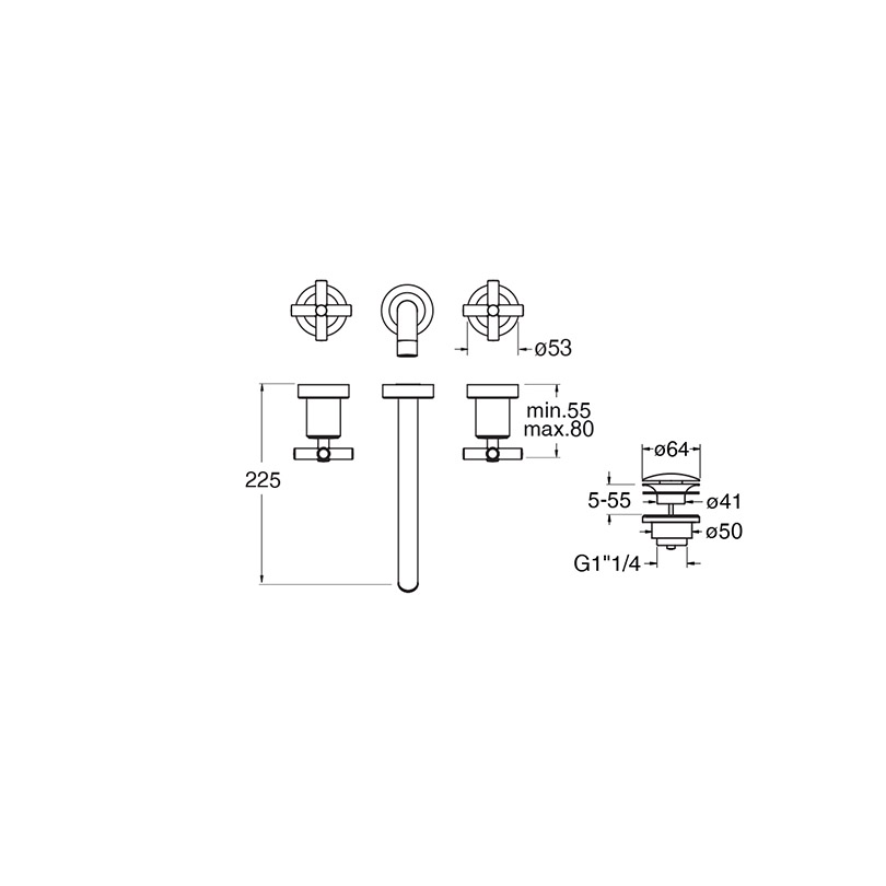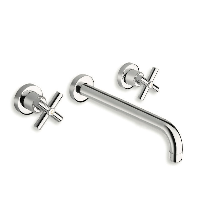 Dual-control wall-mounted external set for 3-hole Large Washbasin, 3 rosettes, with mechanical mixing and 1" 1/4 U&D* drain. Spout length 225 mm. For completion with recessed part CRICS233 (central spout) / CRICS234 (side spout)