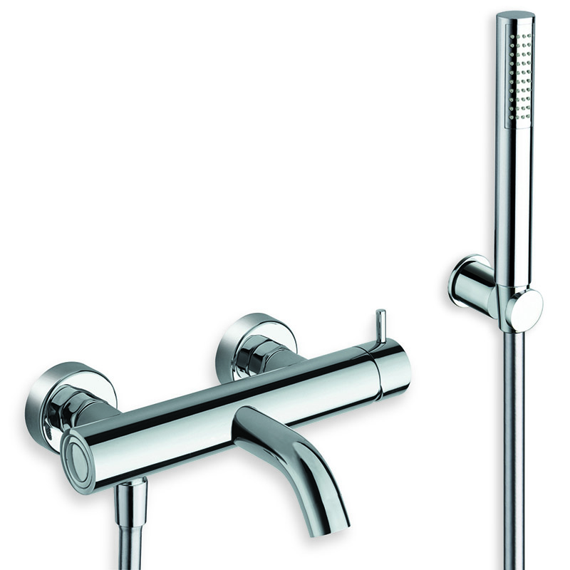 Single-control wall-mounted external bath mixer, with mechanical mixing, automatic diverter with 2 outlets, spout length 180 mm, fixed support, anti-scale mini showerhead and long-life hose