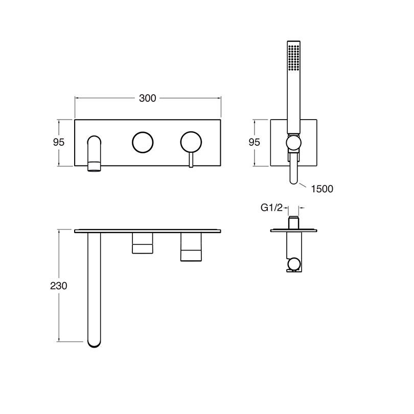 Single-control wall-mounted external set for bathtub, metal plate, with mechanical mixing, diverter with 2 outlets, spout length 230 mm, fixed support, water outlet, anti-scale mini showerhead and long-life hose ****. For completion with recessed part  CRICS100 (dx) / CRICS101 (sx)