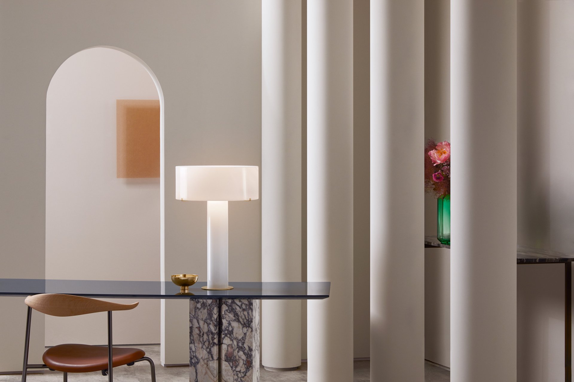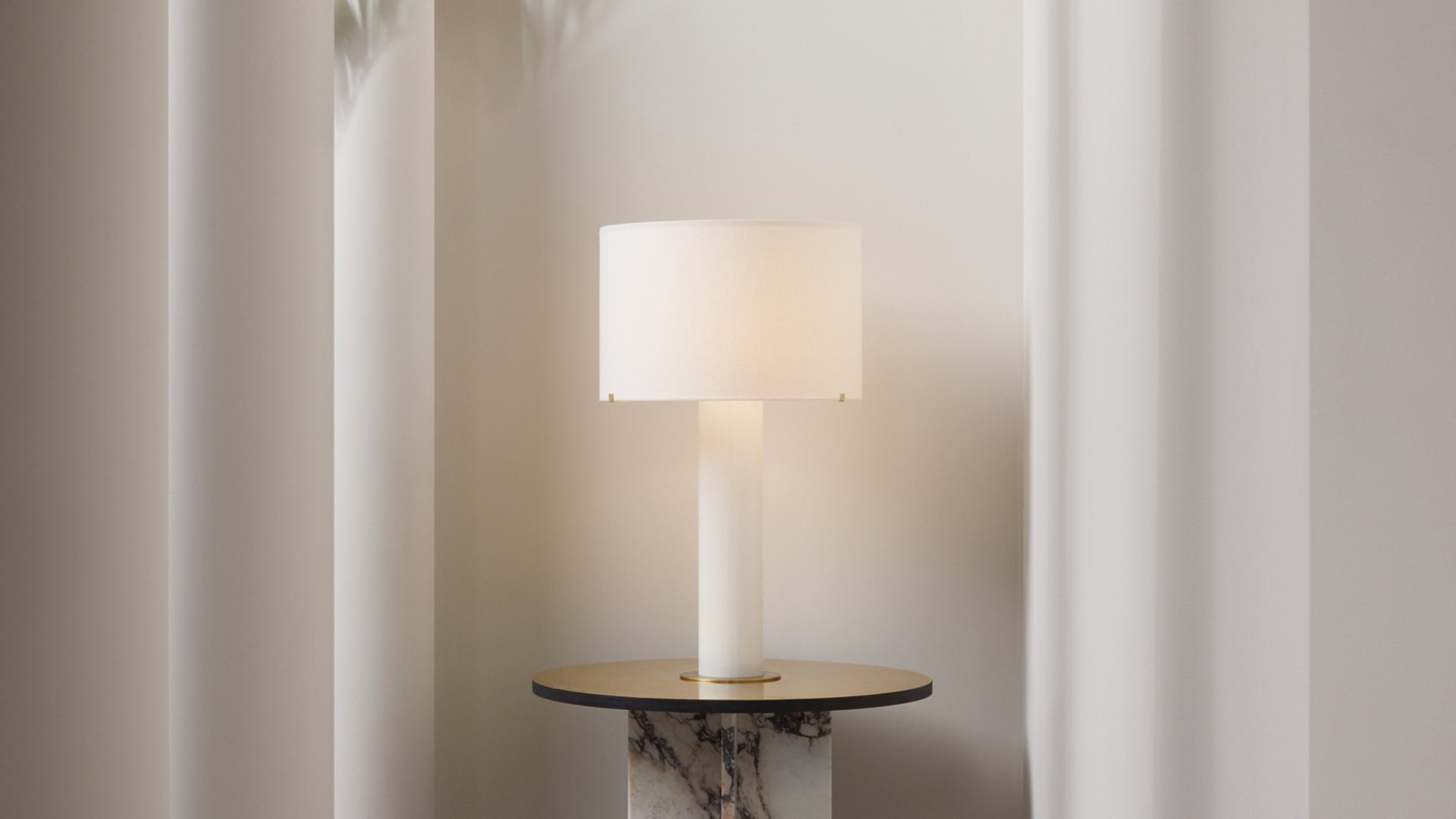A luxurious and modern version of a traditional table light, using prime materials where the design reflects the light in its entirety and fills the room with a soft glow. Base and shade are made entirely of glass, in which the translucent nature of the material softens and contrasts with the simplicity of the strong lines. The satin brass detailing adds luxury to this contemporary design that reflects the light in its entirety and fills the room with a soft glow. Also available with a classic linen shade.