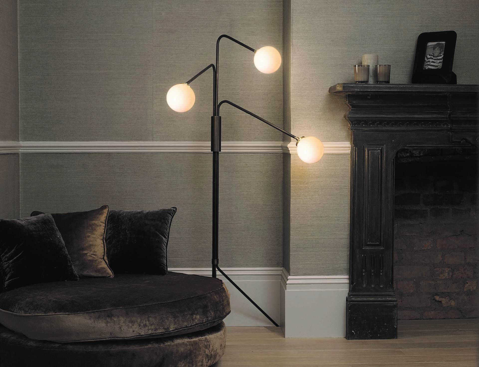This sculptural light is both modern and retro. Its distinctive form with multiple arms furnish a space with great style. The metalwork is brass, then bronzed and hand waxed which contrasts with the brass detailing. The moveable glass spheres give a wonderful diffuse glow and creates a beautiful soft glow at night.