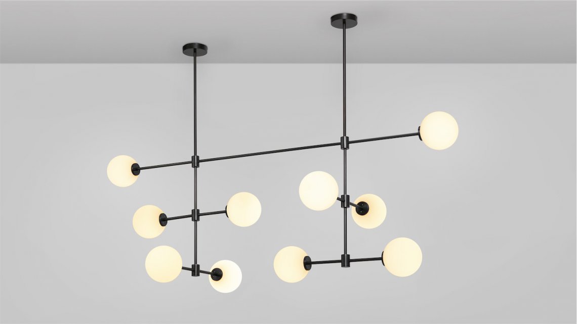 A grand statement of graphic precision, the TREVI MULTI is a series of satin brass or bronze arms arranged to illuminate a larger space and can be scaled to fit any interior. Originally inspired by the famous fountain at the Piazza di Trevi, the new multi-arm version features elongated brass or bronze arms composed in a grid like formation that provides light at two or three tiers.
