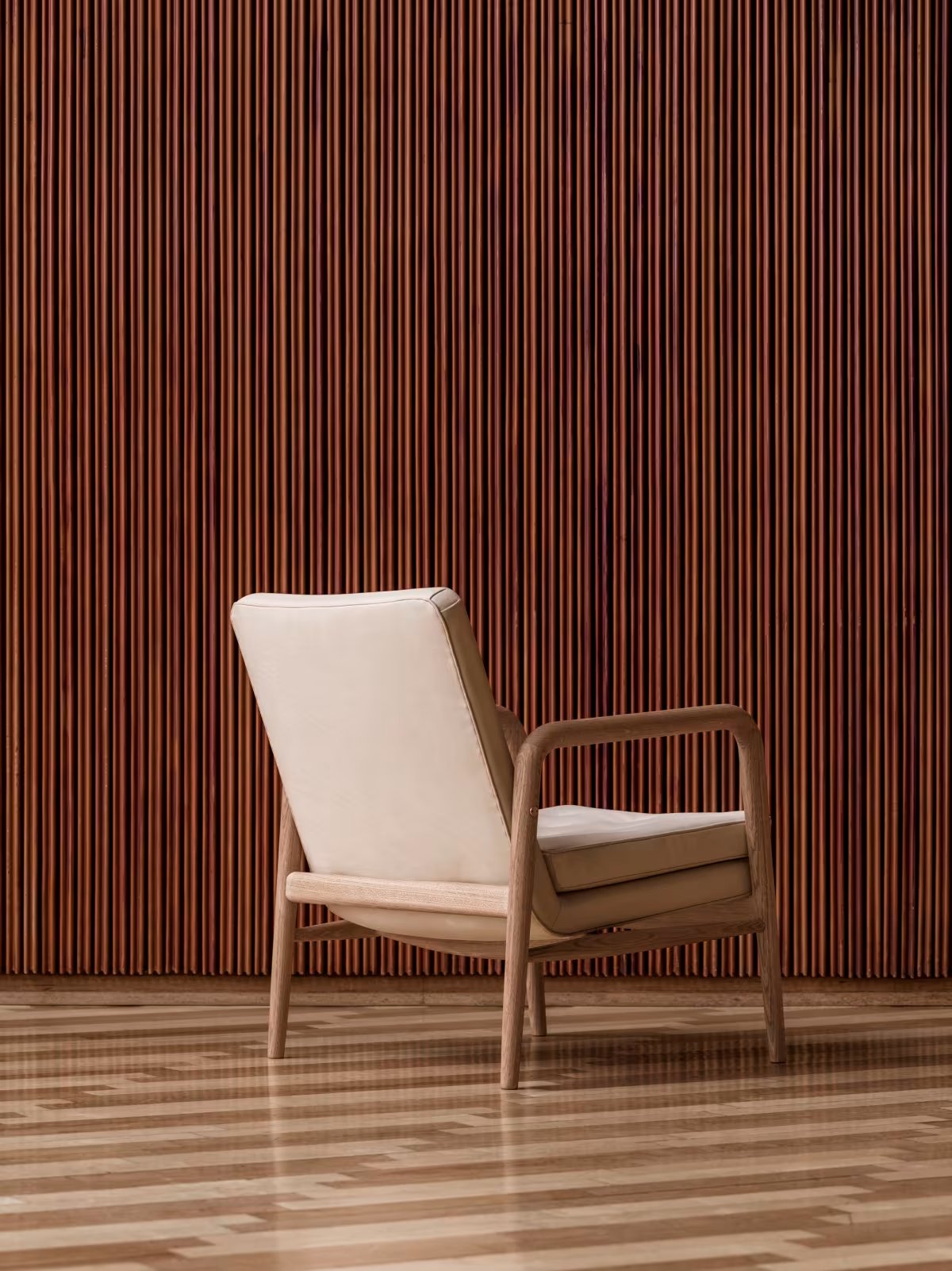 The Foyer Chair is characterized by a unique interplay between oak wood and upholstery, and the armrests are hand-polished with the utmost care to avoid the appearance of noticeable transitions. The Foyer Series was exclusively created by Vilhelm Lauritzen for Radiohuset in Copenhagen in 1945.