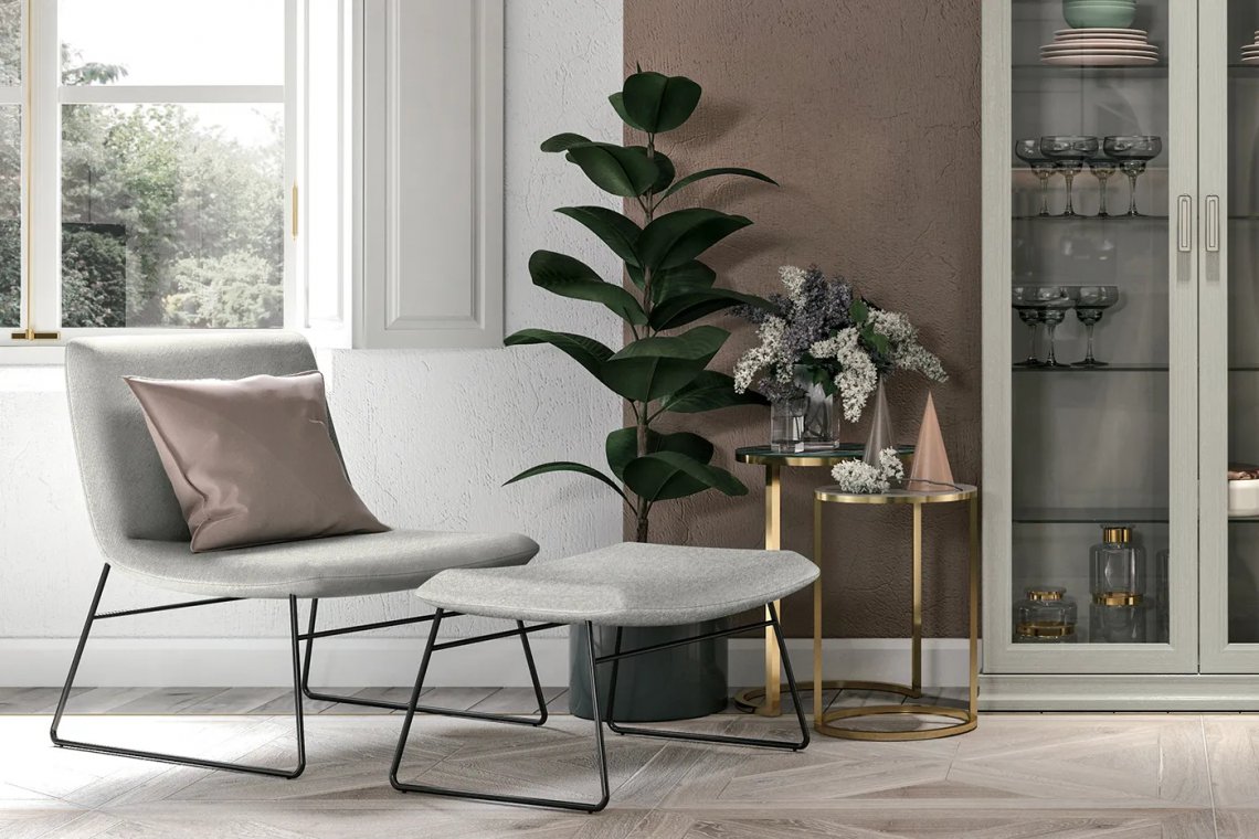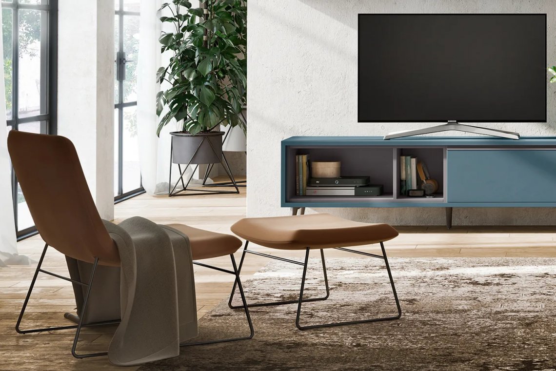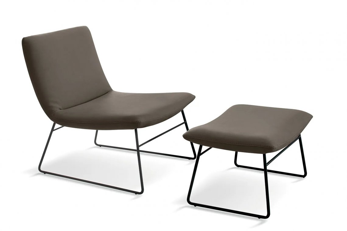 Cher is a low armchair with padded and customisable back and seat. With an innovative design thanks to two sled metal legs, it is ideal in a modern and contemporary living room. Cher can be fitted with a comfortable footrest pouffe.