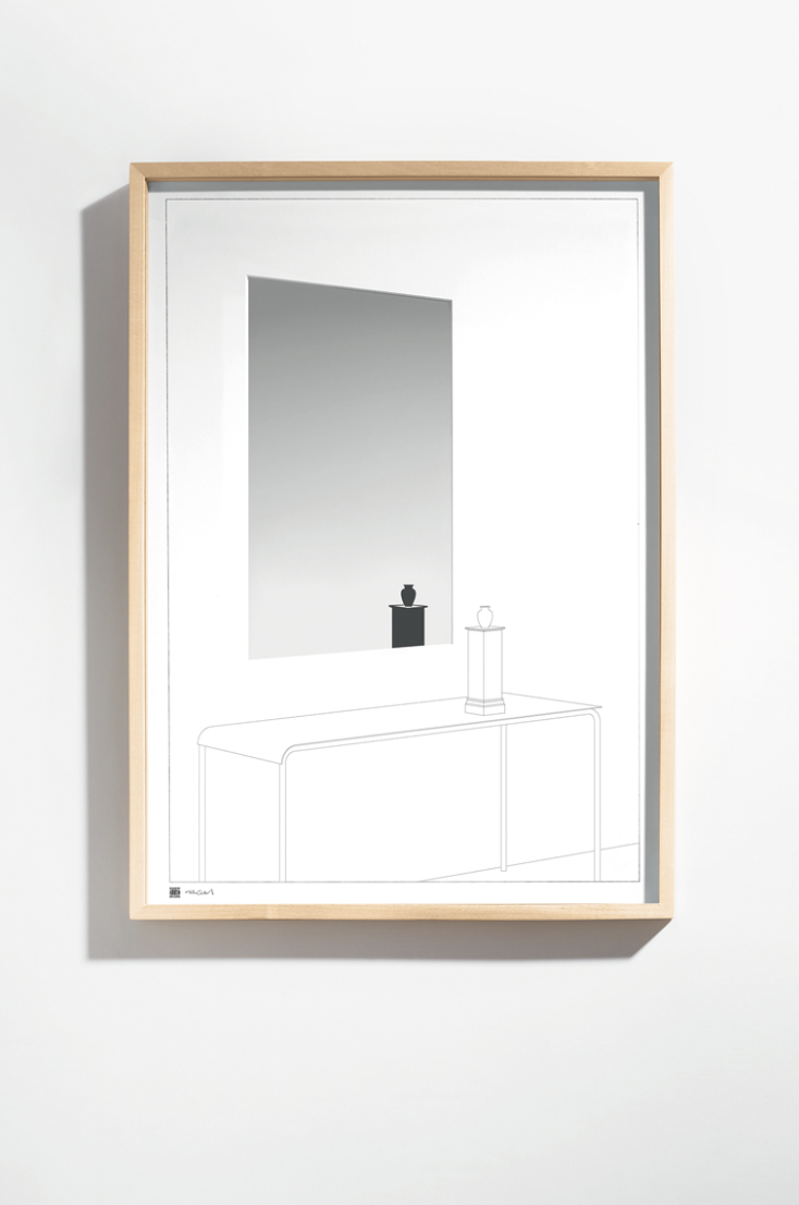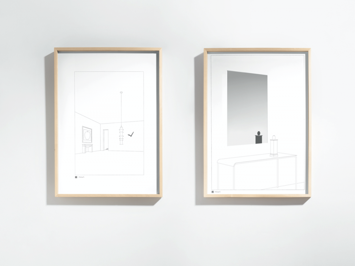 Drawing no 13 is a mirror inside a rectangular frame containing the image of a room. The result is a collage, a bizarre montage of a space that really exists.