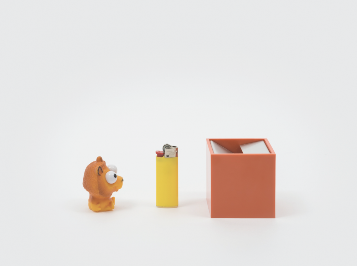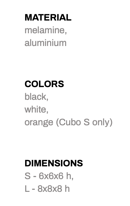 Cubo is an ashtray made up of two simple elements: a cube shaped shell open on one side contains an element made of bent sheet metal. This element is designed so that the acute angle of one end of the sheet makes the ash fall inside whilst the overlap of the other end hides the contents once inside.