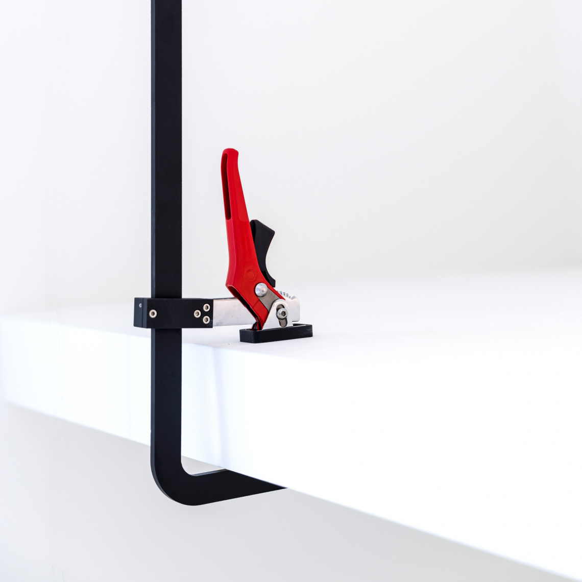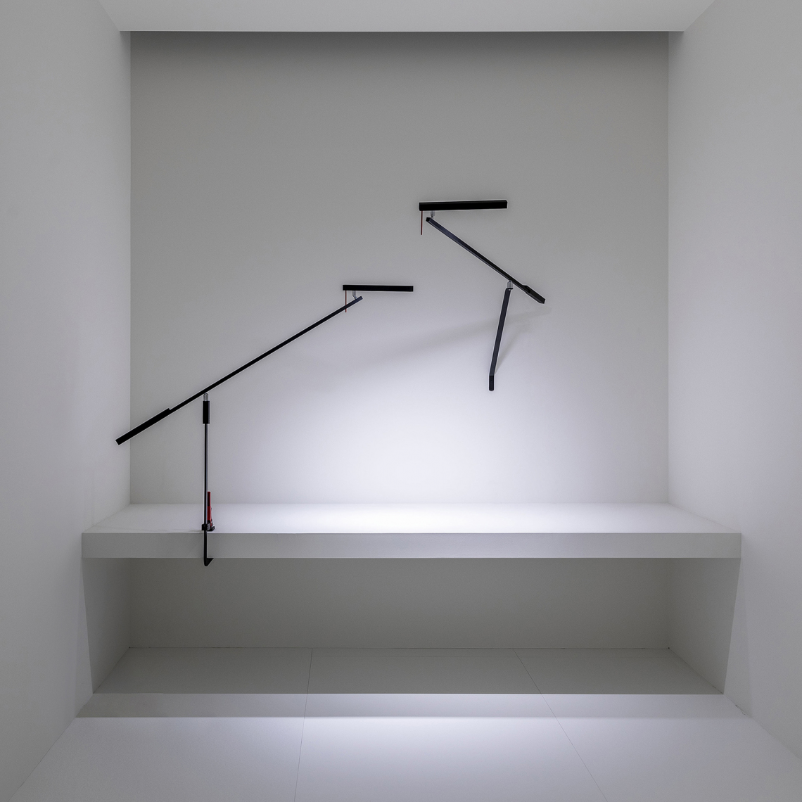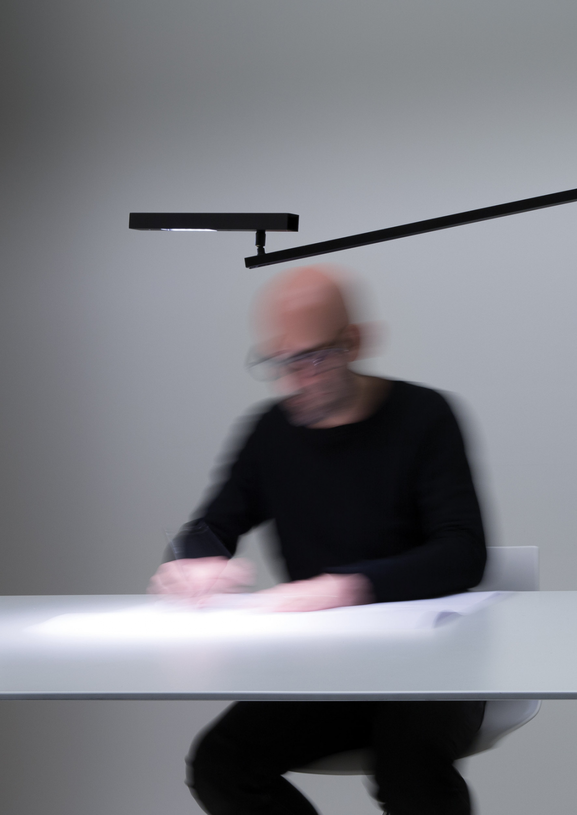 Besides being a perfect lighting tool, it is also ready-made. The oversized workshop-style clamp allows the light source to be positioned far from where the lamp is attached to the table, using three adjustable arms. A table lamp, but at the same time a very lightweight, suspended light.