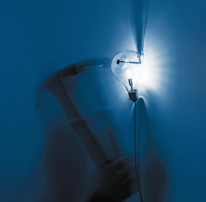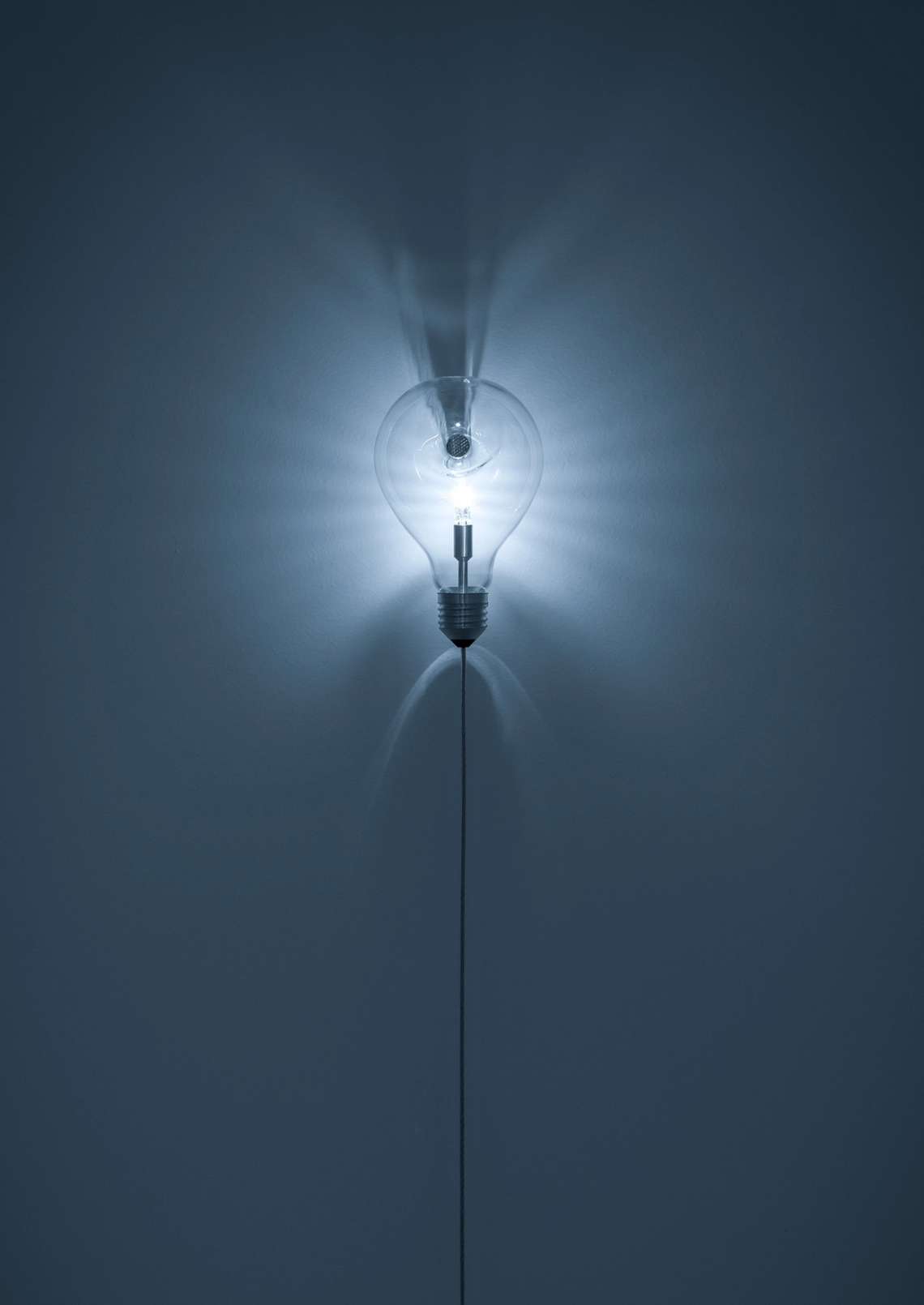 Edison’s Nightmare is a salute to Edison’s light bulb*, a dream that changed the way we live forever, stealing time to read and write from sleep. It is a classic light bulb, nailed to the wall. Like a work of art.
