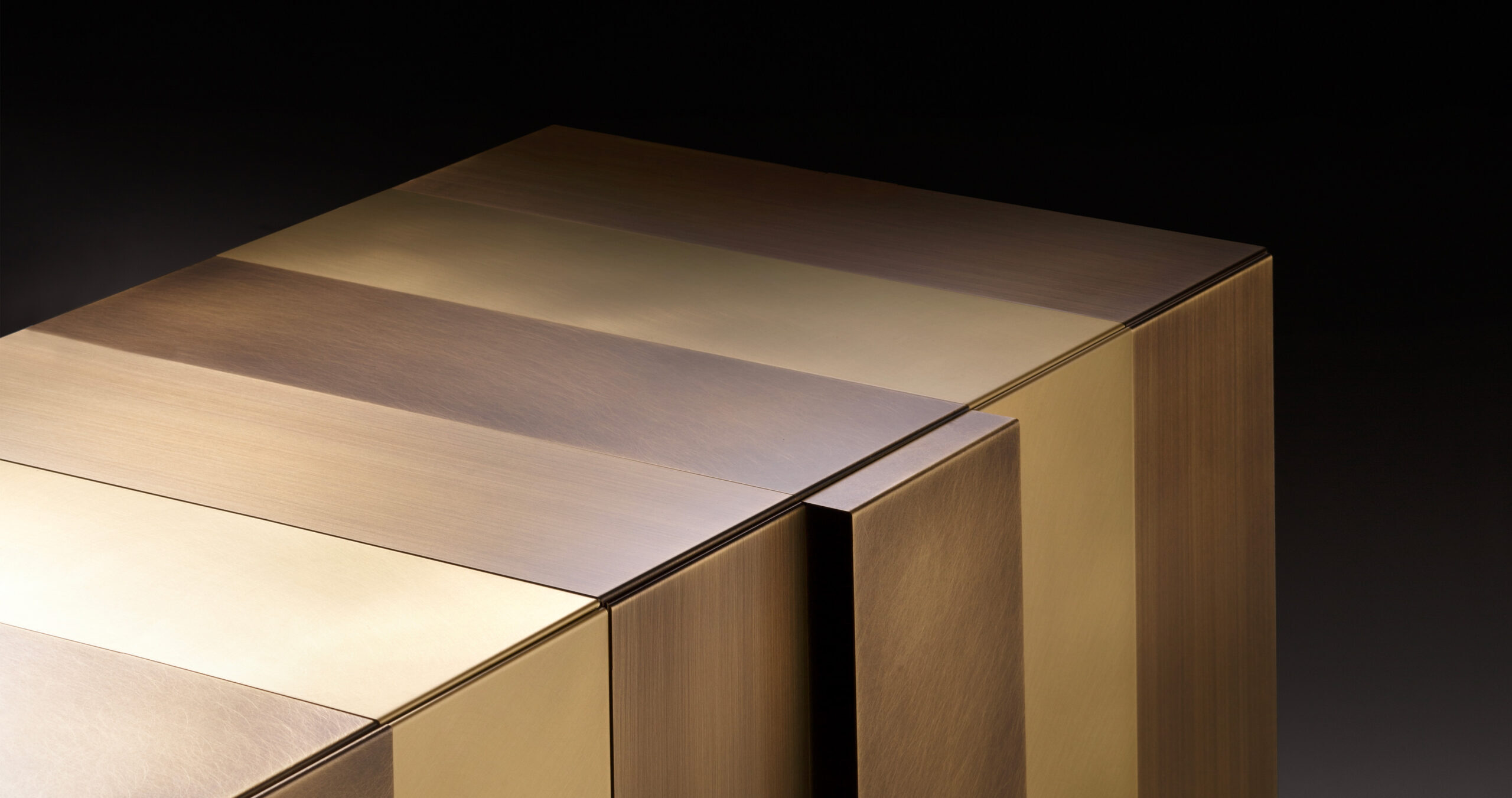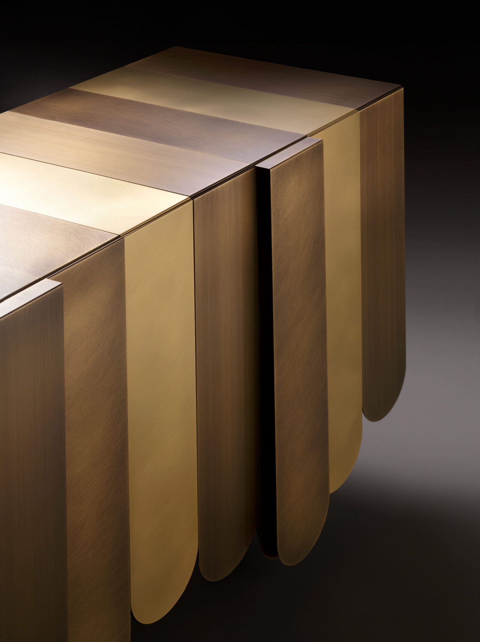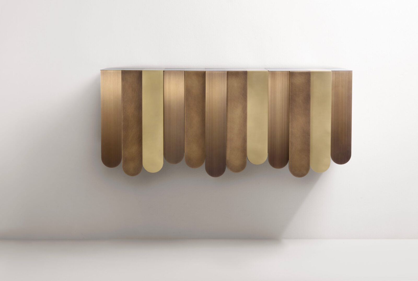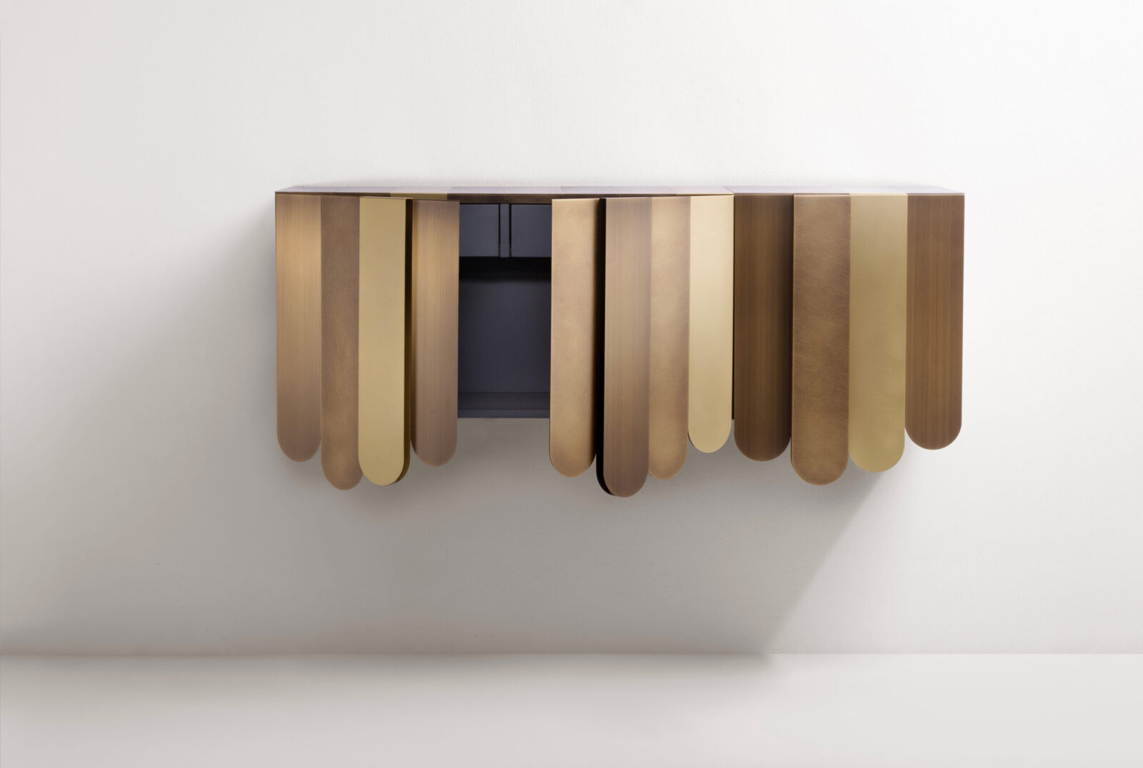 Xilo consolle è un volume scultoreo ritmato dalle diverse fasce metalliche in spessore piegato che rivestono le ante frontali e danno vita a una metaforica cascata. Accostate con irregolarità e leggermente disallineate, sono enfatizzate da diverse finiture sul metallo sviluppate da De Castelli. Le ante della consolle sospesa si aprono a 90° e danno accesso a uno spazio contenitore e a un piccolo cassetto.