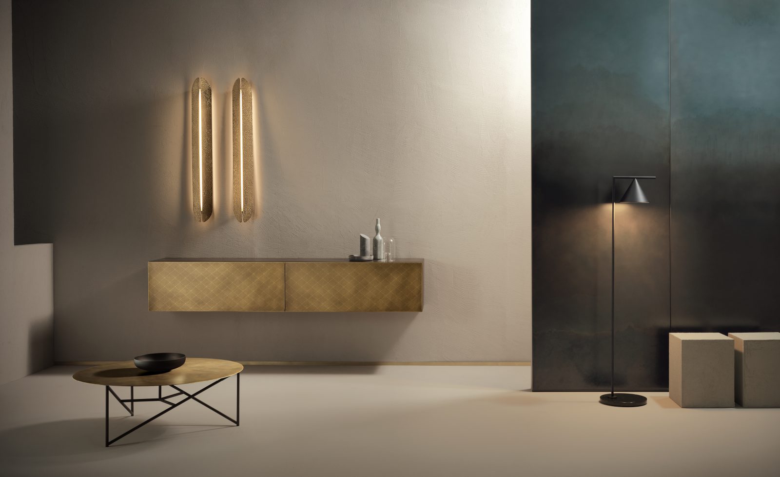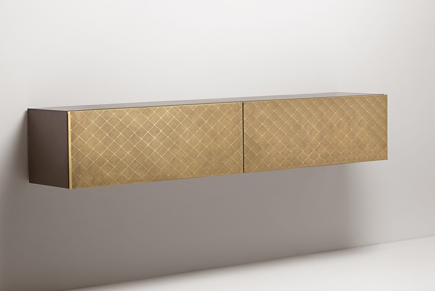 Clean volumes for a console with quite simple lines, emphasising the nobility of the metals that clad the large faces of the drawers. Available both in a hanging and free-standing version, Tako evokes the delicate decoration anointed by the DeErosion finish, for a vaguely-Japanese inspired pattern that filters light, modulating its reflections.