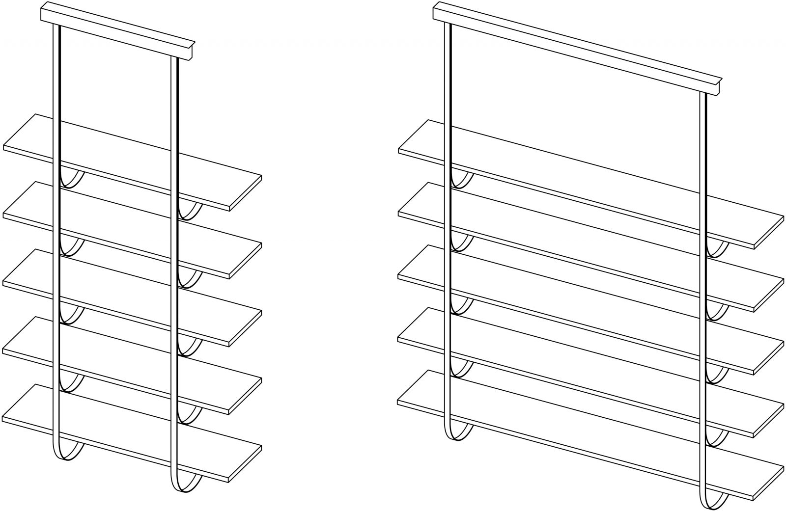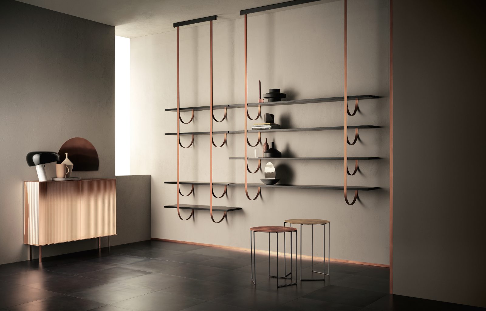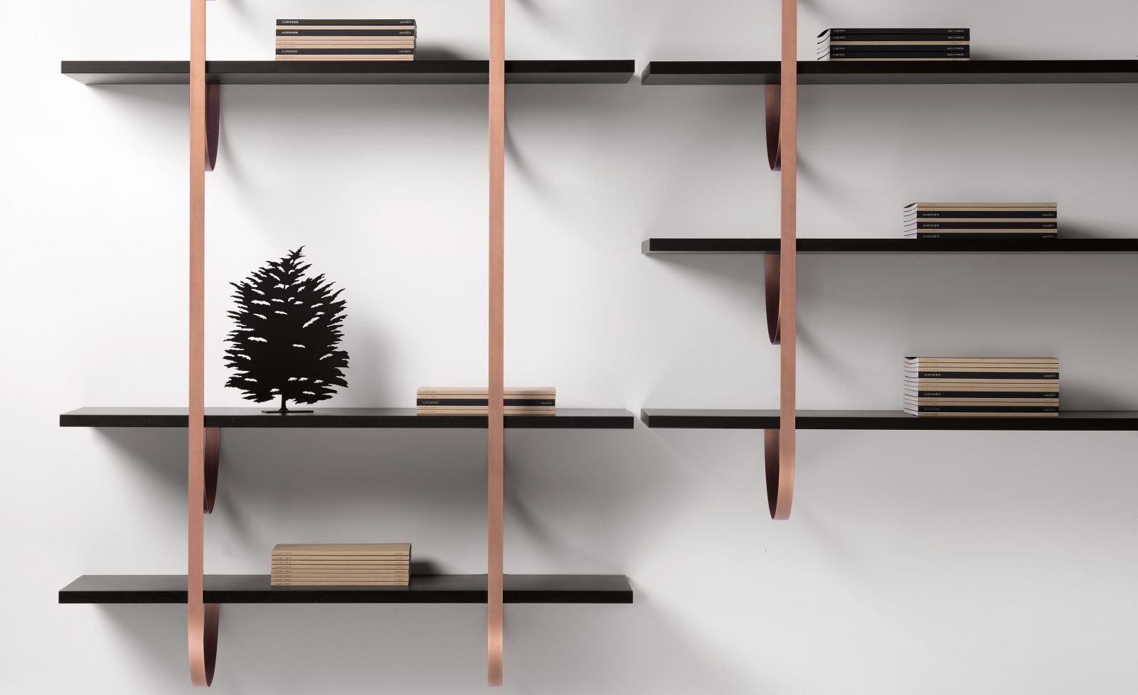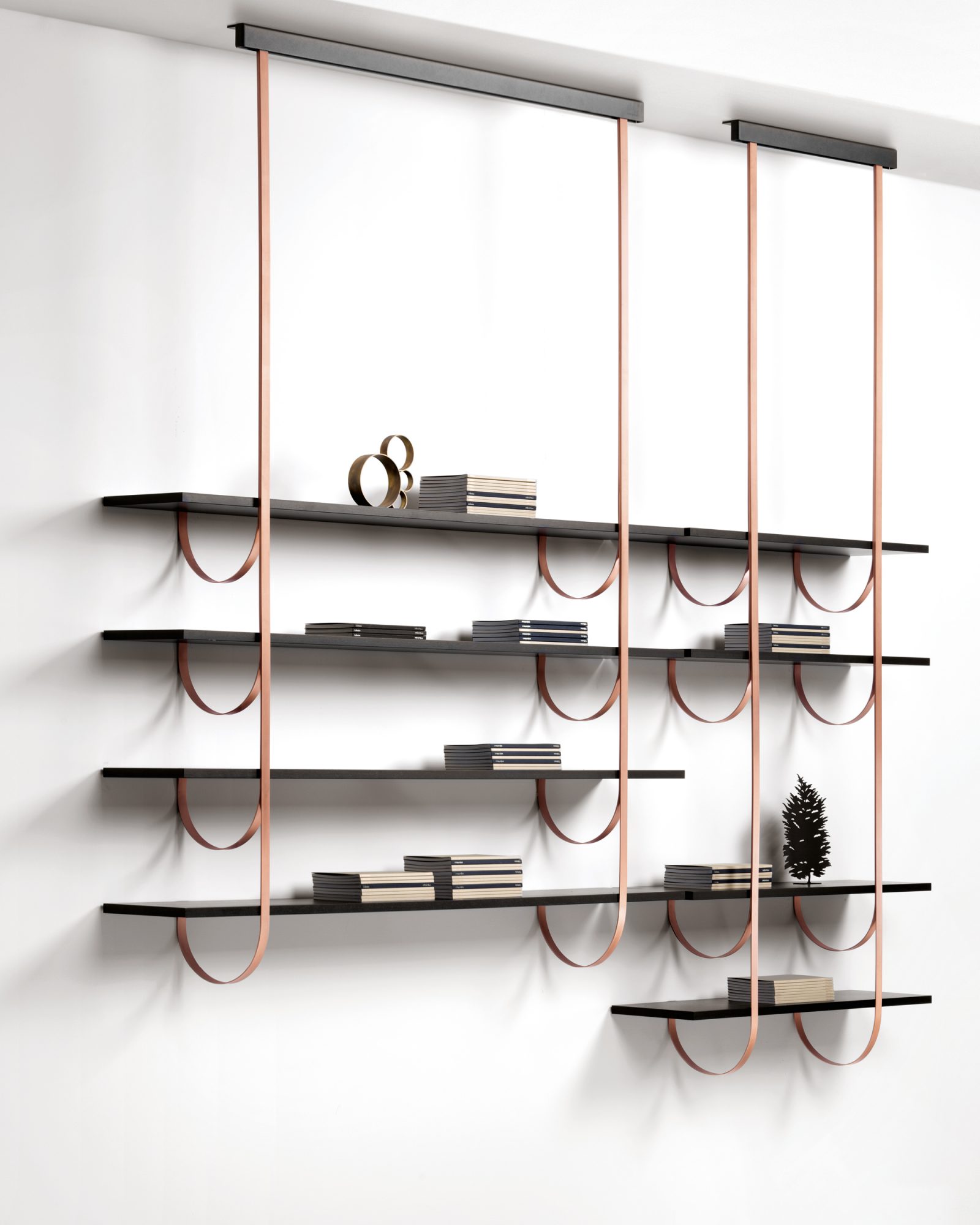 Thin perpendicular supports fall from the ceiling to be anchored to the wall in delicate curves. Like climbing vines, they create a new kind of suspended architecture. Each branch becomes a support for one or more shelves in a modular composition with clear botanical inspiration. The gaze bounces between the dark hues of the Gabon Ebony shelves and the luminous supports in brass, copper and iron, ennobled by De Castelli finishes.