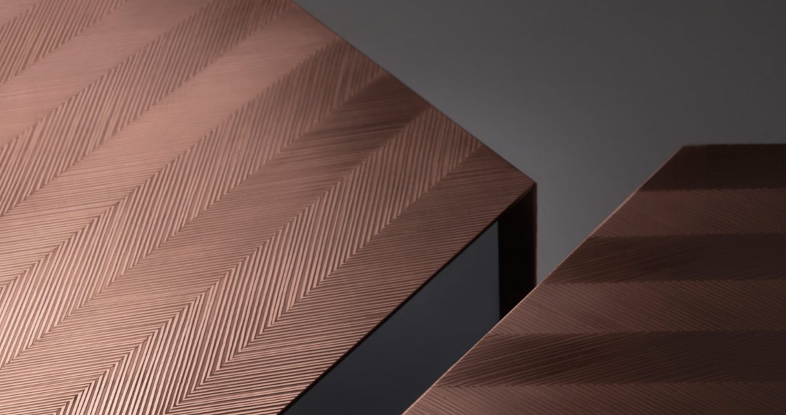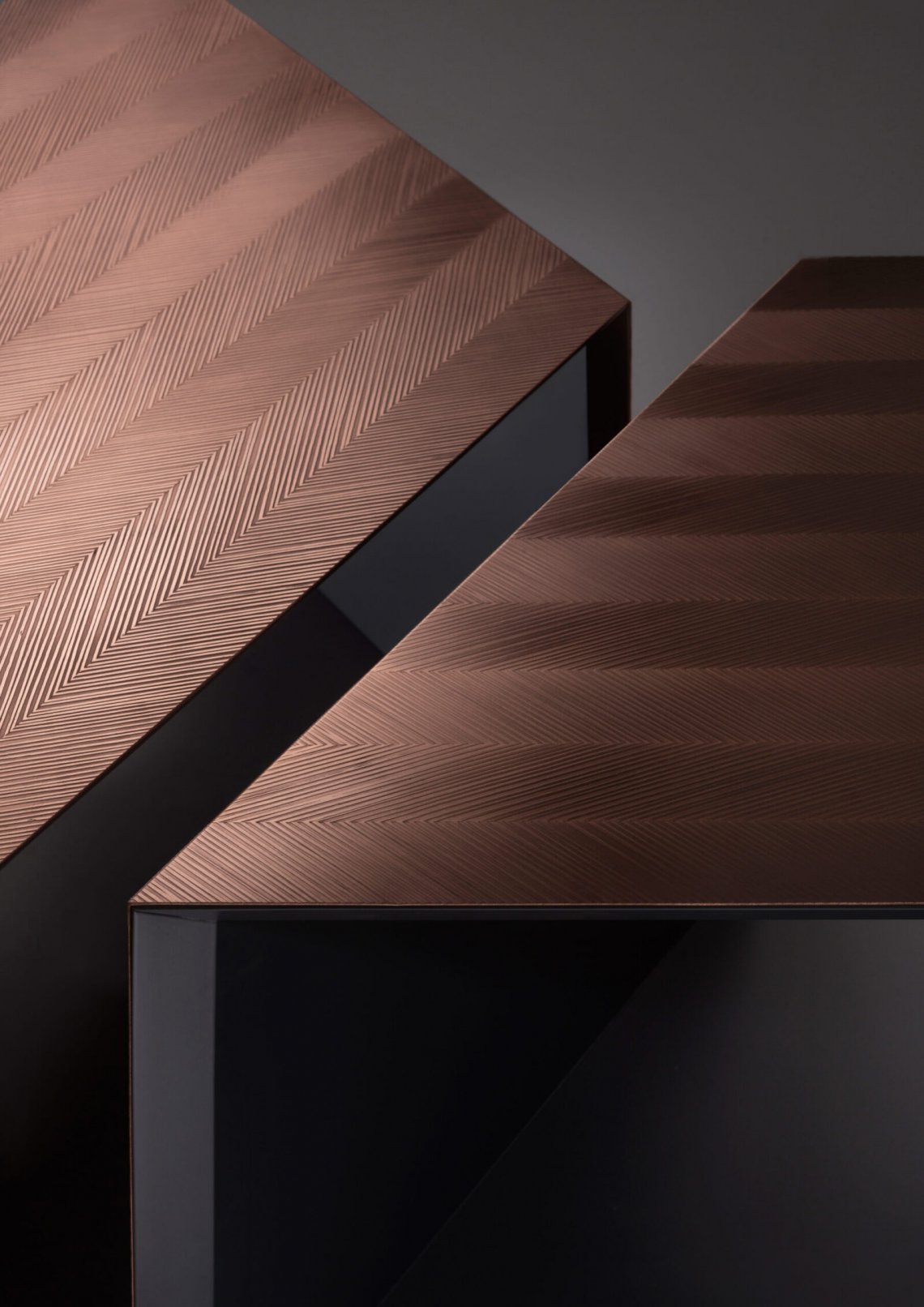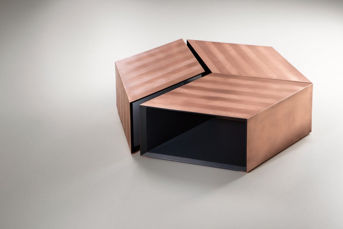 A small rhomboid-shaped table with storage space. Its simple shape renders it modular: by combining it with other identical elements, either moved around or rotated, numerous configurations can be obtained. The natural copper skin worked using the DeErosion technique creates a diagonal striped pattern that enhances the geometric shape and emphasises the graphic effect. Thanks to the measured proportions and the compositional possibilities, Alpha can fit into any environment and can be used in many different ways. The absence of surface treatment means the antibacterial properties of the copper are preserved intact.