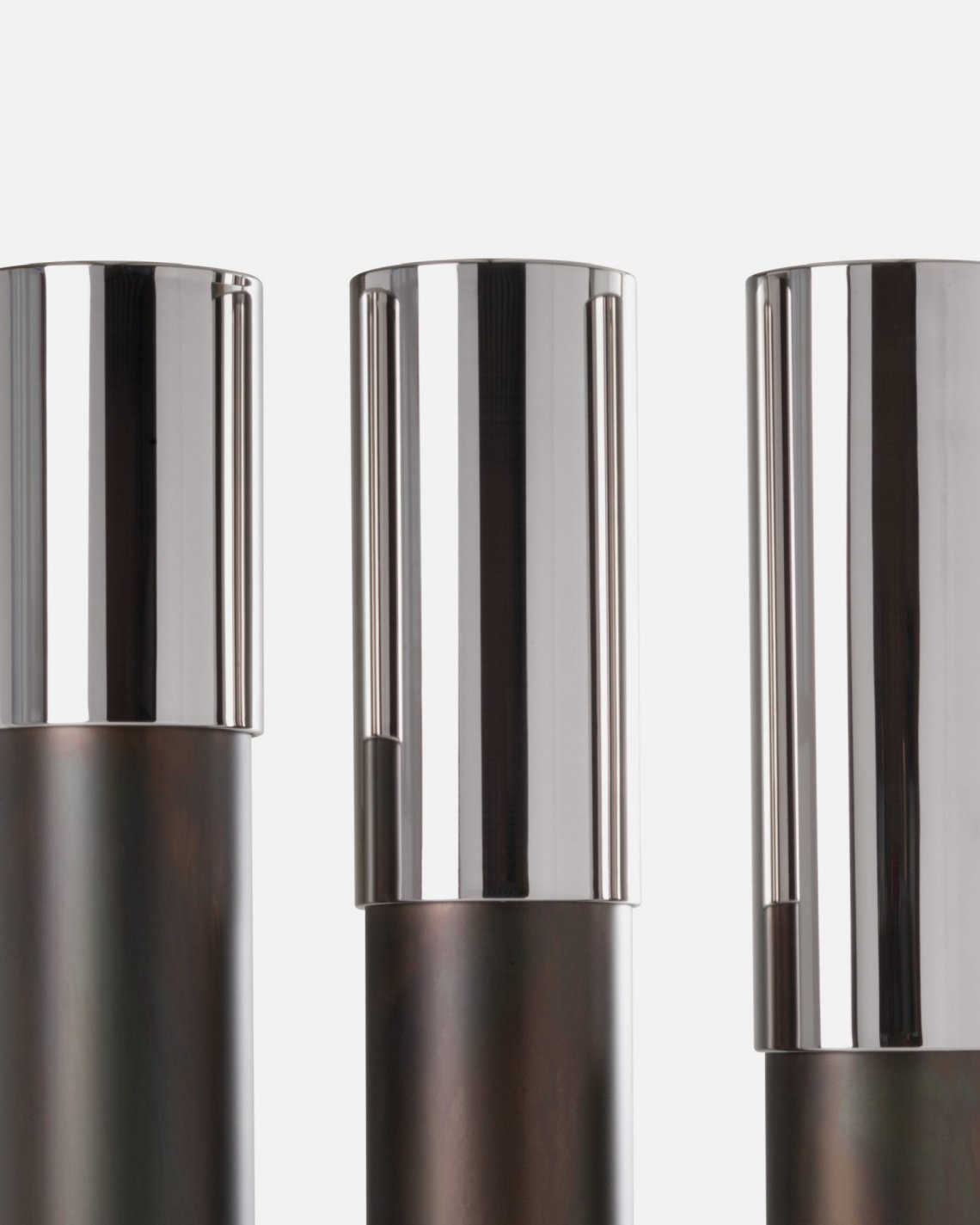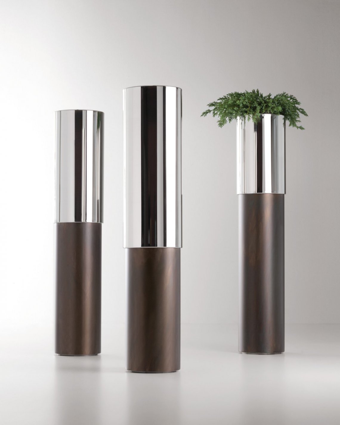 Arising from the union of DeLabré iron and shiny steel, Phil is a series of cachepots with simple lines rendered complex thanks to its unique combination of contrasting materials and finishes. Highlighting the sensory nature of its surfaces in an interplay of shiny and matt, light and dark, Phil comes in one single proportion and three variations, characterized by the triumph of one metal or the other.