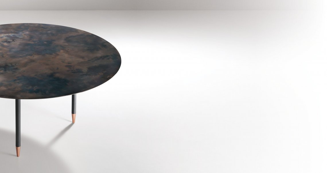 A table that interprets the round, spacious form of a brazier, which it echoes in its size and volume. A symbol of sharing and communion that references the ritual of conviviality and spending time together. The top, in generous proportions, and the lower ‘lens’ fuse into a single piece, into which three legs are inserted. The personality of this sculpture-table arrives via the iridescent finish of the top, the memory of always-glowing embers, and the luminosity of the copper feet upon which the legs rest, lightening our perception of the whole.