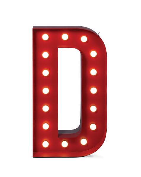 Las Vegas calling? Then you're set on the letter D. D for delight, dynamic, dreamer. Go for D if you an instant splash of the vibrant Las Vegas feeling into your modern home decor. With 16 bulbs and colour customizable, this marquee letter will take your breath away with the glamorous touch of stainless steel. With 100 x 56 x 20 cm and 39.4 x 22 x 7.9, this graphic letter can be placed on the floor or on a wall.