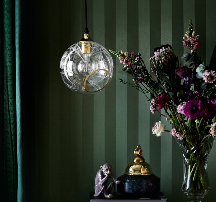 The Ballroom pendant is simple and excellent. The classic shape combined with the gold plated suspension makes this lamp timeless. The glass dome is mouthblown and faceted. The edge of the hole is gold.