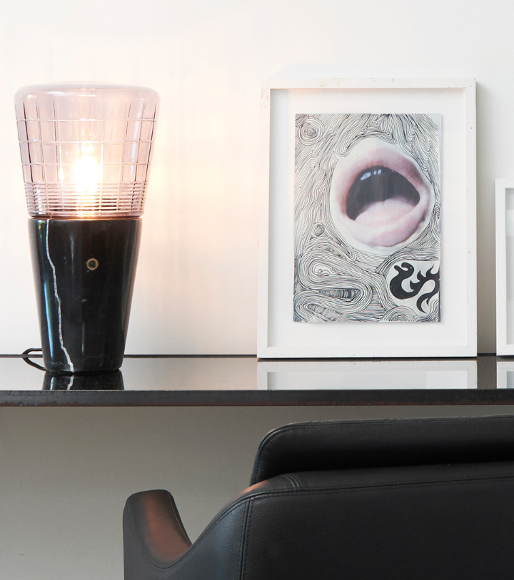 The Blender table lamp has an industrial and masculine look. It is made of black smooth marble and smoked faceted glass.