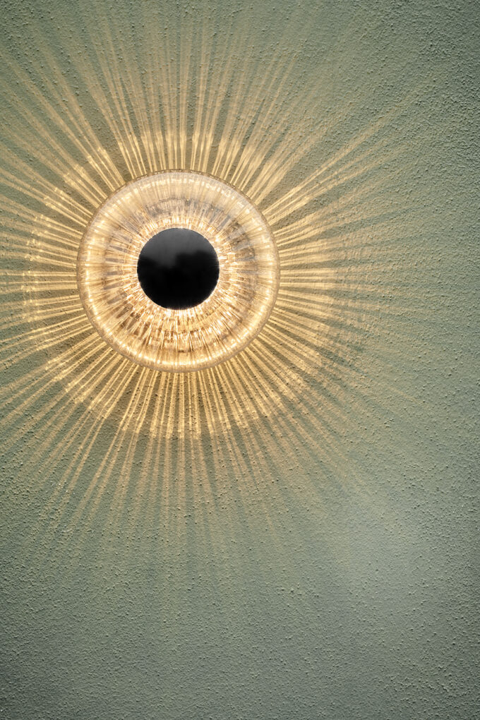 Why keep all the great lamps indoor? The iconic New Wave Optic Wall Lamp is now available in an outdoor version too. The mouth blown wavy glass will work its wonders by creating an illuminating experience on any outdoor wall.