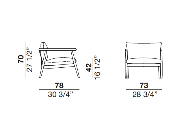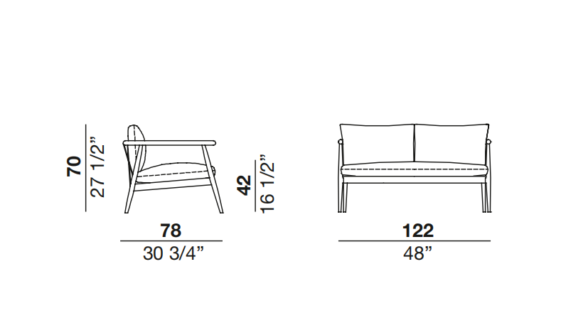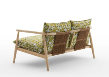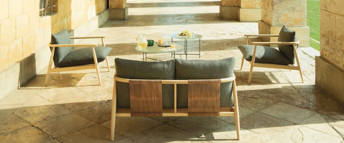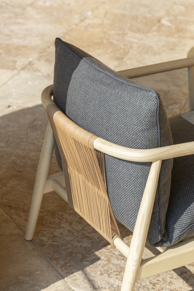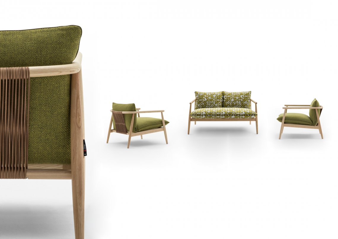 Karin's oriental flavor is present in the sign of the sofa and armchair that make up the collection. The lines are sober, the rounded processing of the ash wood and the backrest in woven natural leather cord make this project extremely elegant and refined.The Karin sofa and easy chair can also be used on a patio or covered terrace, as they are protected from the weather by fabrics from Rubelli’s exclusive Vibrazioni collection in technical fibres resistant to fading caused by sunlight. Vibrazioni is the name of a collection of fabrics featuring outstanding, compact weaves reminiscent of hand-woven cloth, where irregular tweeds play on refined contrasts and harmony and disarranged geometry and patterns create contemporary jacquard.
