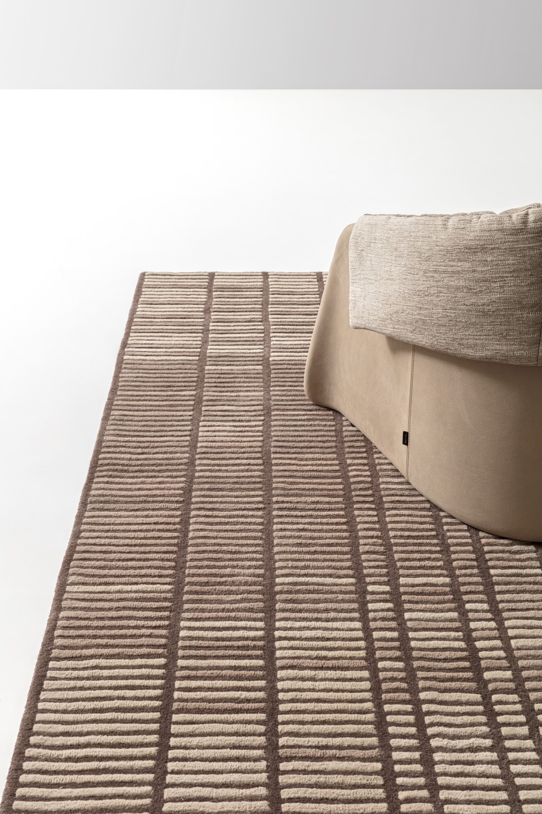 Dalla vibrazione di una traccia musicale alla sua trascrizione grafica, morbida e materica. Il disegno dai toni neutri di Hertz è enfatizzato dalla lavorazione della lana, che conferisce al tappeto un caratteristico effetto tridimensionale.