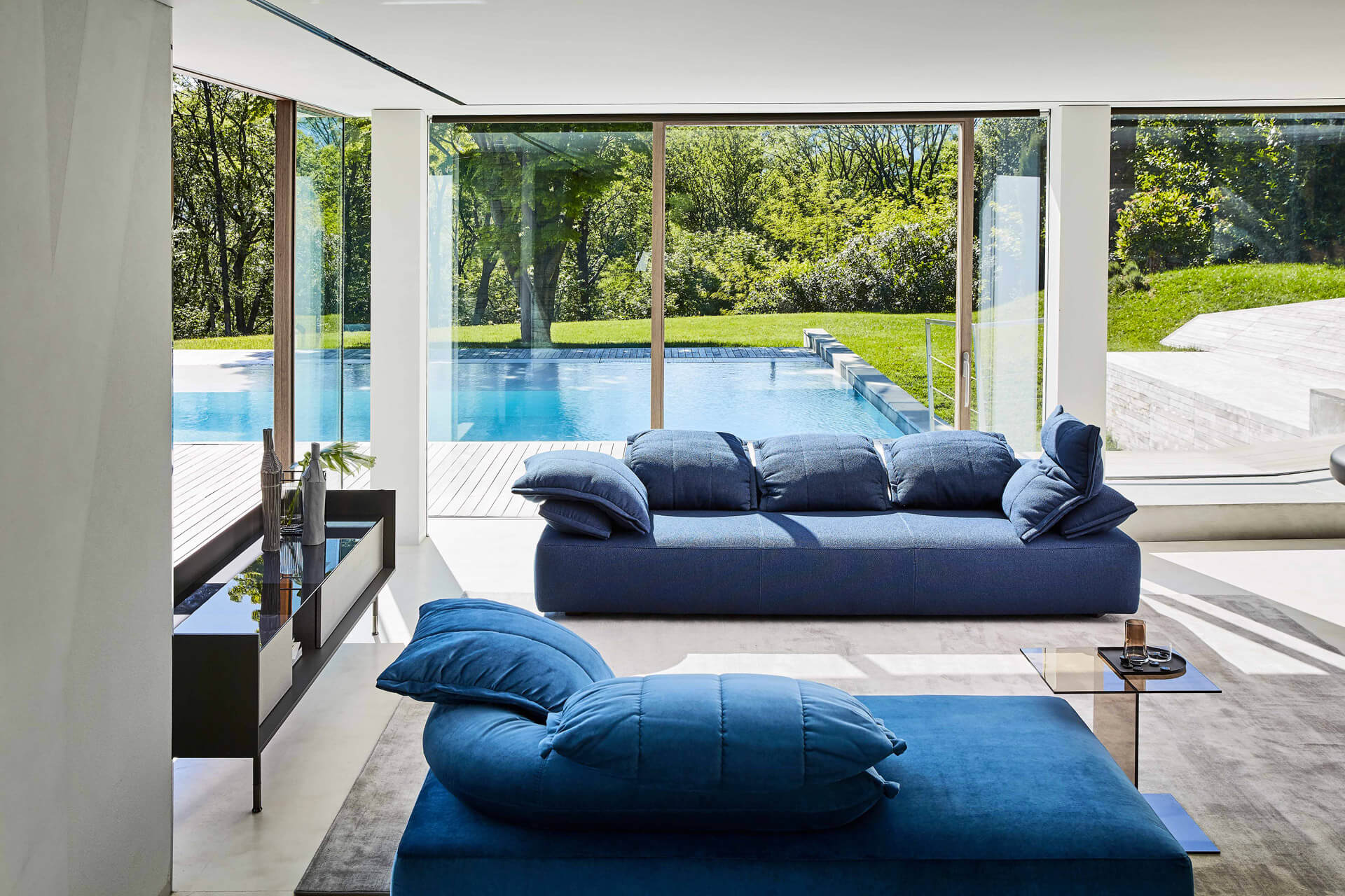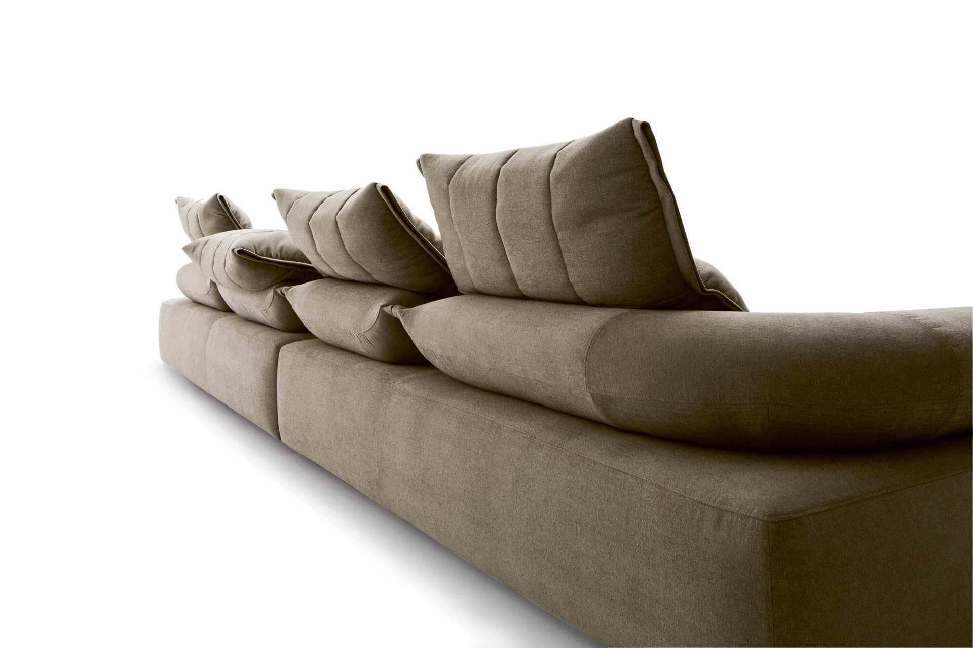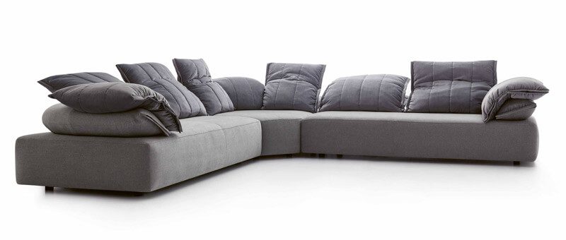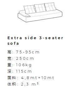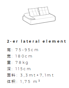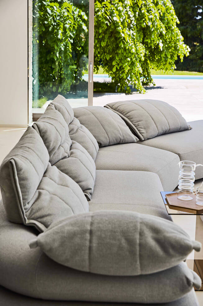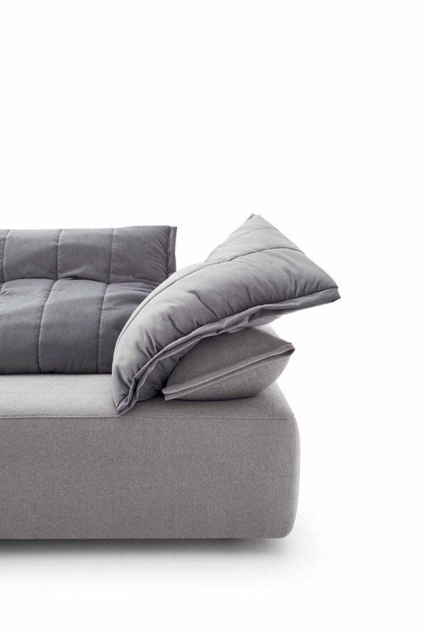 坐墊迭加及一張沙發床。邊緣細節提升了織物的視覺感及觸覺感。靜音機械裝置可以升起所有坐墊便于完全放松身體,不對稱模塊肯定了設計的當代視覺感,可以放置于超大空間內及客廳中心。