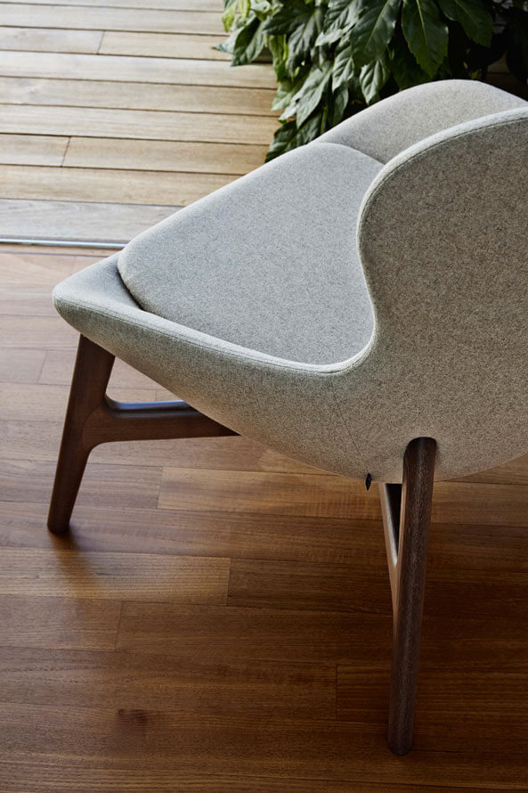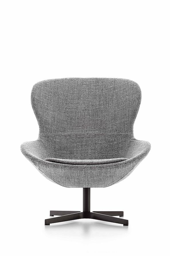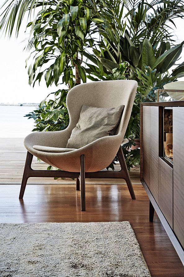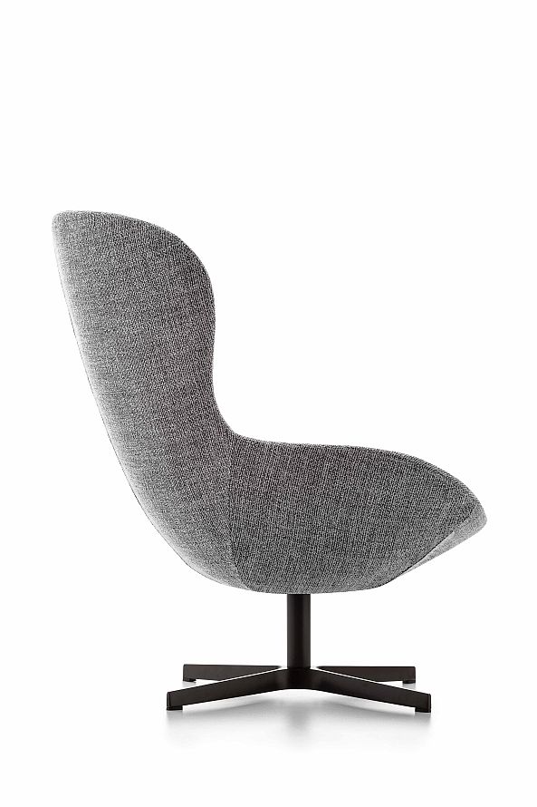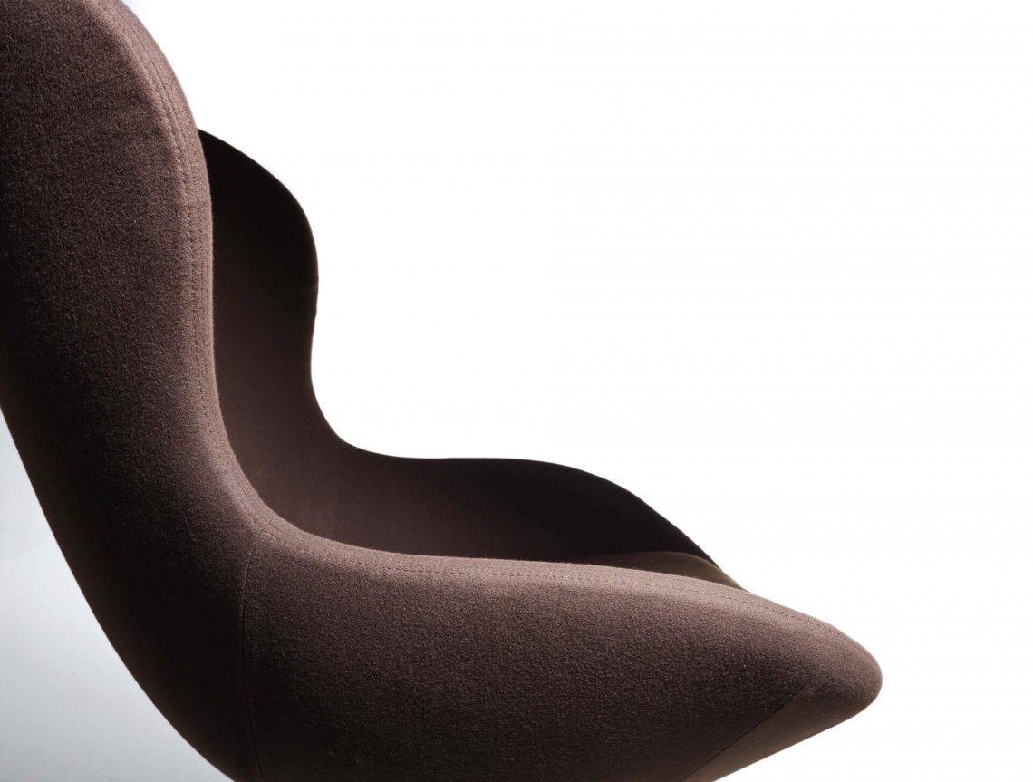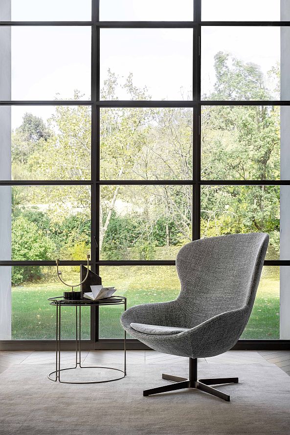 The Round chair has a wraparound shape with imposing but extremely well-balanced proportions that give it a very cosy appeal. It is available leather or fabric upholstered or in the special mixed version featuring fabric and leather together.