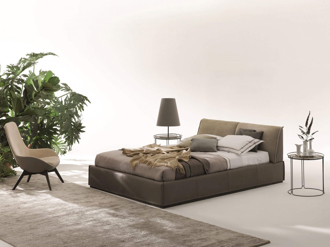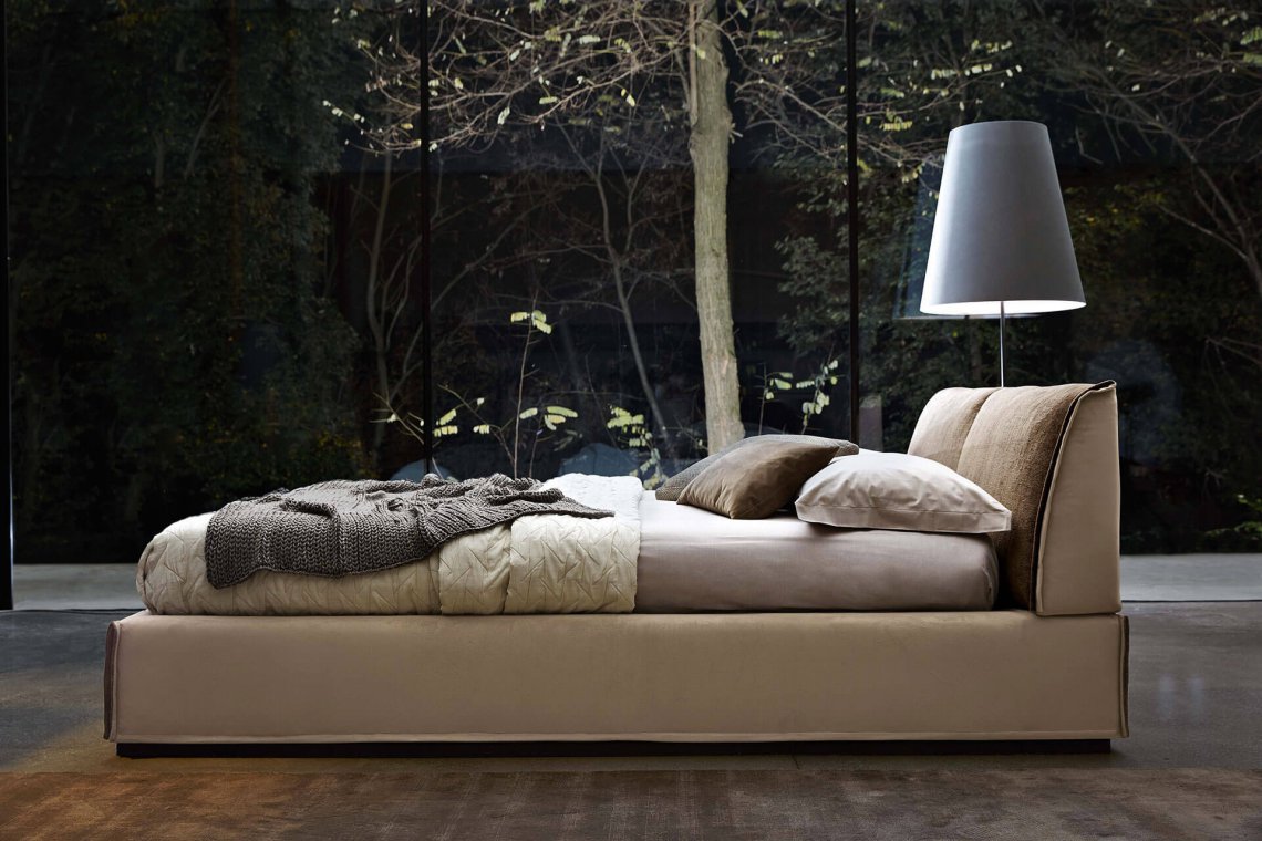 Monolith è un letto che regala un design minimale ed eleganti finiture, grazie ai suoi rivestimenti realizzati con cura sartoriale e impreziositi dai particolari “soffietti” personalizzabili, su giroletto e su testiera.
