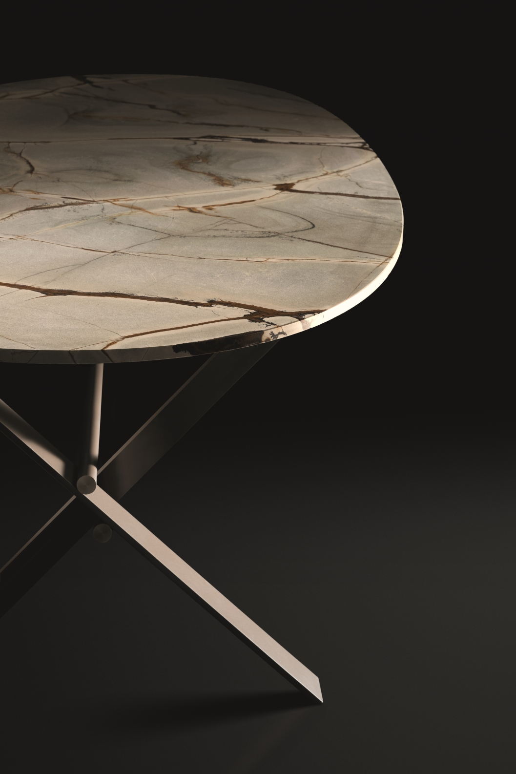 Segno iconico e primordiale, l’incrocio a X caratterizza il tavolo e la consolle XCS. Due fianchi disegnati dall’accostamento di piatti metallici sottili ed inclinati, collegati da una trave longitudinale a doppio tubo circolare. Una struttura dal disegno forte, esaltata da dettagli e finiture ricercate, che sorregge piani di varie dimensioni e forme, in legno, vetro o pietra naturale.