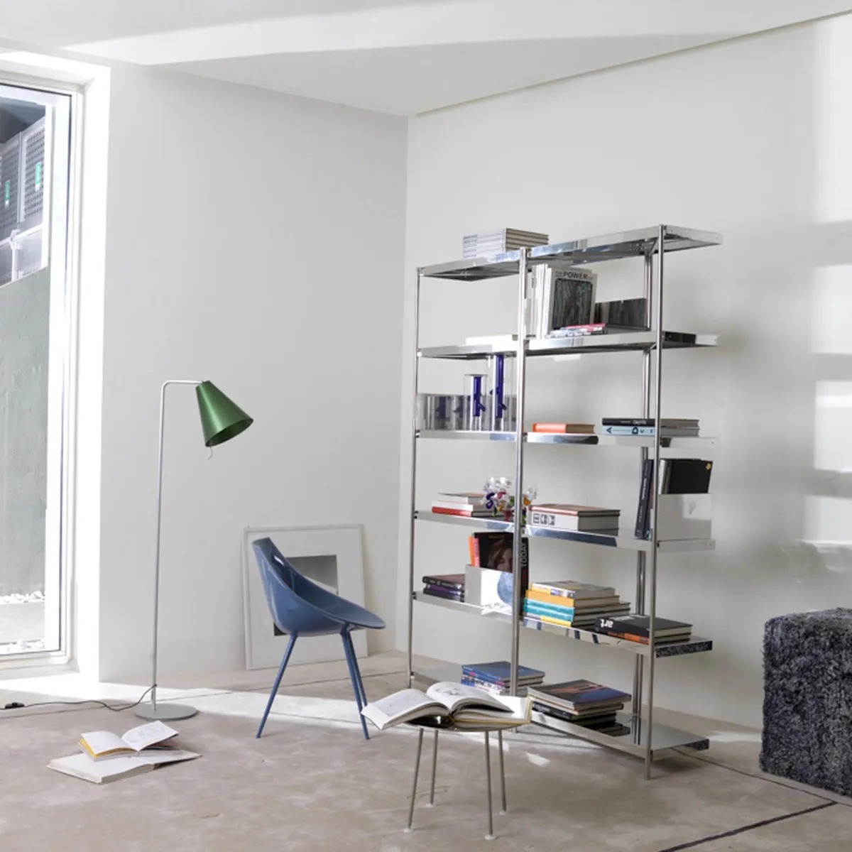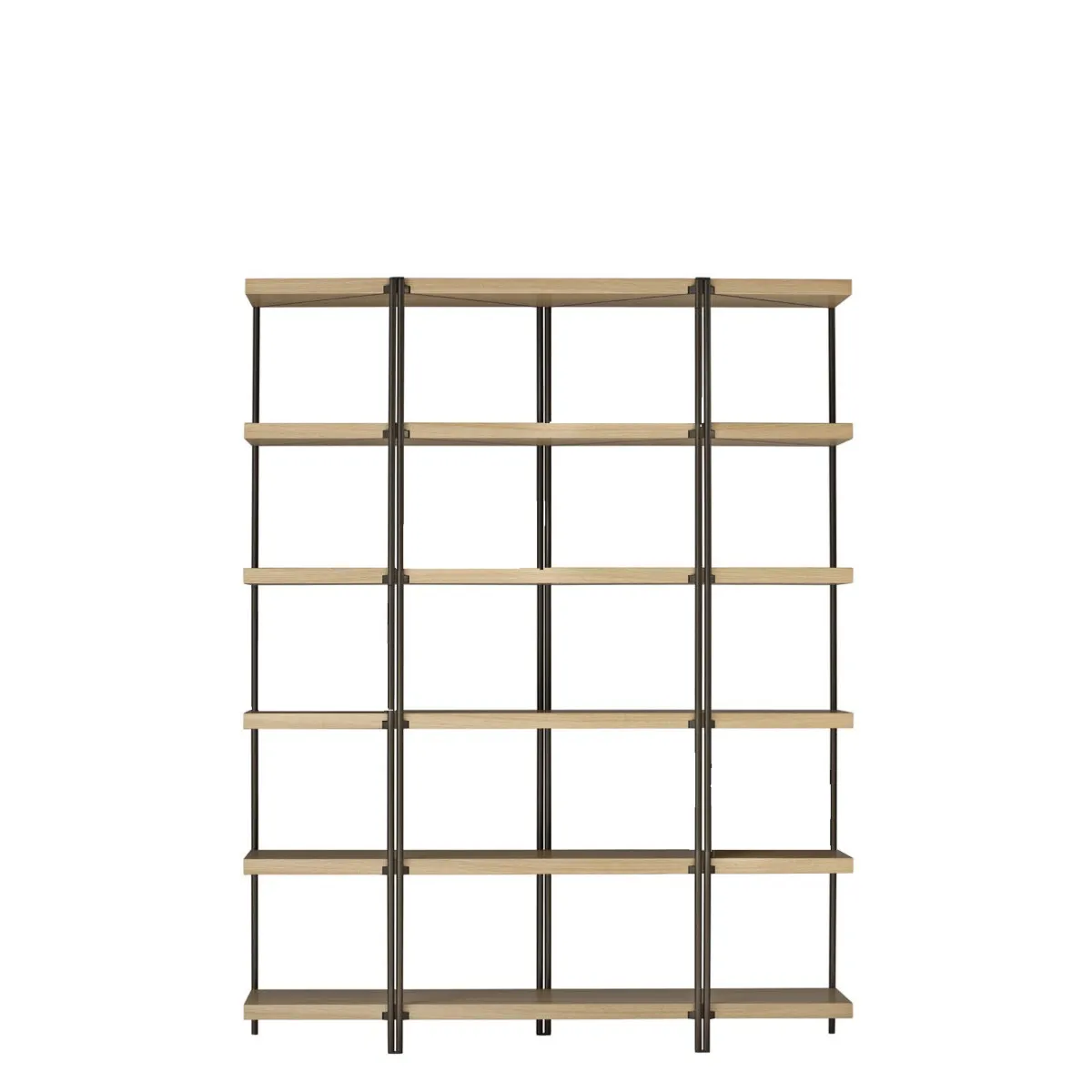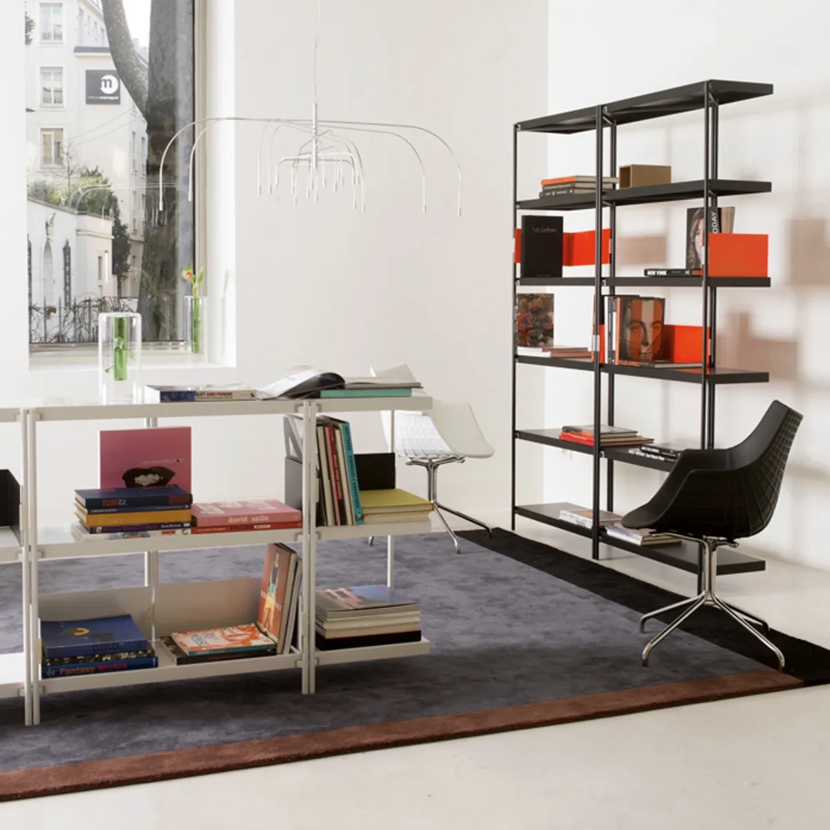 La struttura a zig-zag dello scaffale è semplice e fresca; la paletta di colori per le parti metalliche - nero, bianco, bronzo e acciaio lucido - è completata da due tipologie di ripiani in legno, in quercia e in noce americano. I fermalibri a clip sono disponibili negli stessi colori delle altre parti metalliche, oppure con la stessa finitura del legno dei ripiani. Un’ulteriore tonalità in arancio fluorescente arricchisce l’offerta dei segnalibri. Zigzag è disponibile in due diverse altezze, e si assembla senza l’aiuto di attrezzi.
