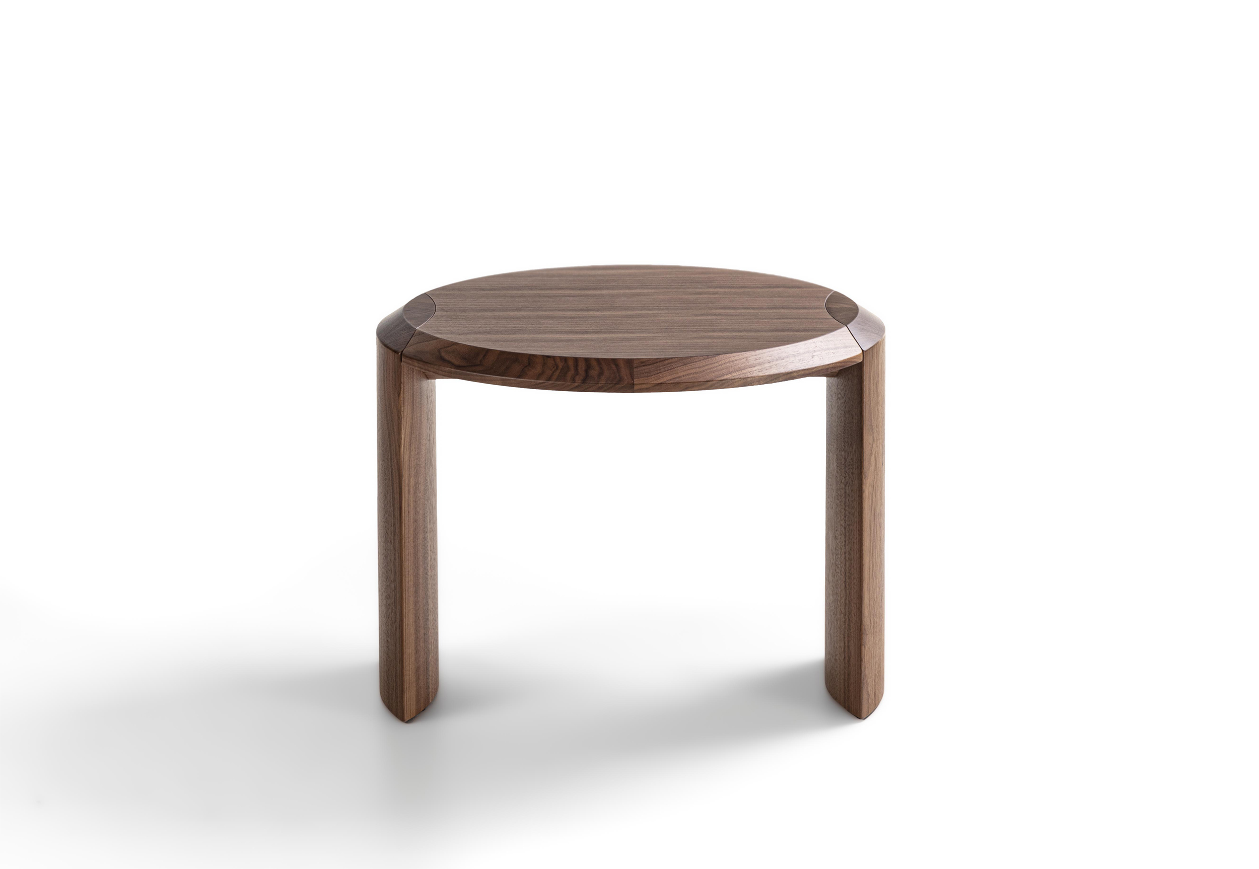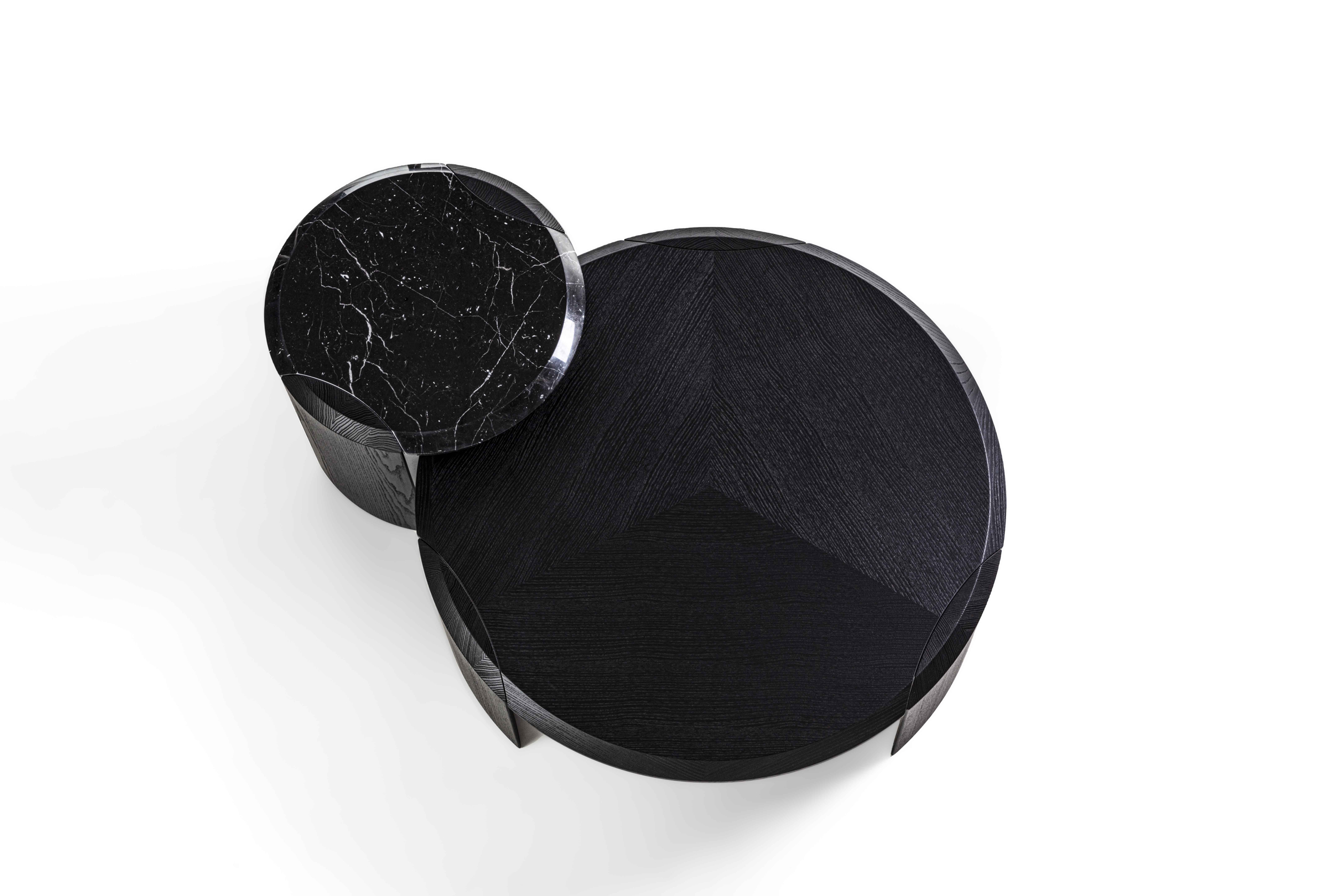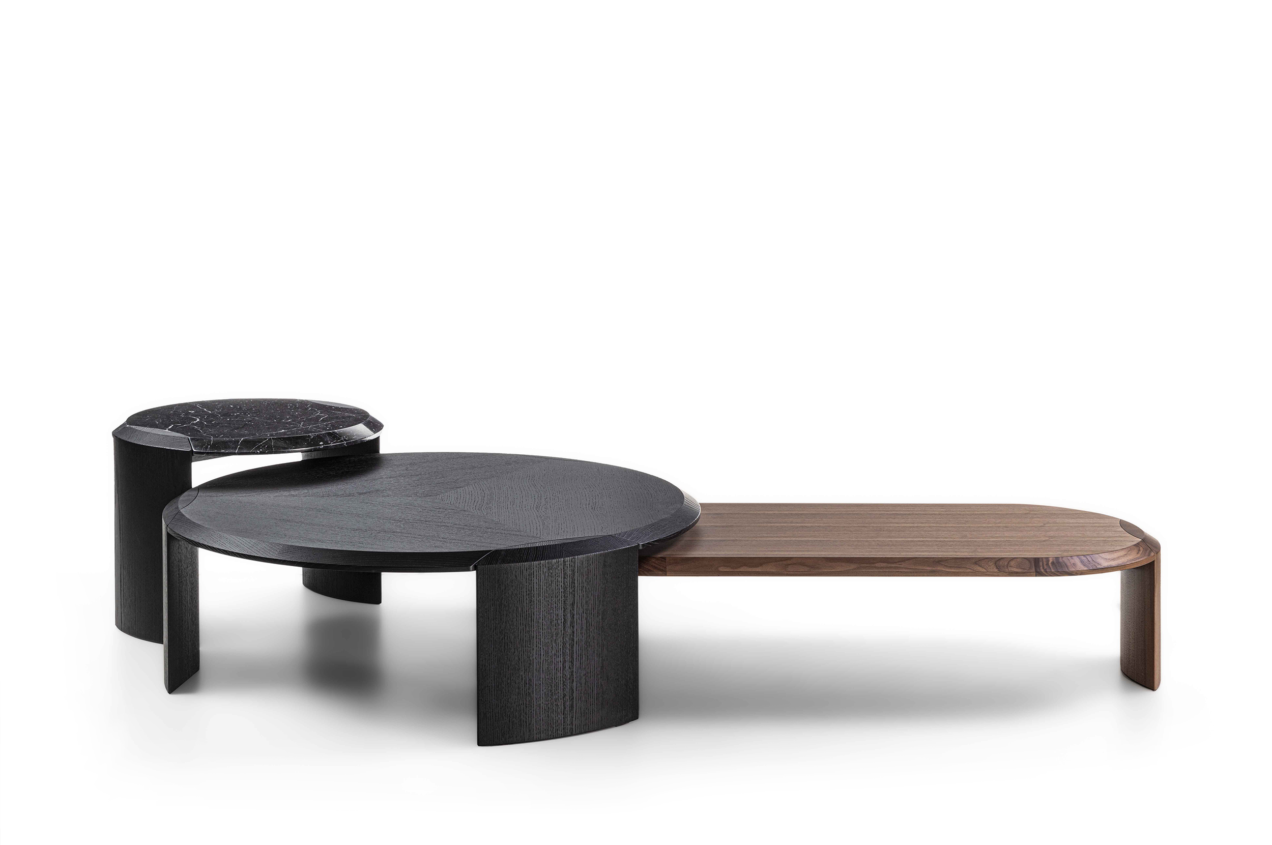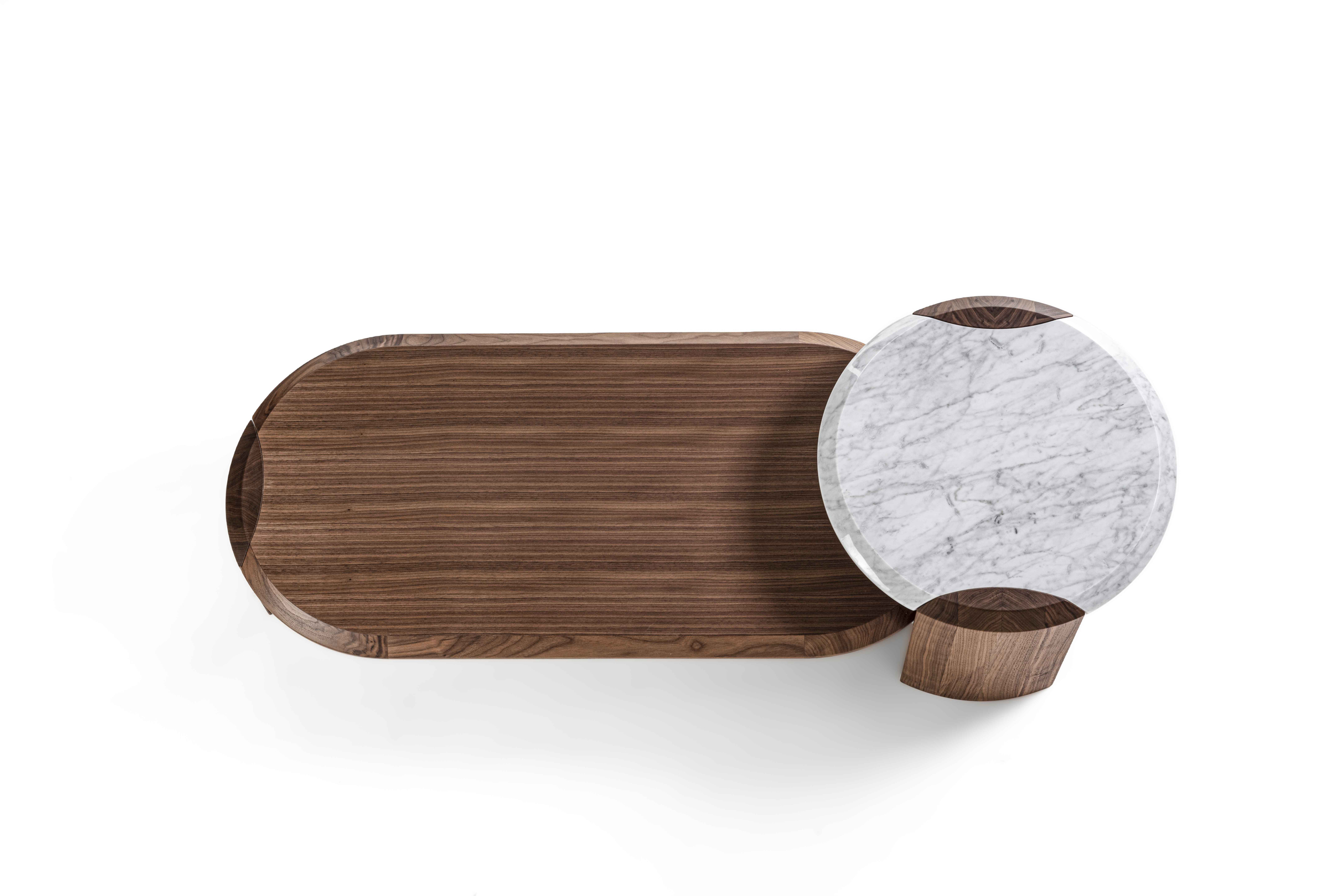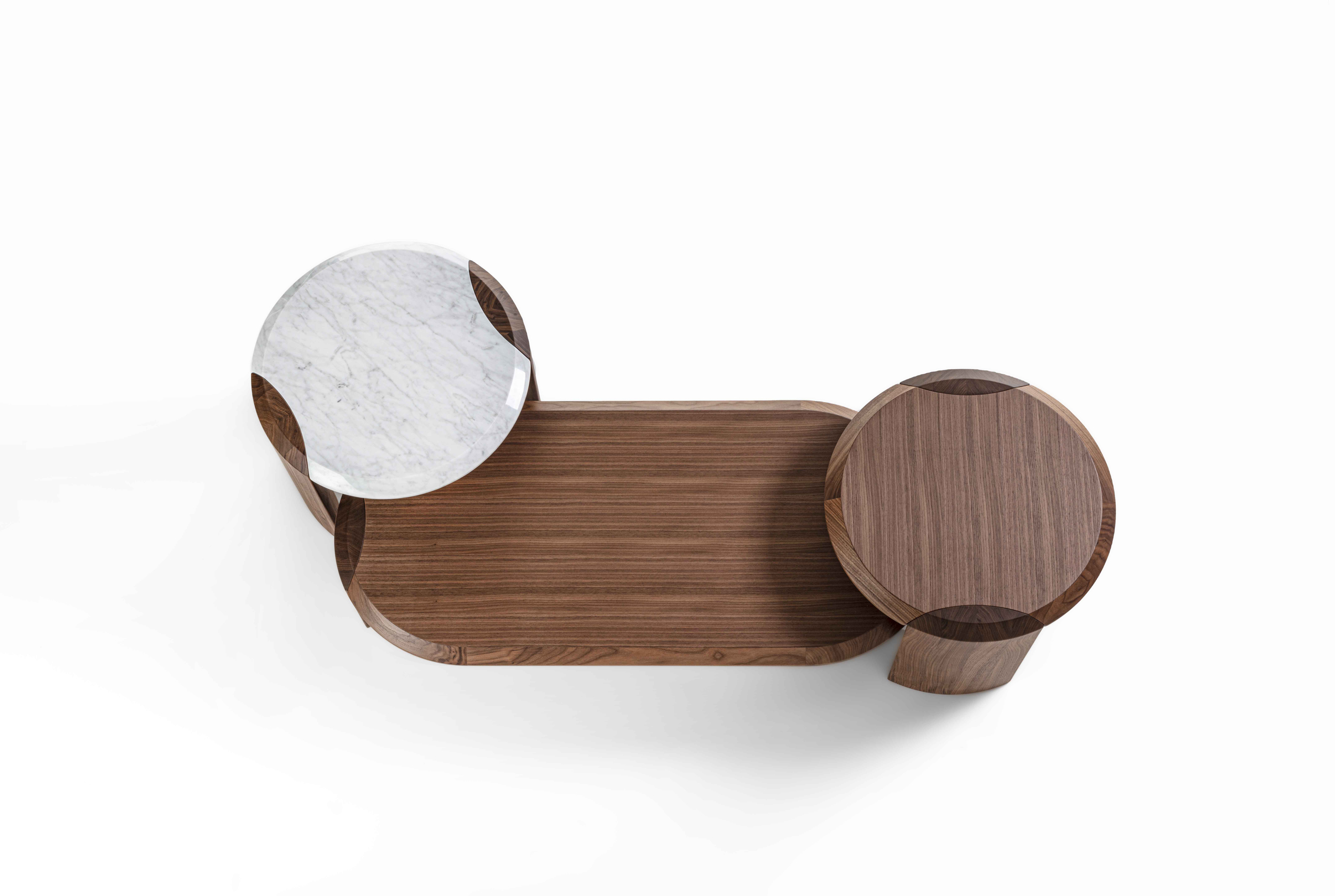 Family of nesting coffee tables of various shapes and finishes, characterized by an elegant joint between the wooden legs and the wooden or marble top.
