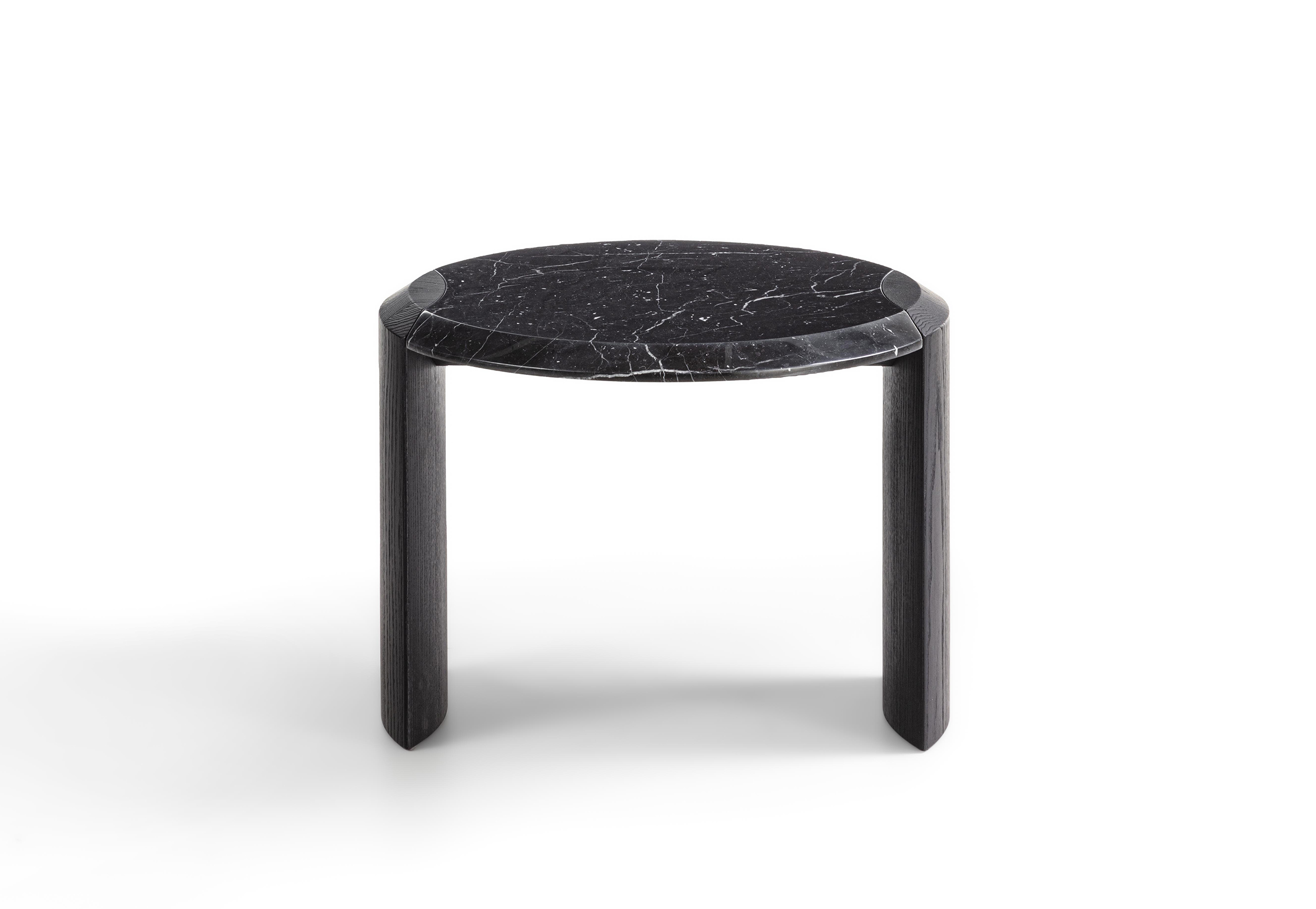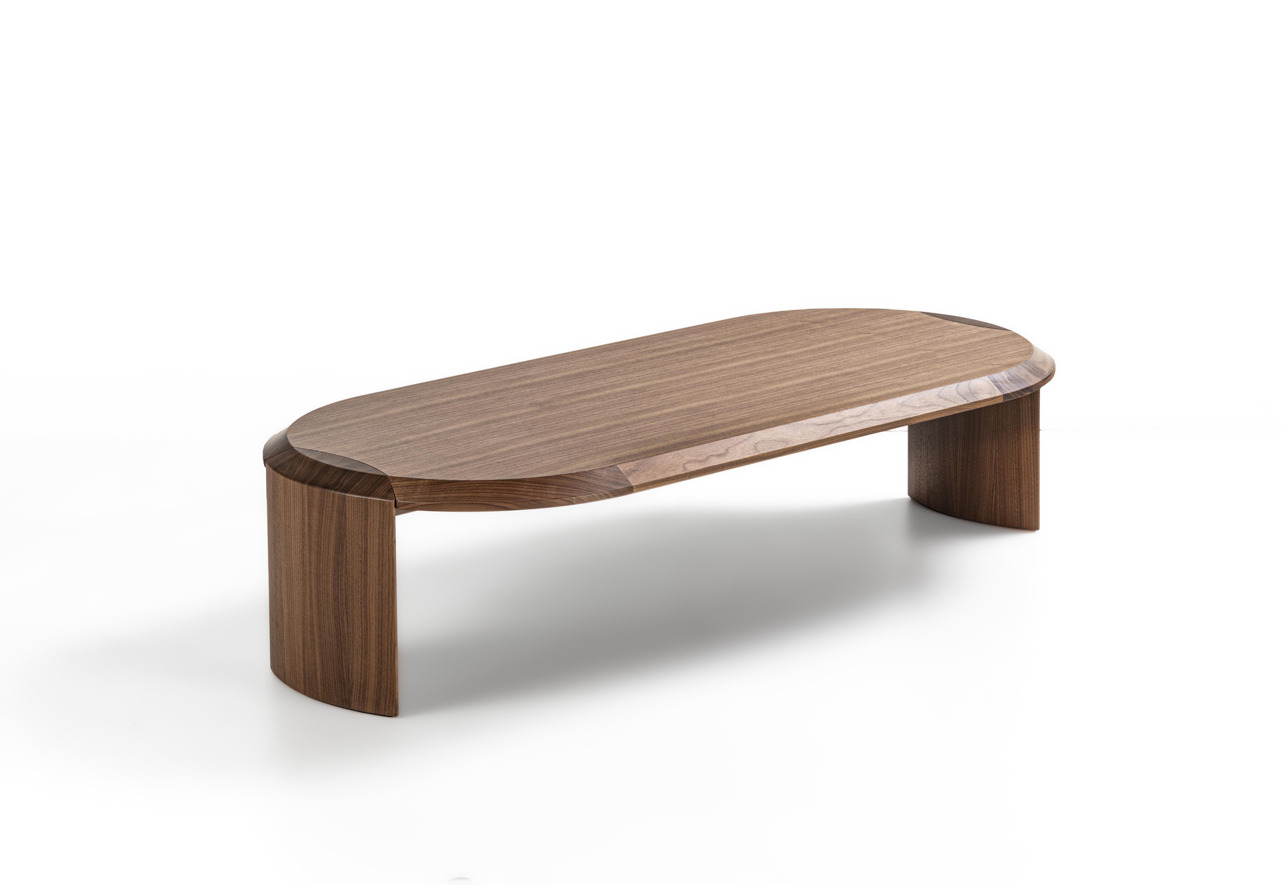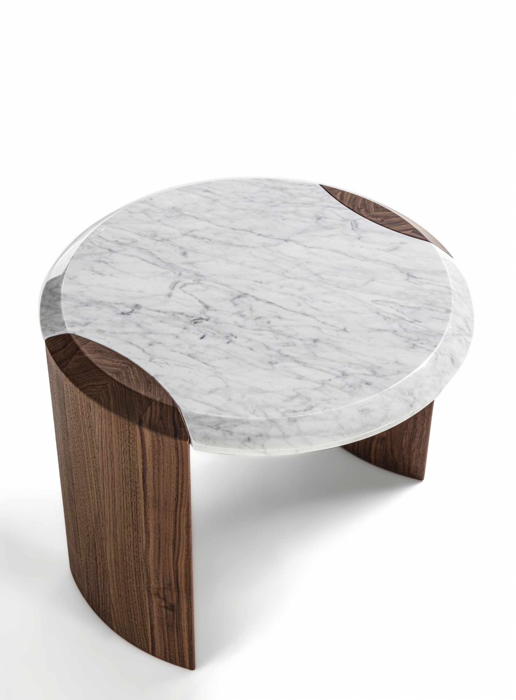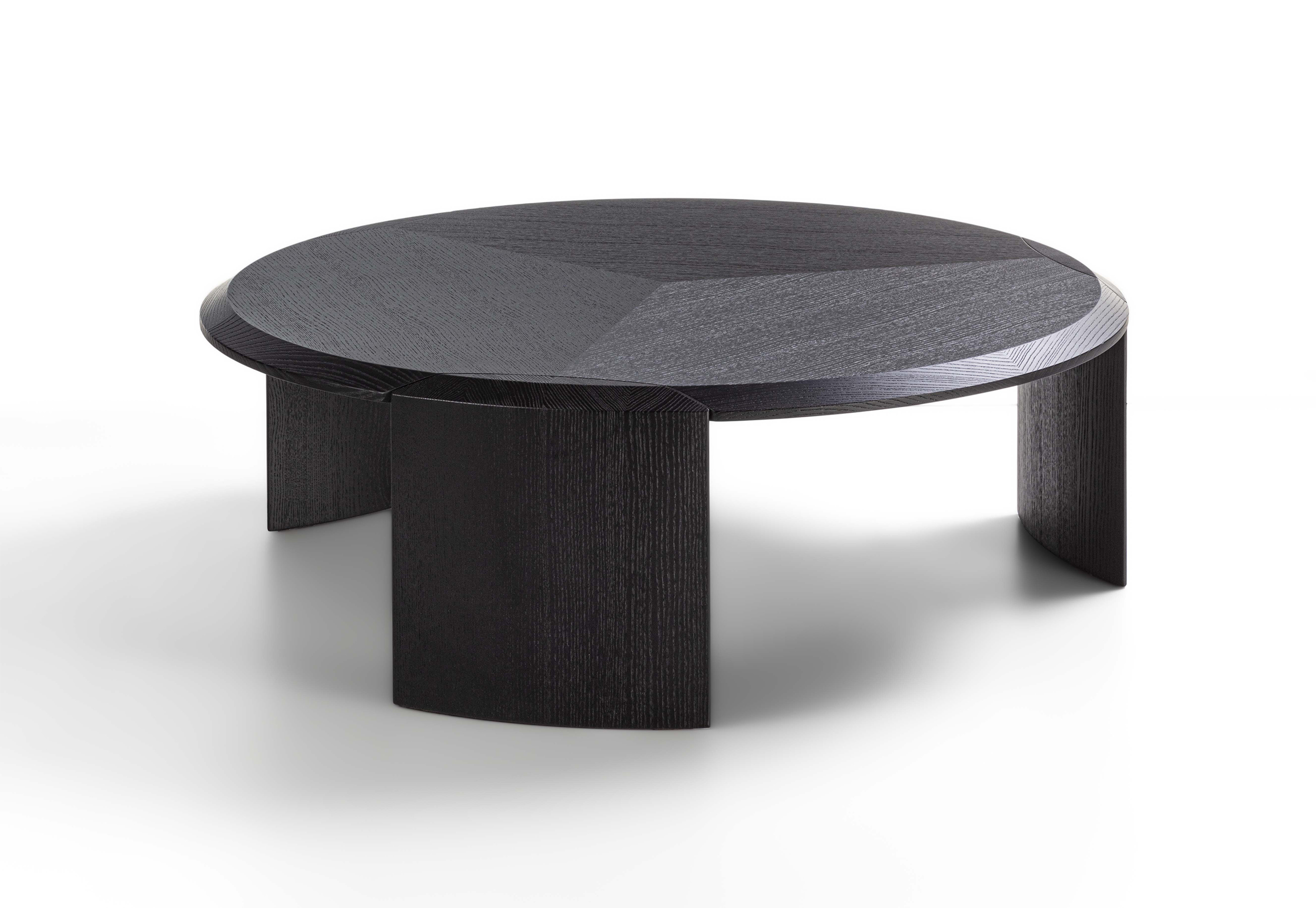 Family of nesting coffee tables of various shapes and finishes, characterized by an elegant joint between the wooden legs and the wooden or marble top.