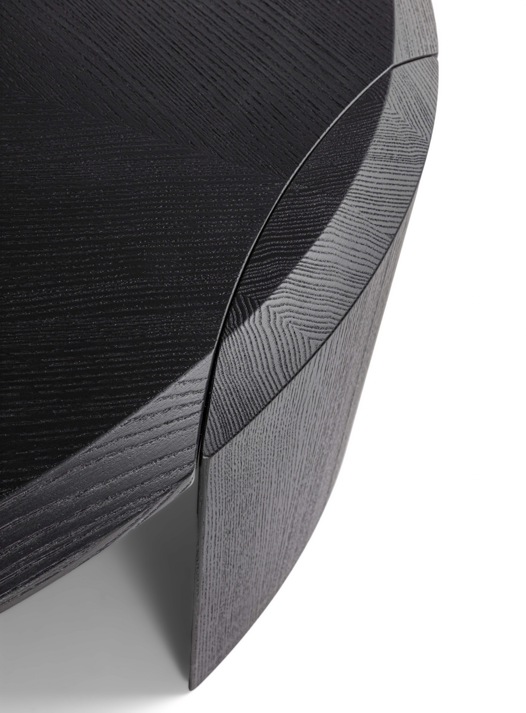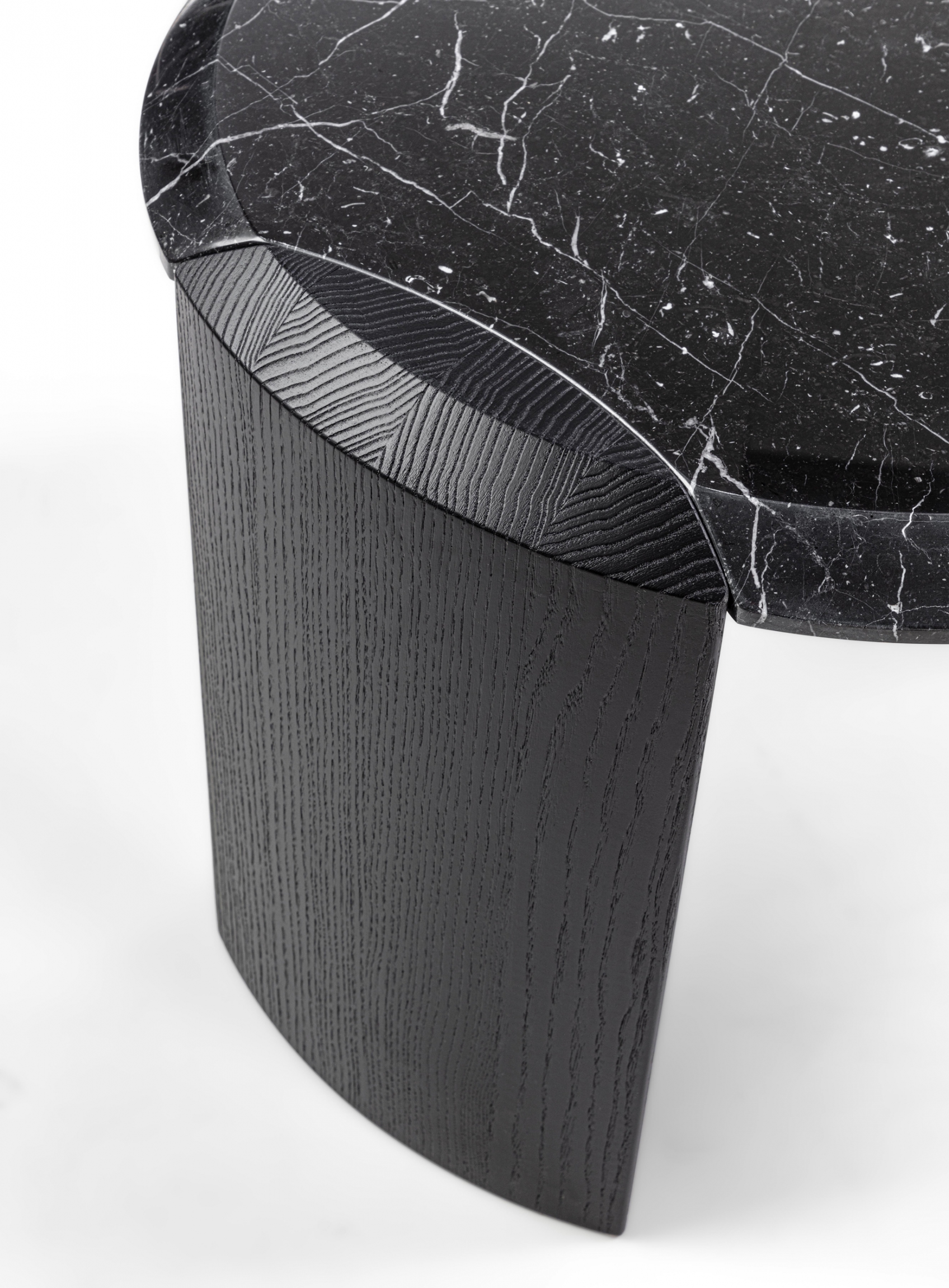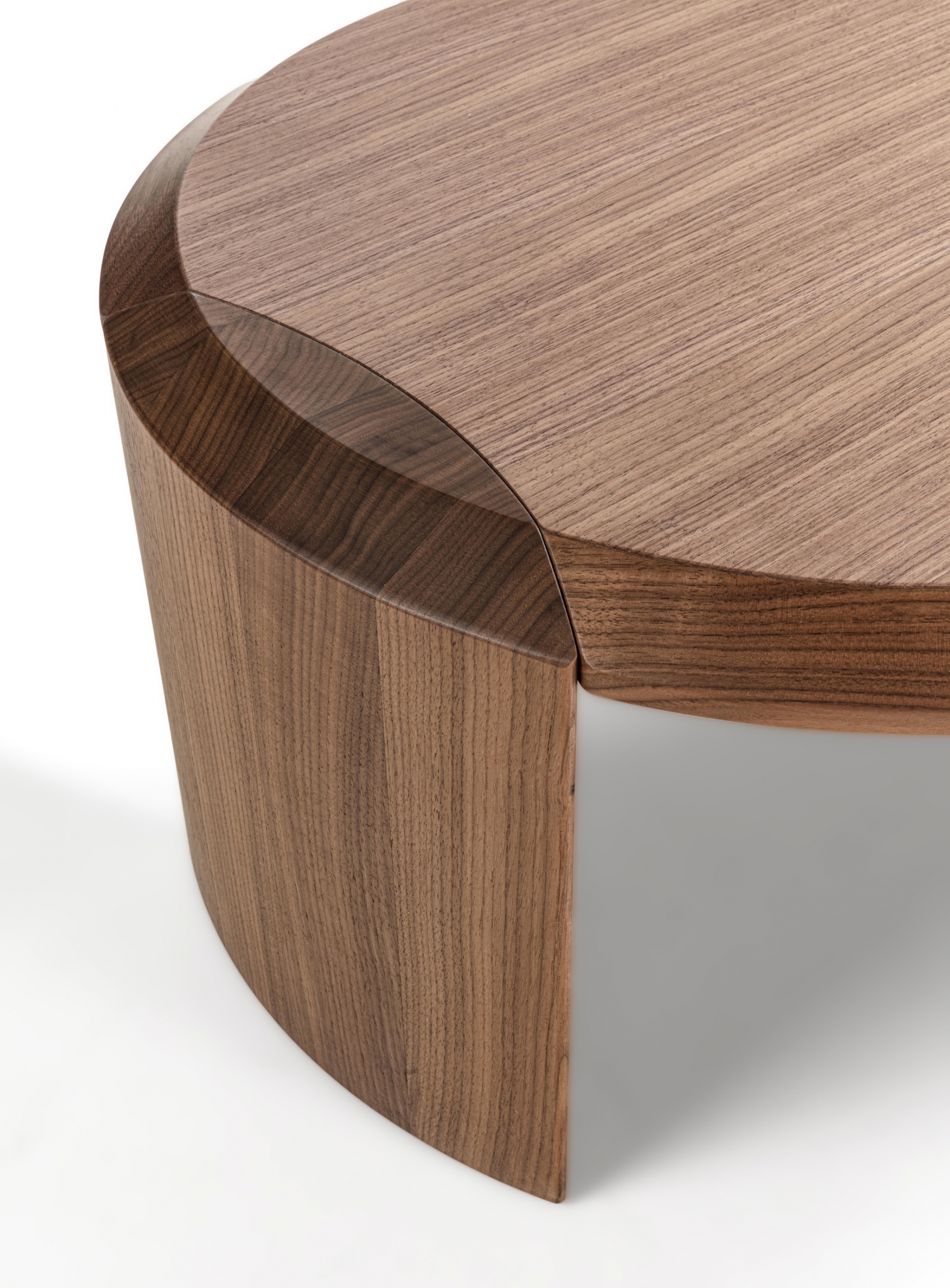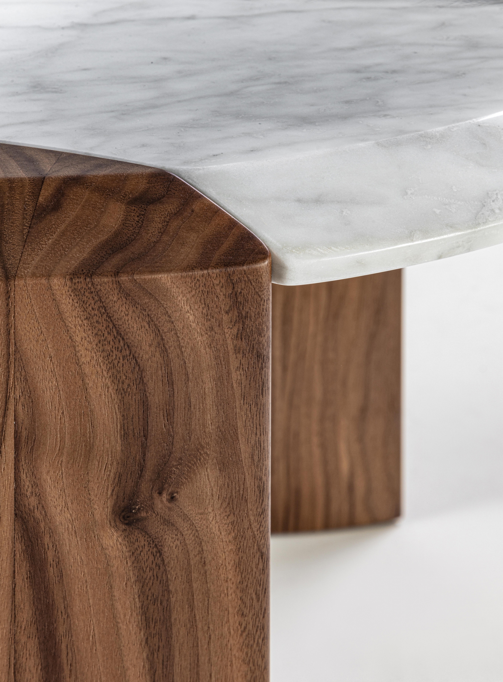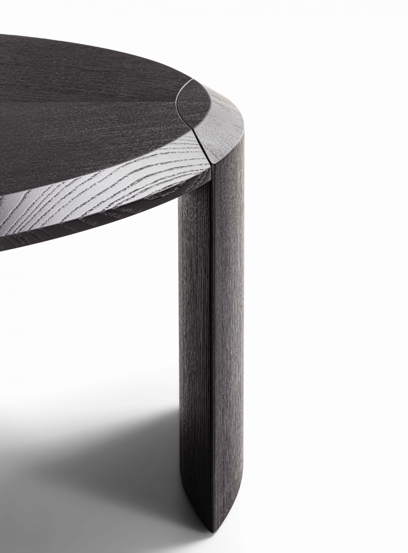 Family of nesting coffee tables of various shapes and finishes, characterized by an elegant joint between the wooden legs and the wooden or marble top.