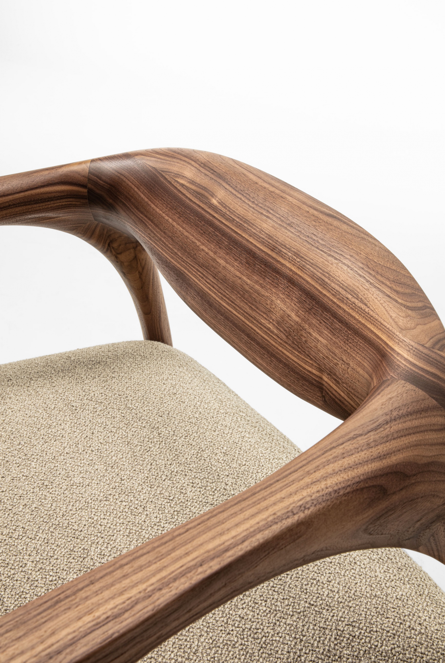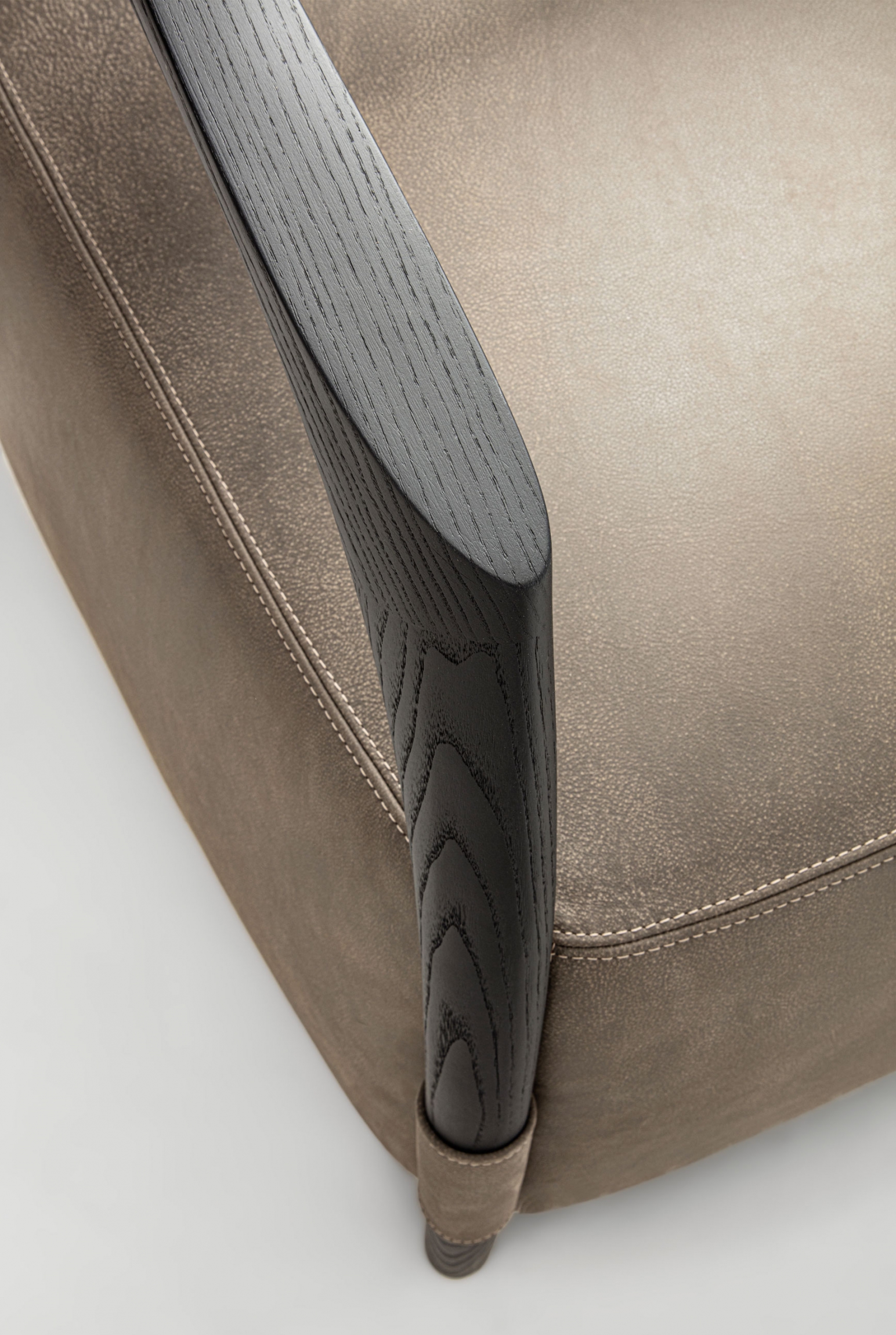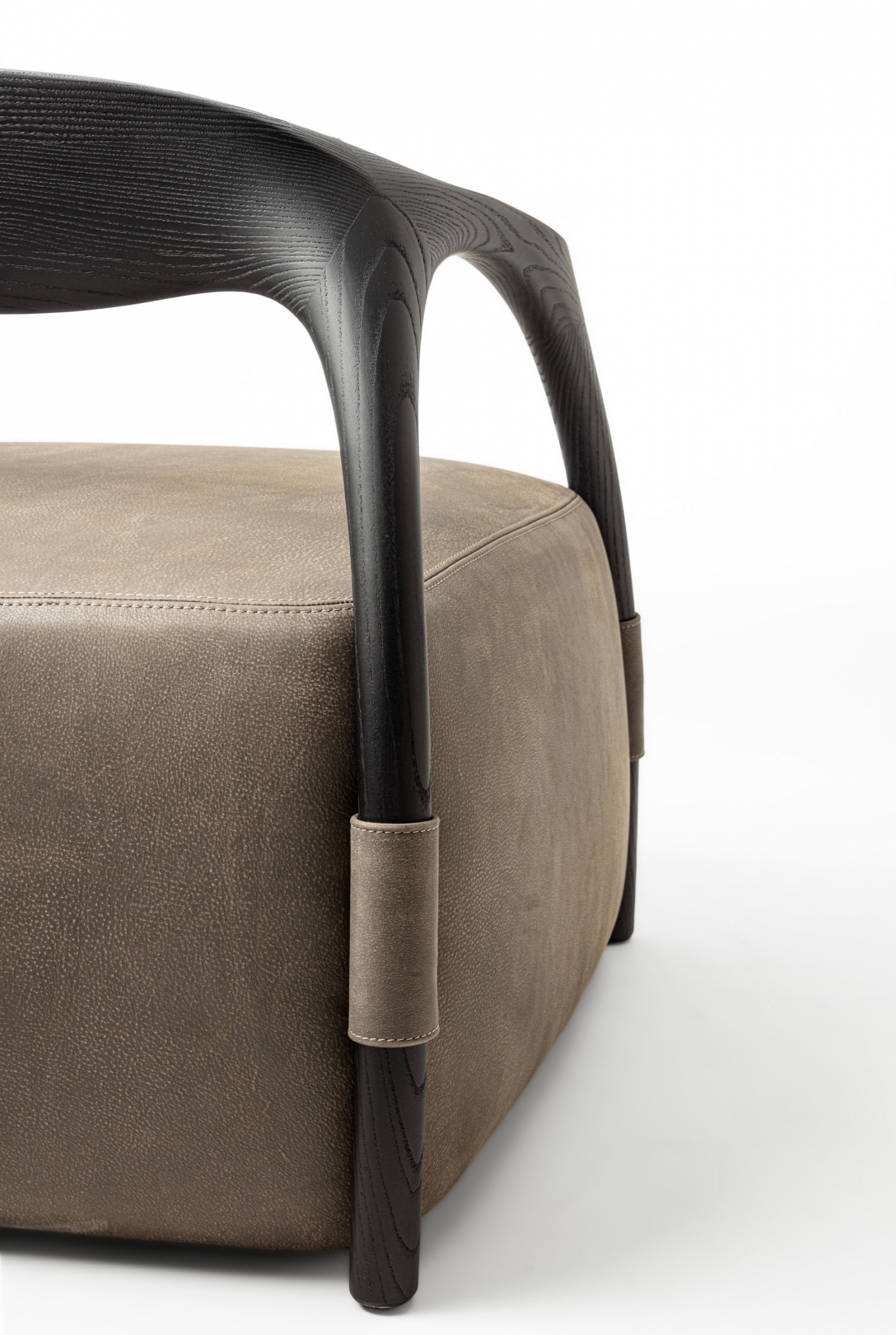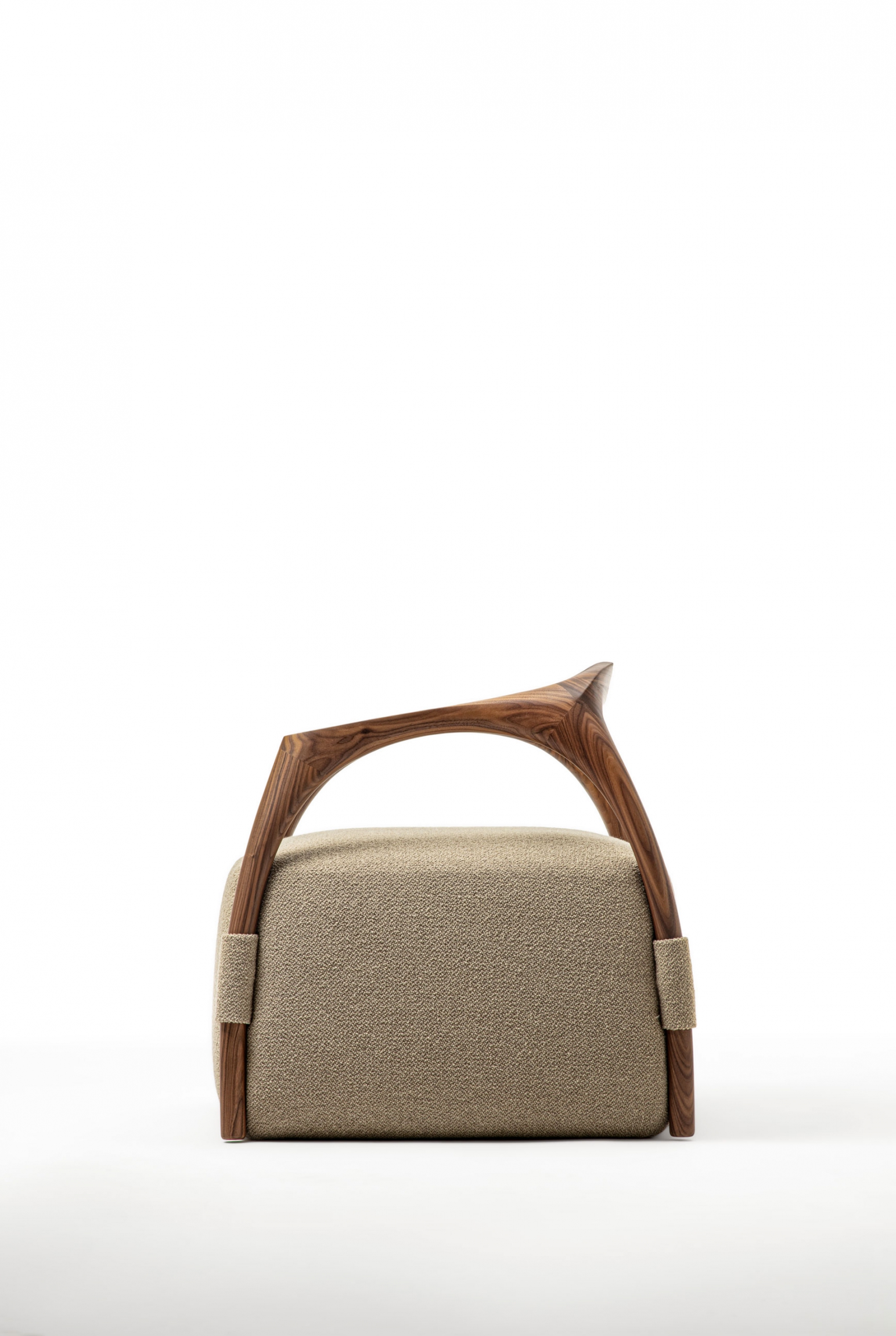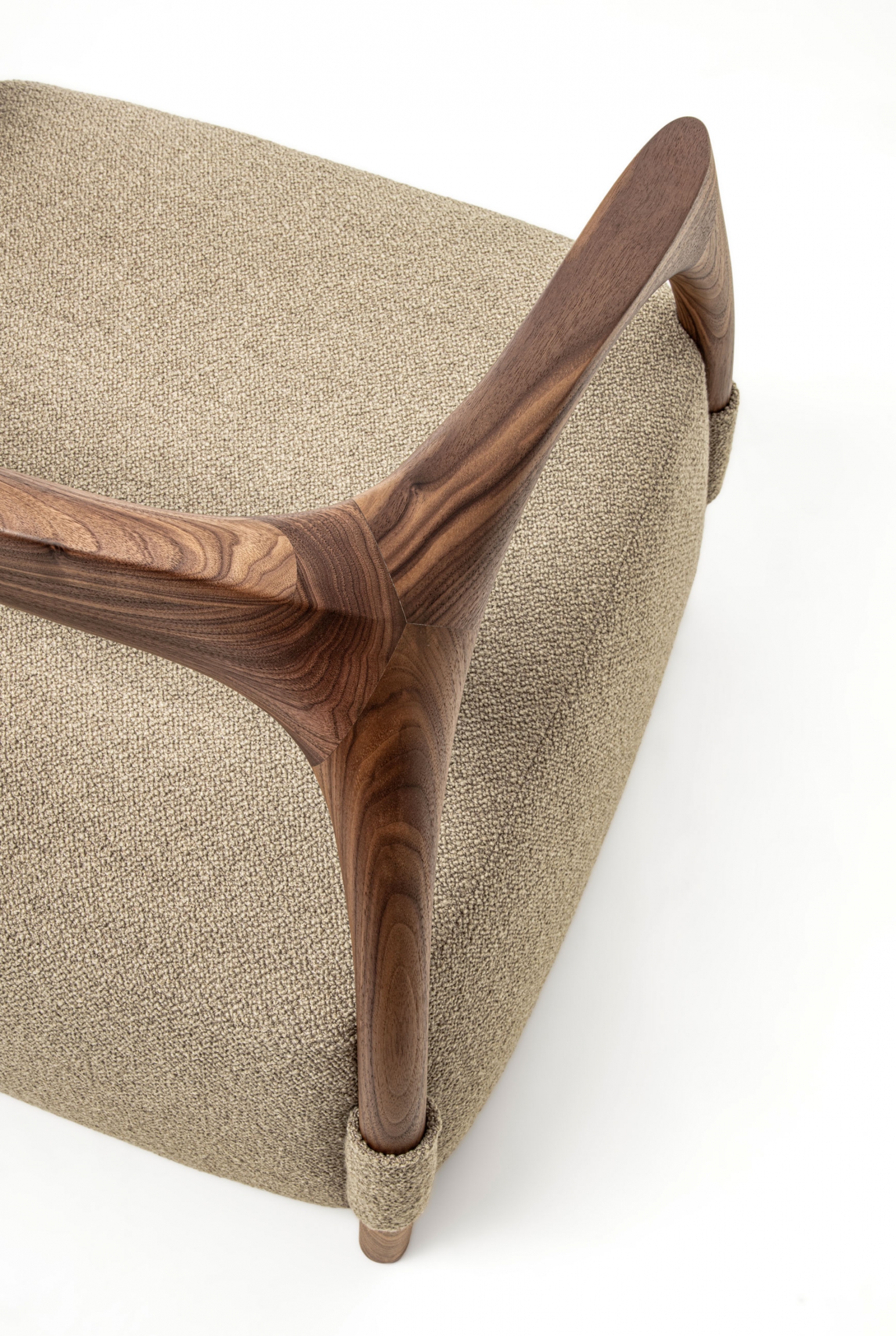 Armchair with a solid wood frame consisting of legs and backrest, the seat is made with an upholstered pouf covered in fabric or leather.