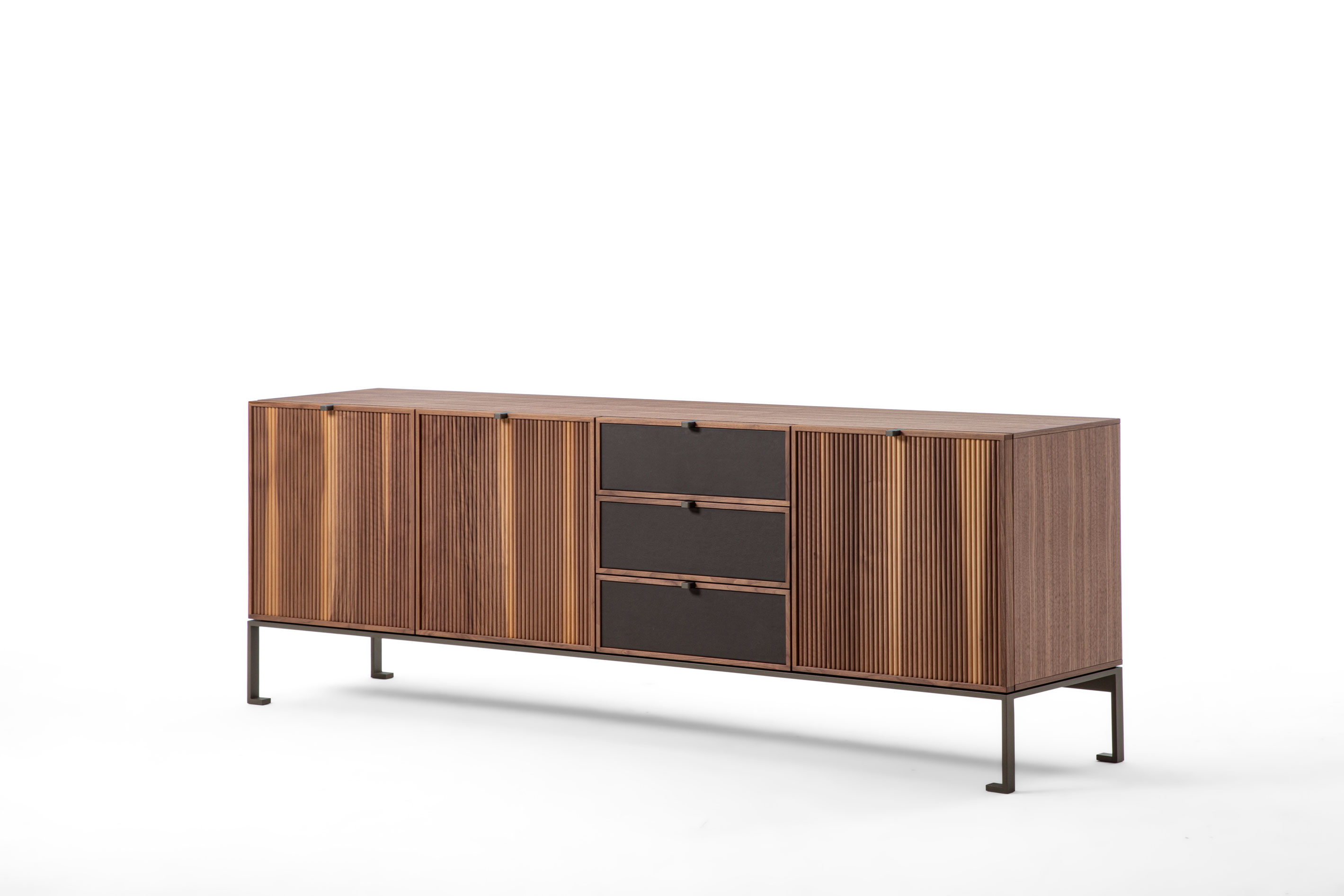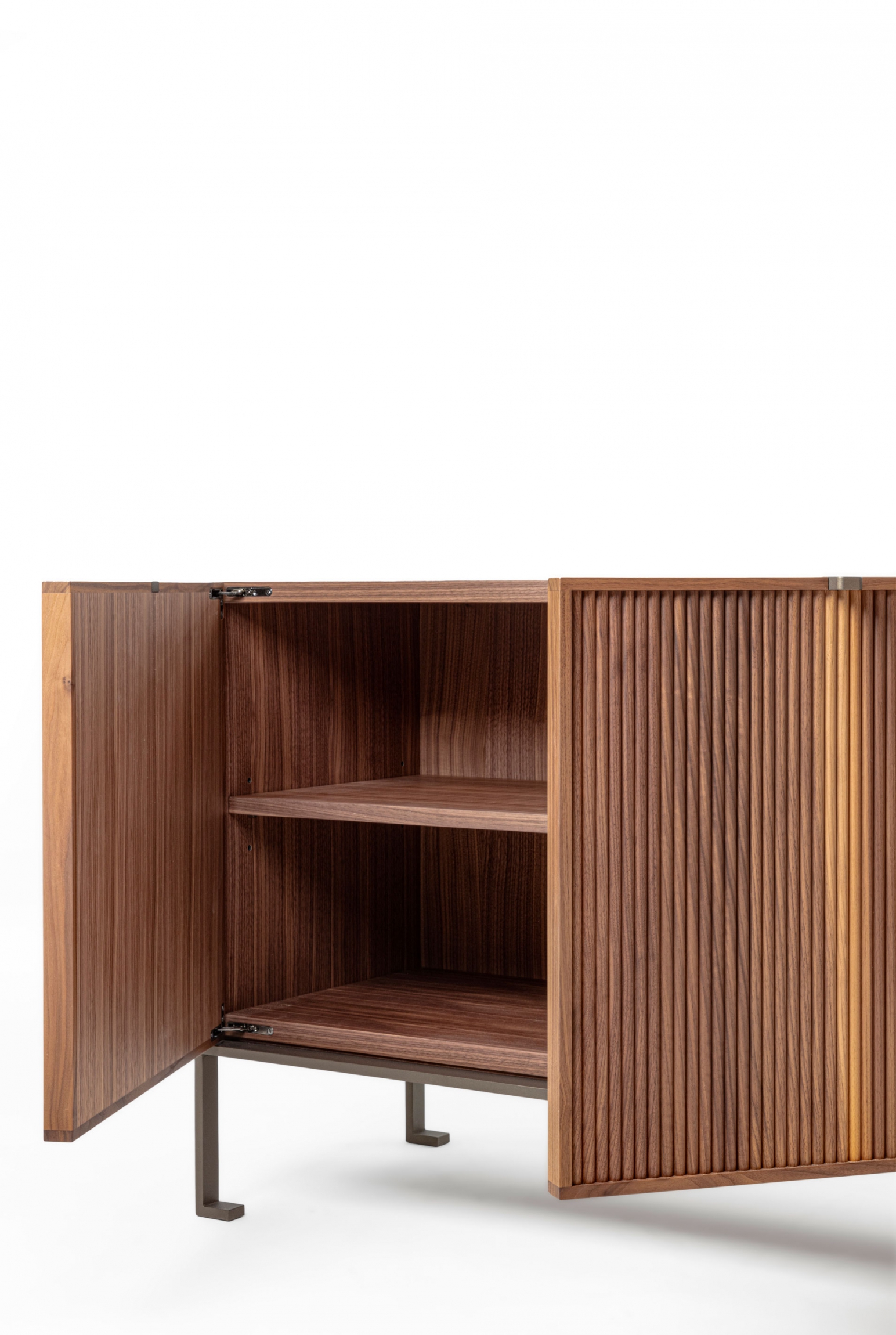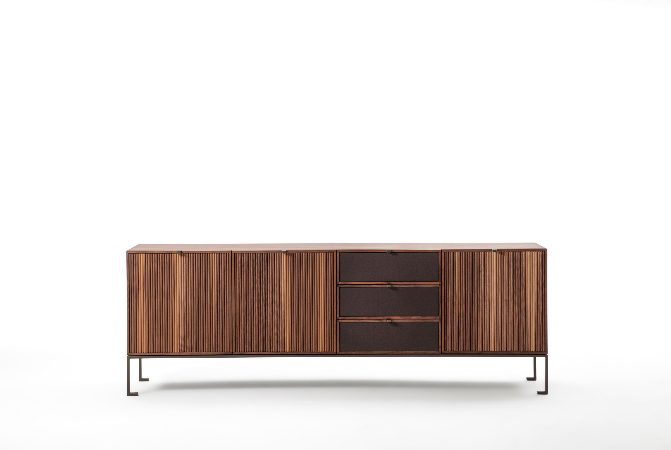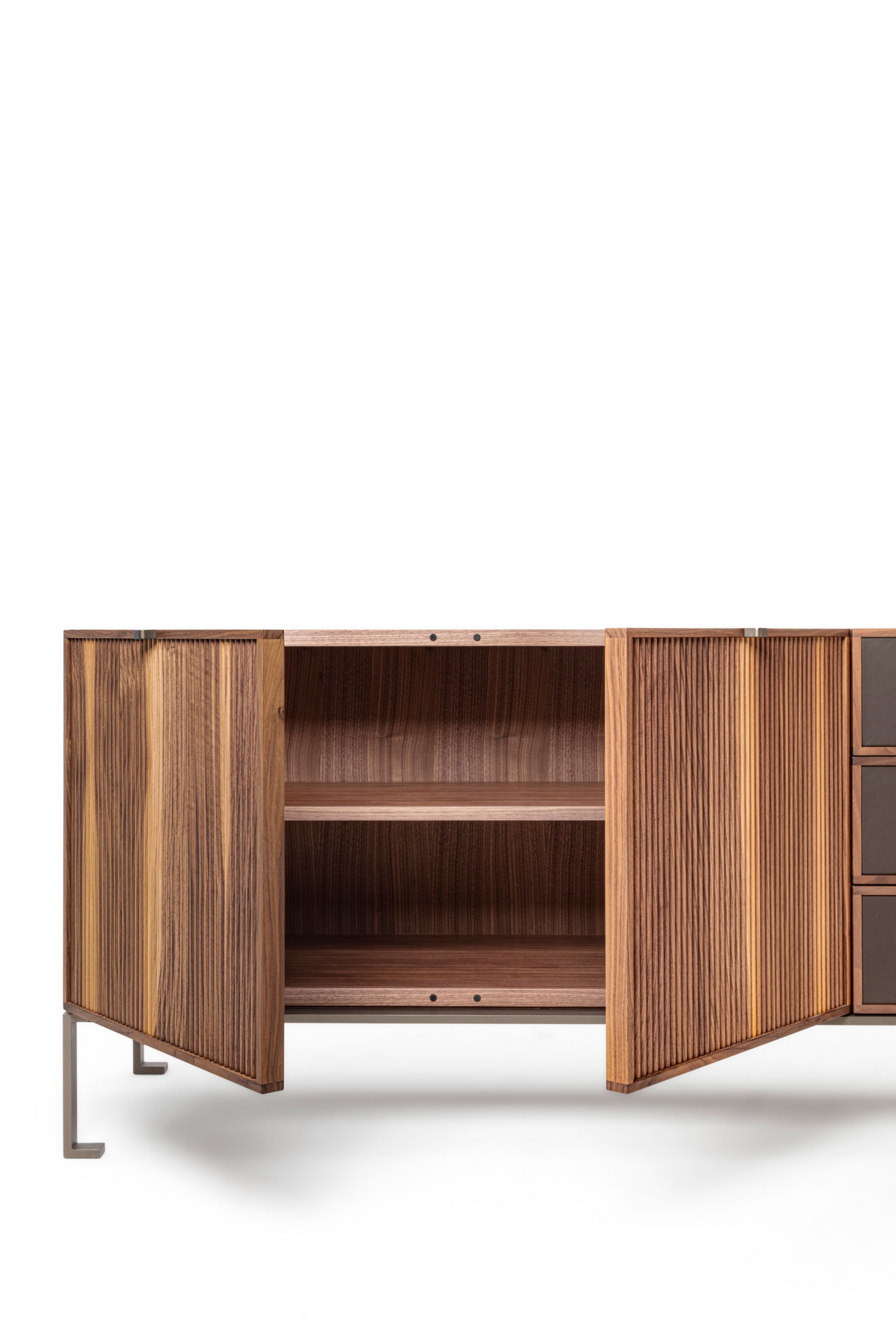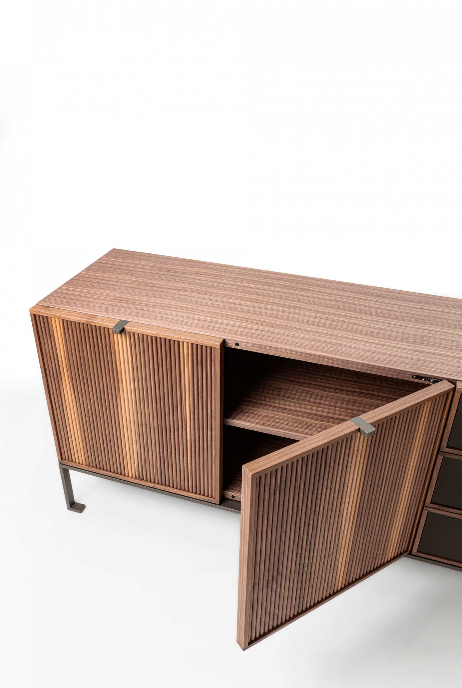Wooden storage cabinet with metal base. The top is made of wood, and on the front you can see three doors characterized by a cannulated finish and three drawers with a front upholstered in leather, alternatively, can be four doors with a cannulated finish. The internal breakdown is made with wooden shelves.