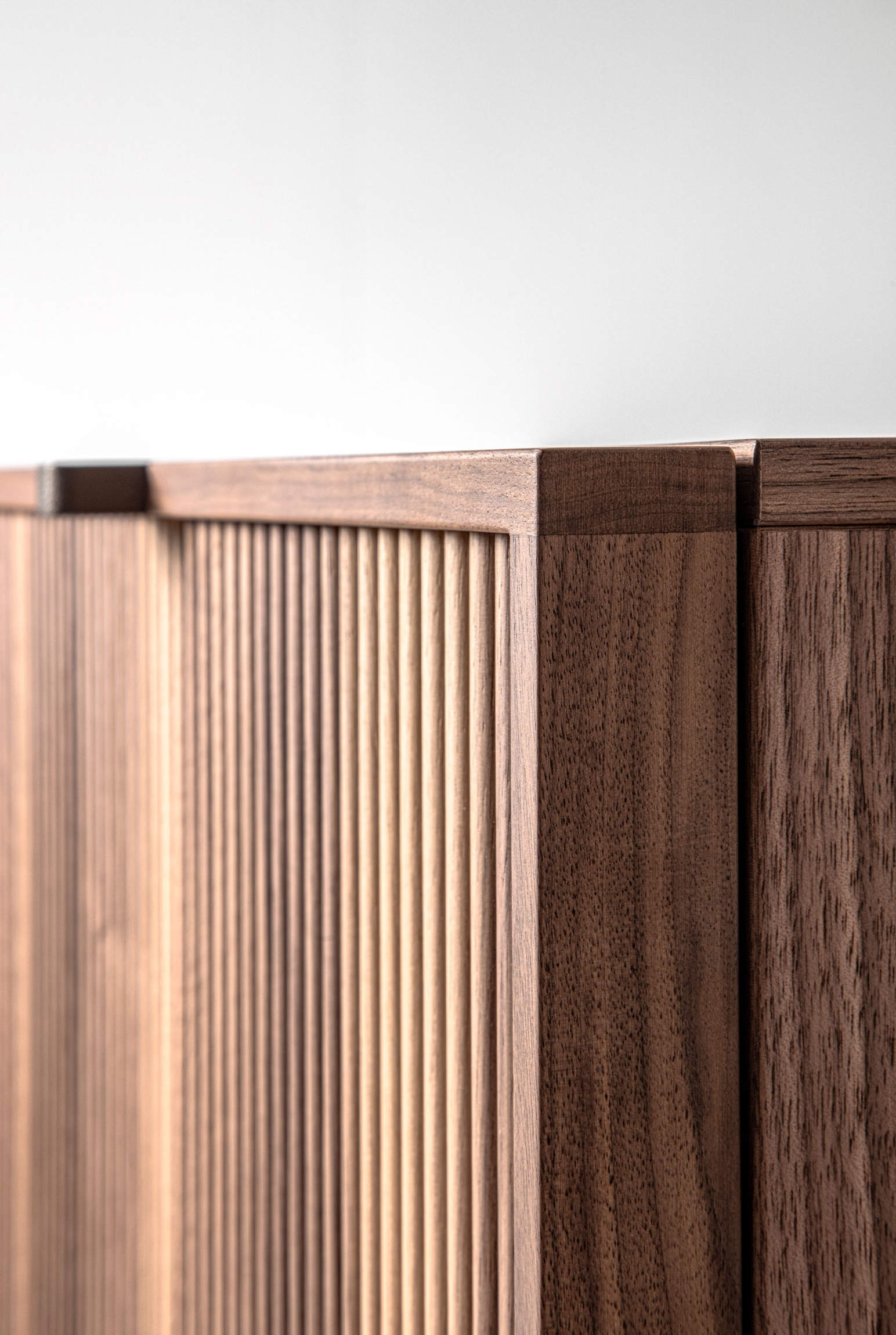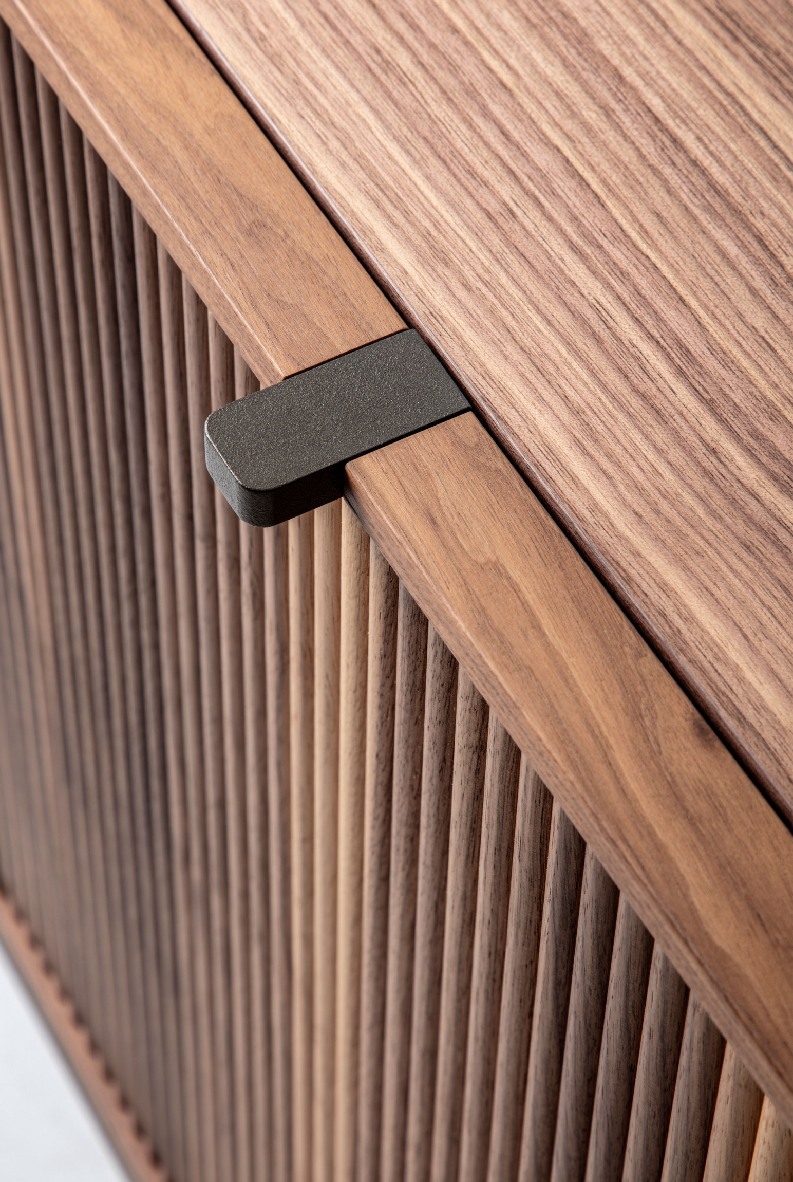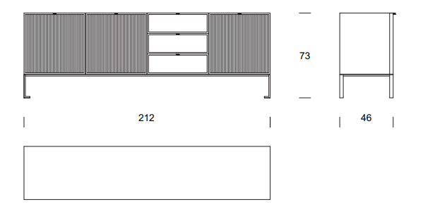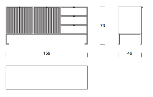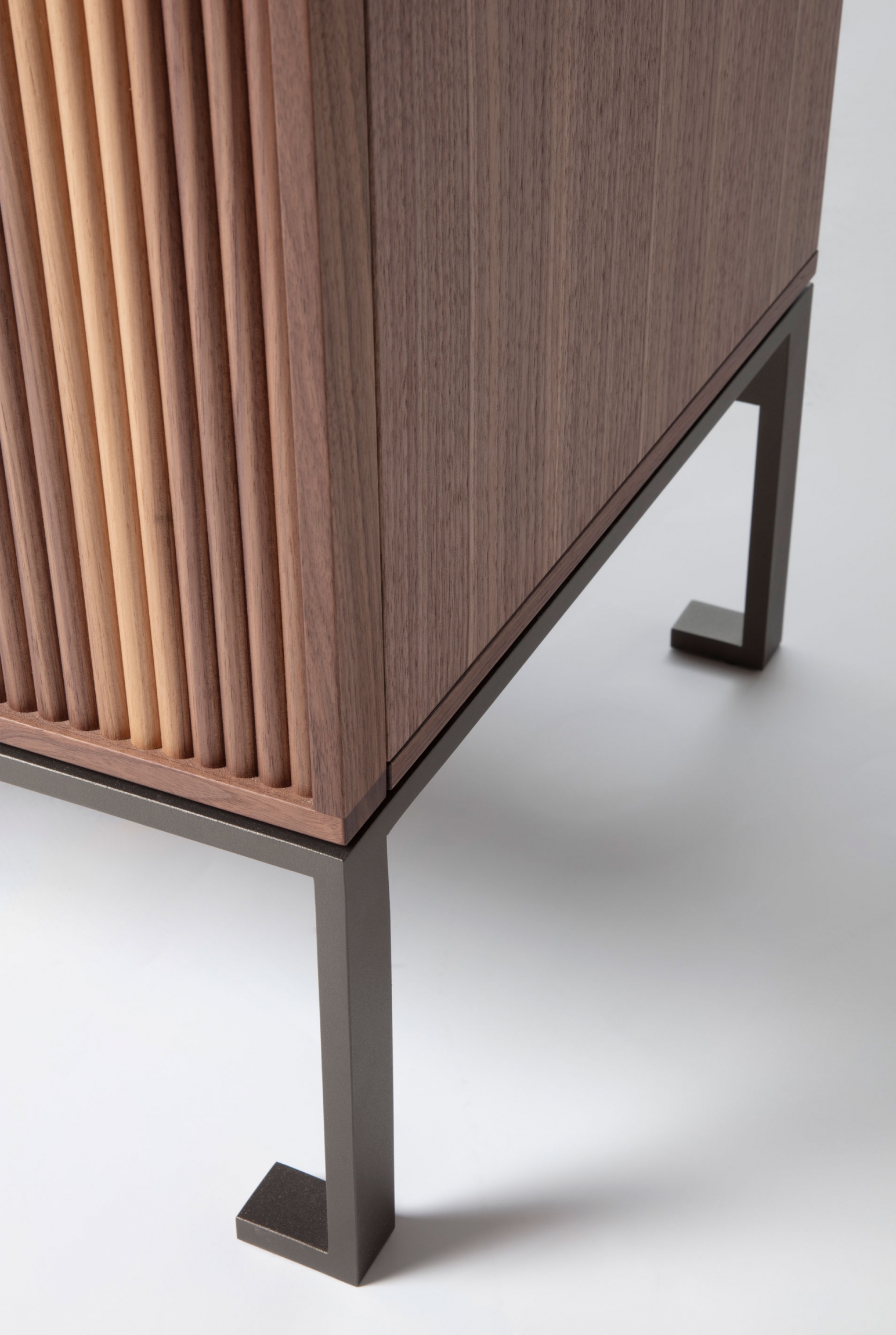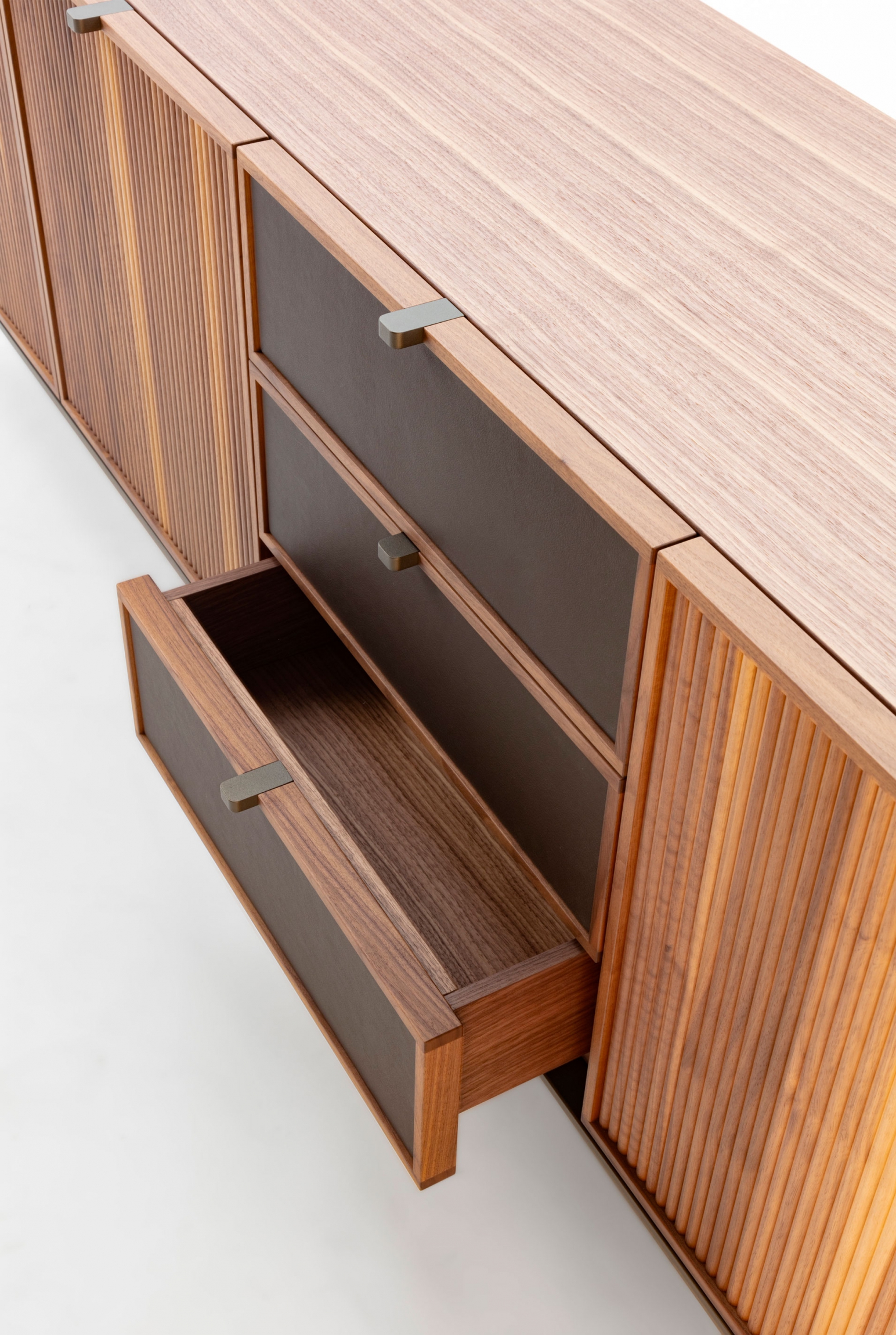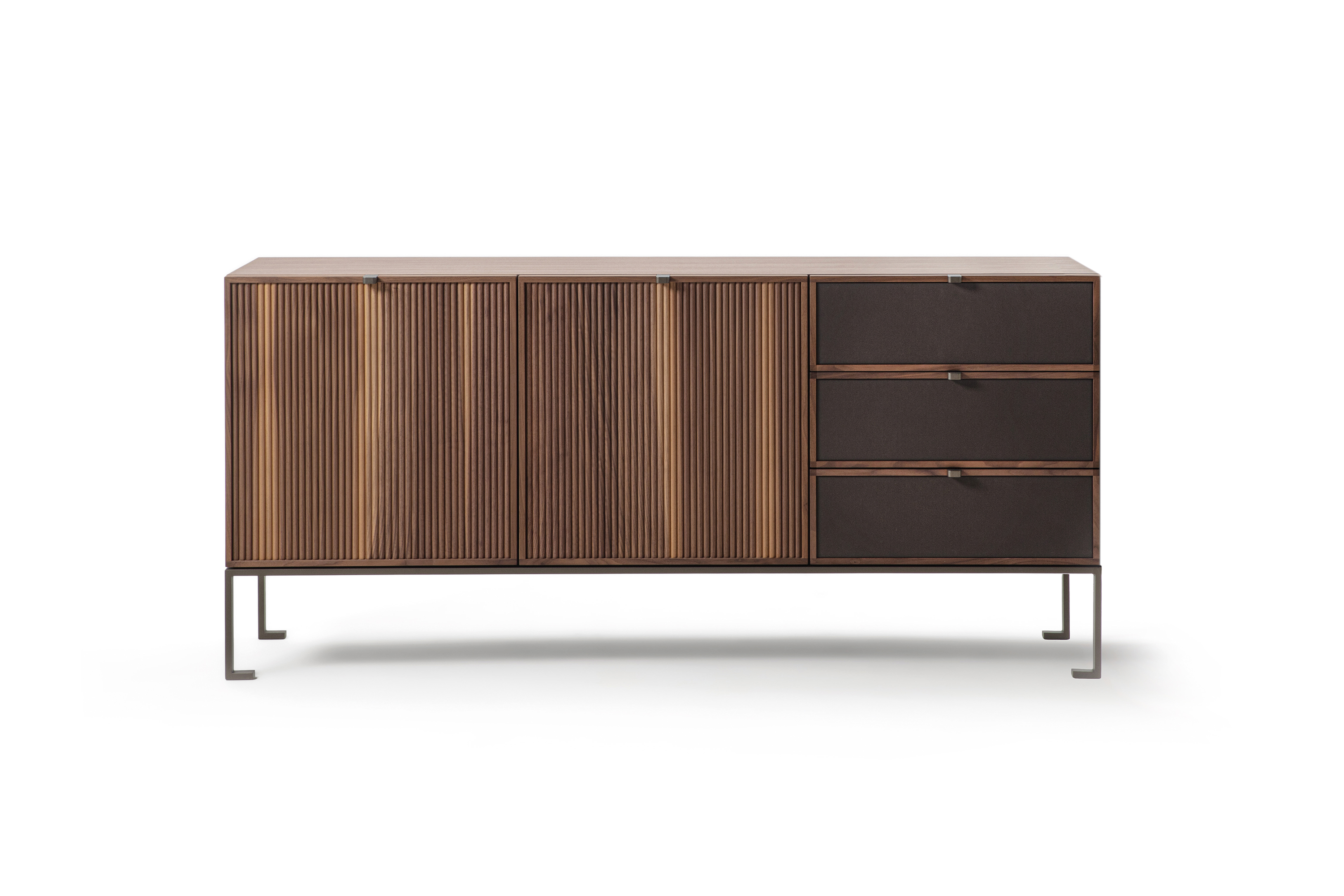 Wooden storage cabinet with metal base. The top is made of wood, and on the front you can see three doors characterized by a cannulated finish and three drawers with a front upholstered in leather, alternatively, can be four doors with a cannulated finish. The internal breakdown is made with wooden shelves.
