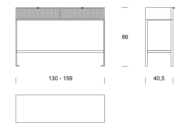 Wood console table with metal base. The top is made of wood, and on the front, it is possible to have two drawers with a canned finish or alternatively two drawers with leather-covered front.