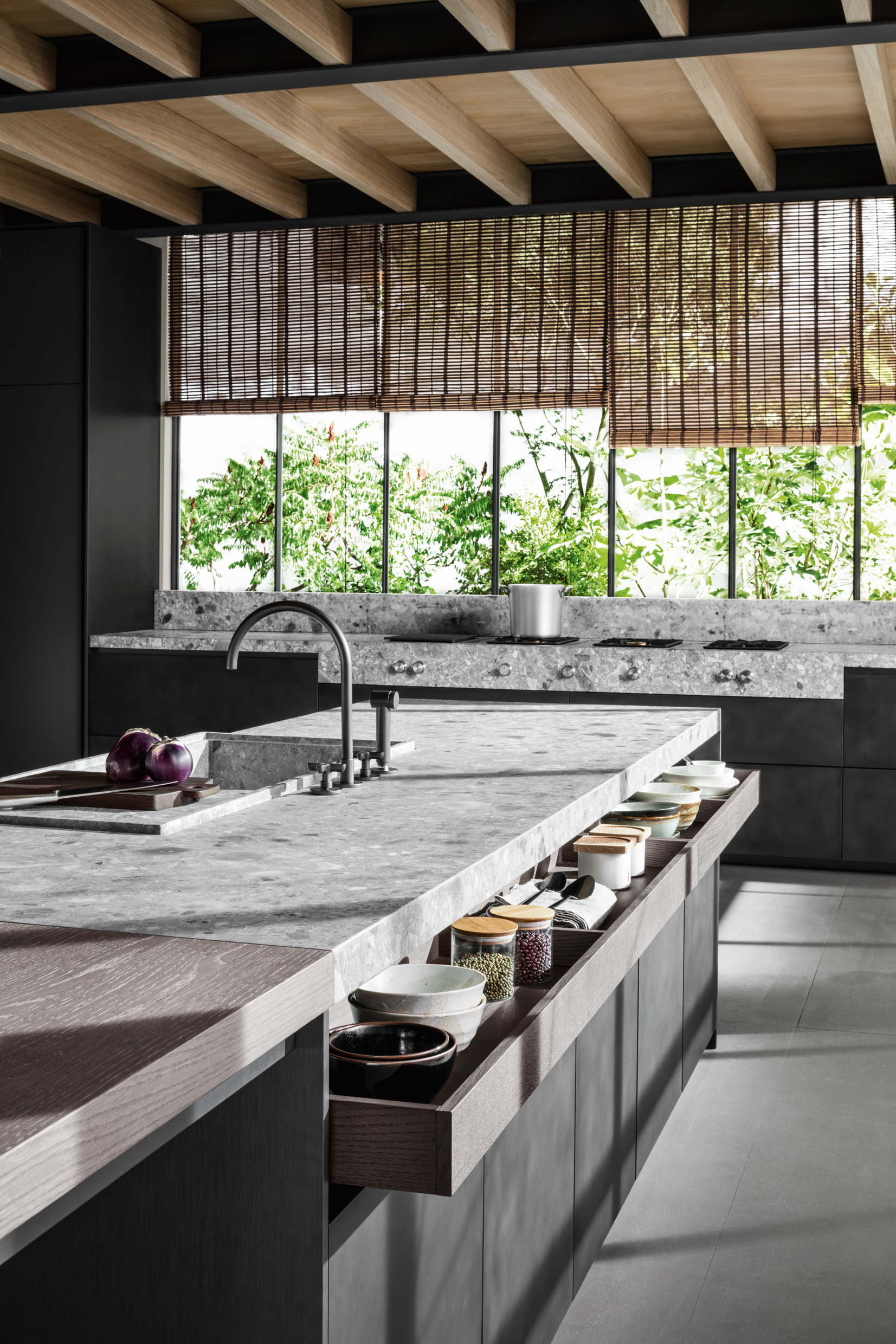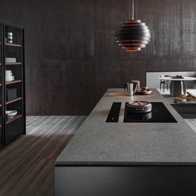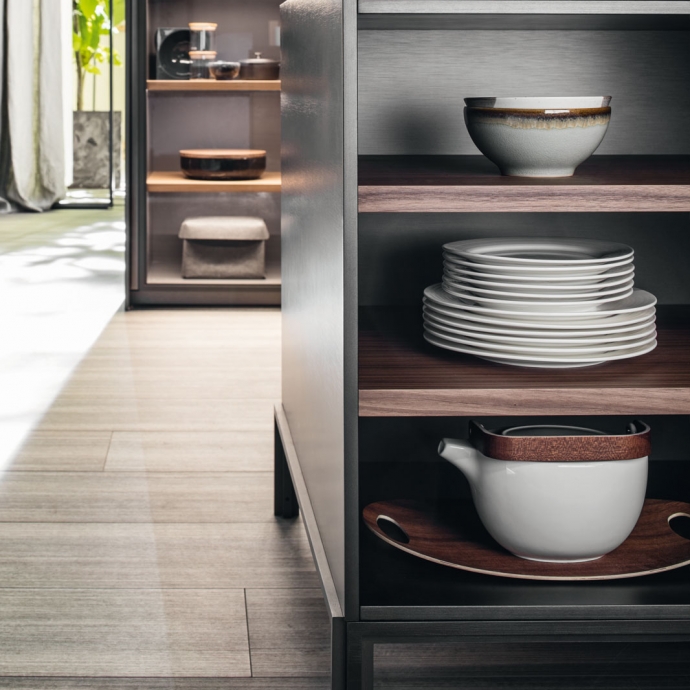 大型的拉出式托盤、日間抽屜和下方平面的集成式小輪完成了整個項目的結構設計。 鋁制的支撐框架可以讓所有的組合物完全貼近地面。創新揭示了集成式欄桿和LED的技術細節,而謹慎處理的柜門優化了抓地力,創新的鉸鏈轉軸可以讓柜門開啟至180°,獲得更多的內部可利用空間。 得益于優雅的懸拱和配備了微型緩沖鉸鏈的修長玻璃,廚房也因此獲得了一種新的飾面。