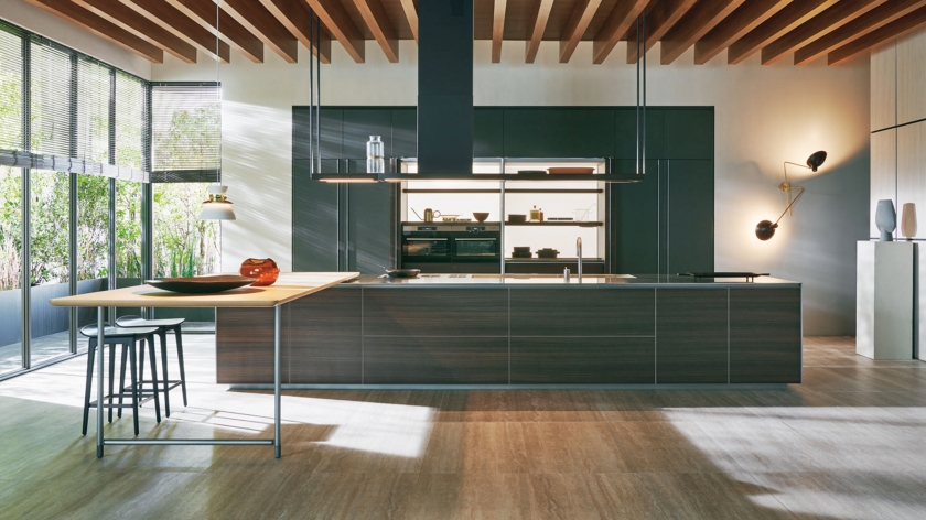 2018年推出新款設計理念獨特、簡單、具有線性結構的柜門。鋁制框架和錫金屬柜門,并且柜門設置精致柜面。柜門上方邊緣均有凹槽設計,便于開合。這款廚房與帶有分隔板設計的全新VVD抽油煙機柜罩以及Hi-Line6吧臺搭配而成,配有堅固的橡木和黑色橡木工作臺,圓角與斜邊設計,鋁質結構制成。島柜柜體采用珍貴材質桉樹制成,柜門為鋁合金框架,工作臺采用不銹鋼封邊,配有水槽和和爐灶。