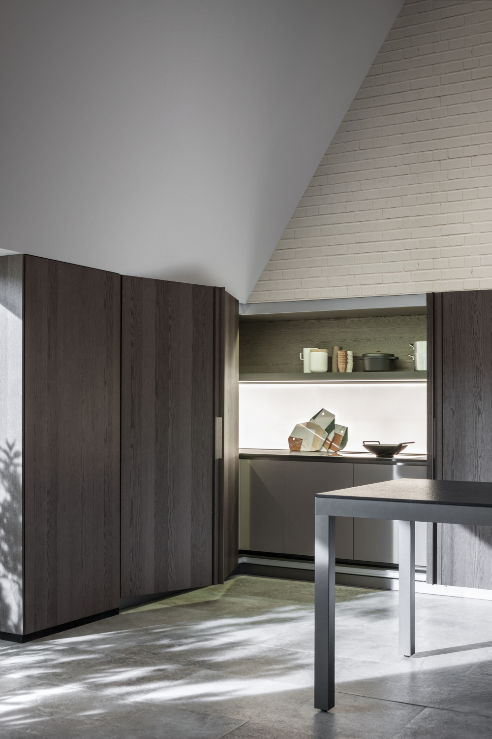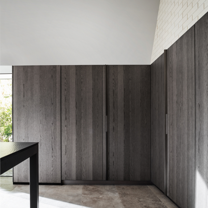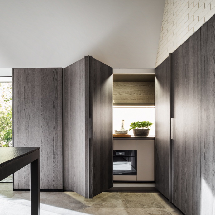 and disappears when necessary. The large doors slide and fold, disappearing into the side compartments