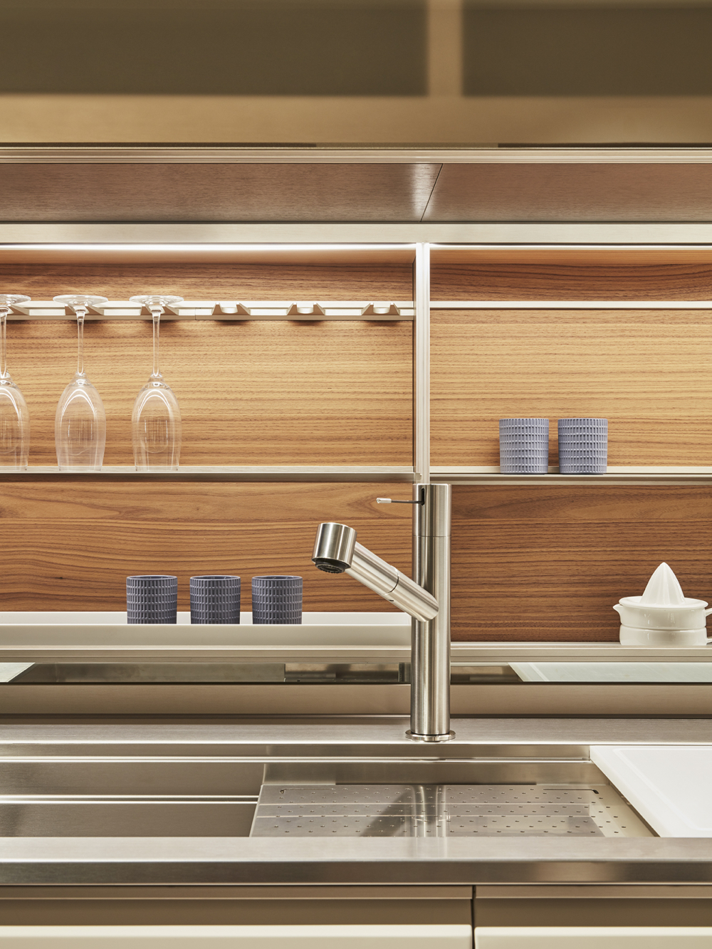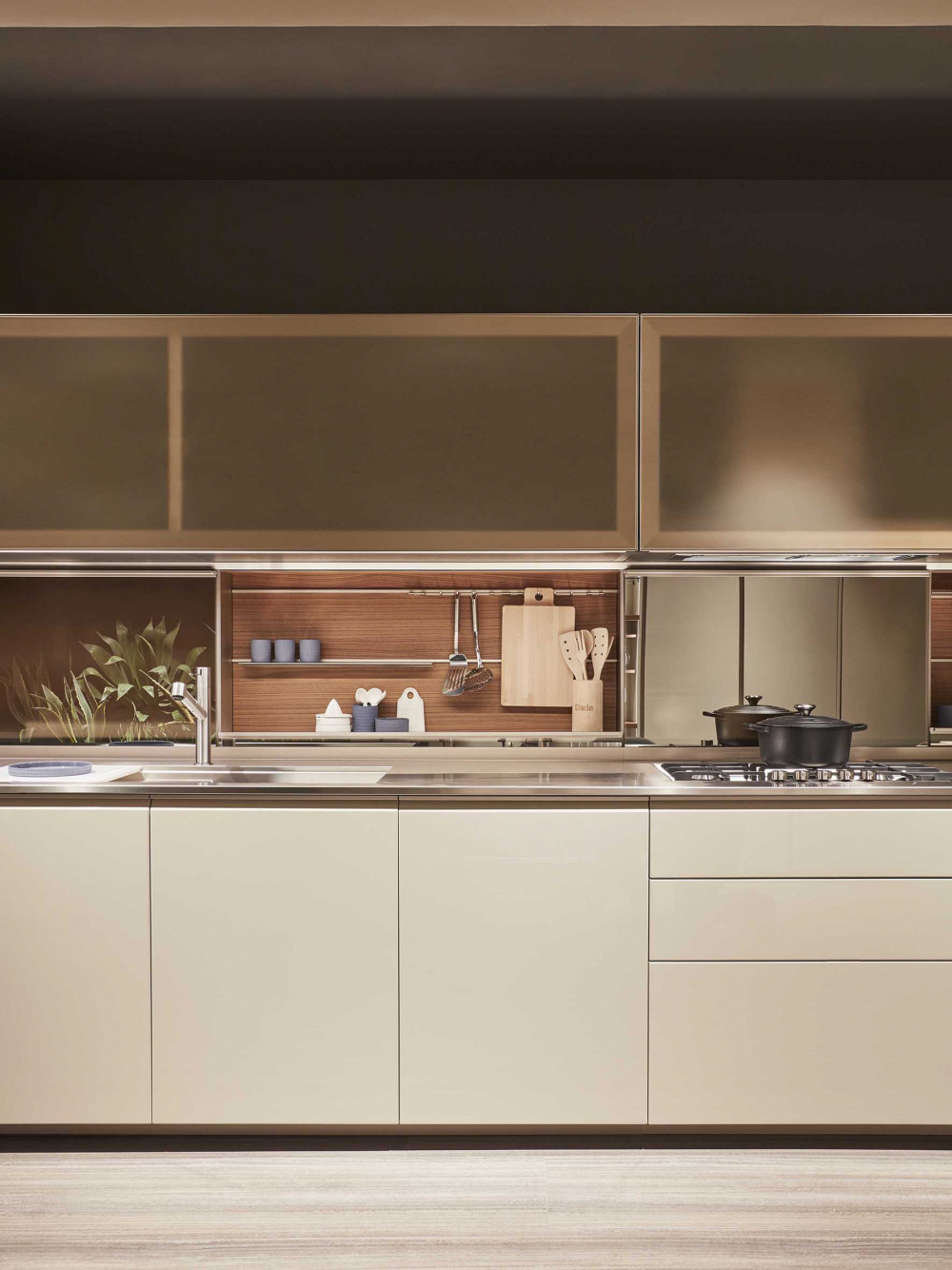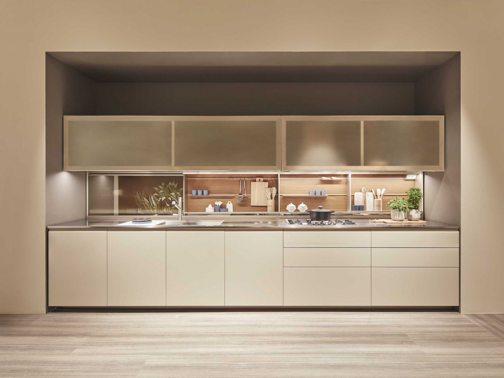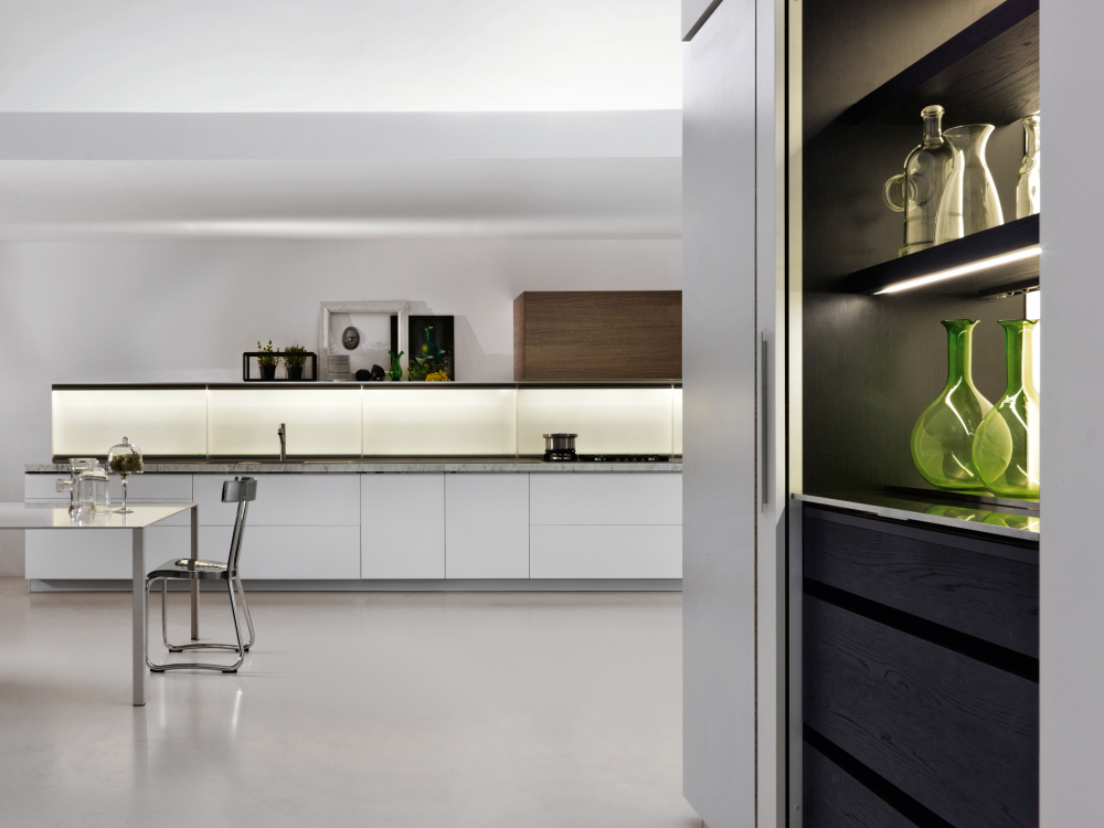 worktop can be concealed by sliding the glass doors, with a mechanism patented by Dada. The LED lights