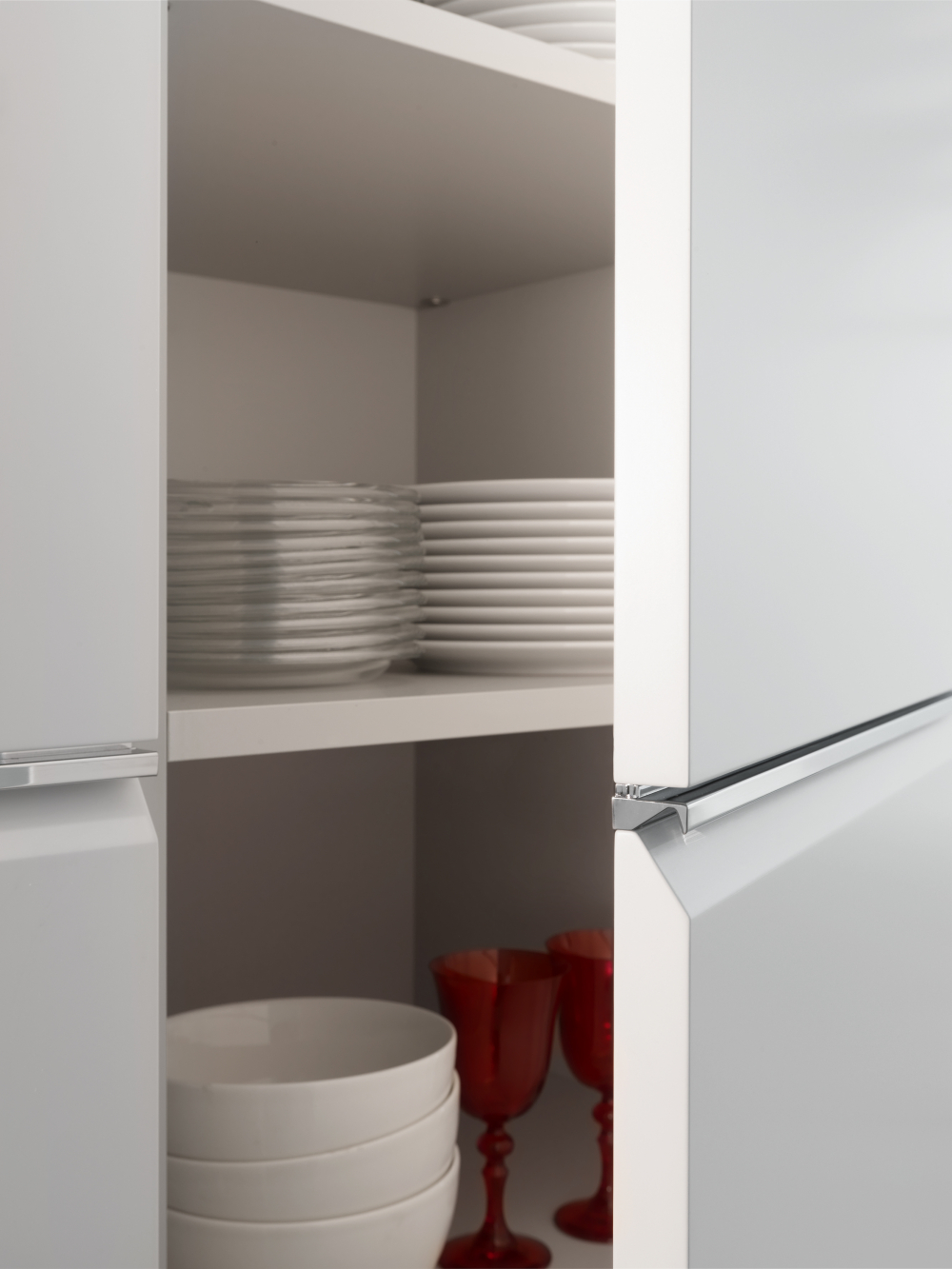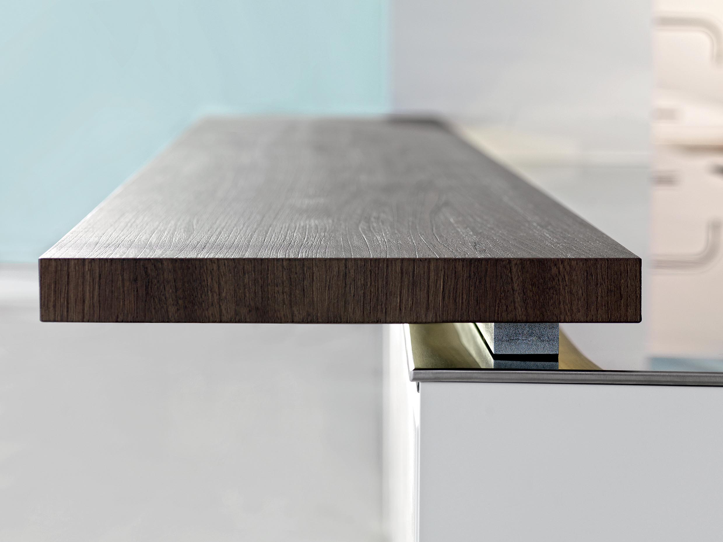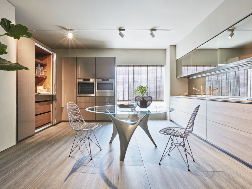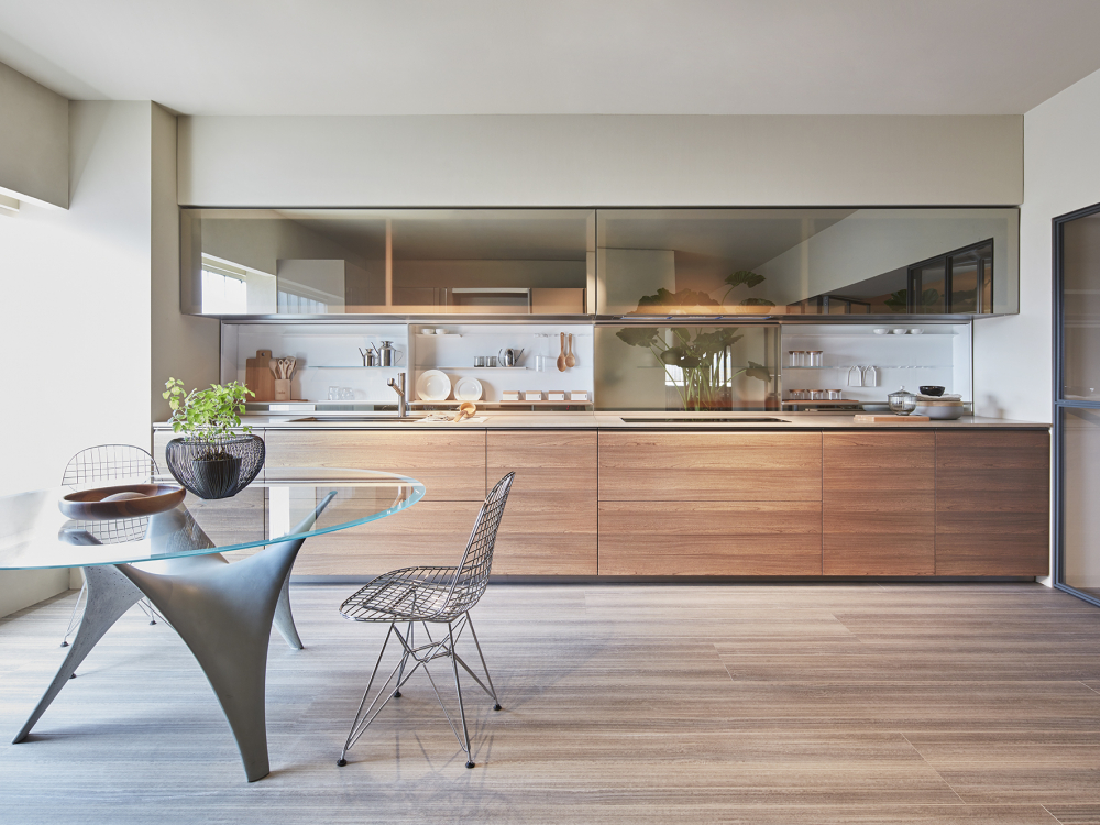 worktop can be concealed by sliding the glass doors, with a mechanism patented by Dada. The LED lights