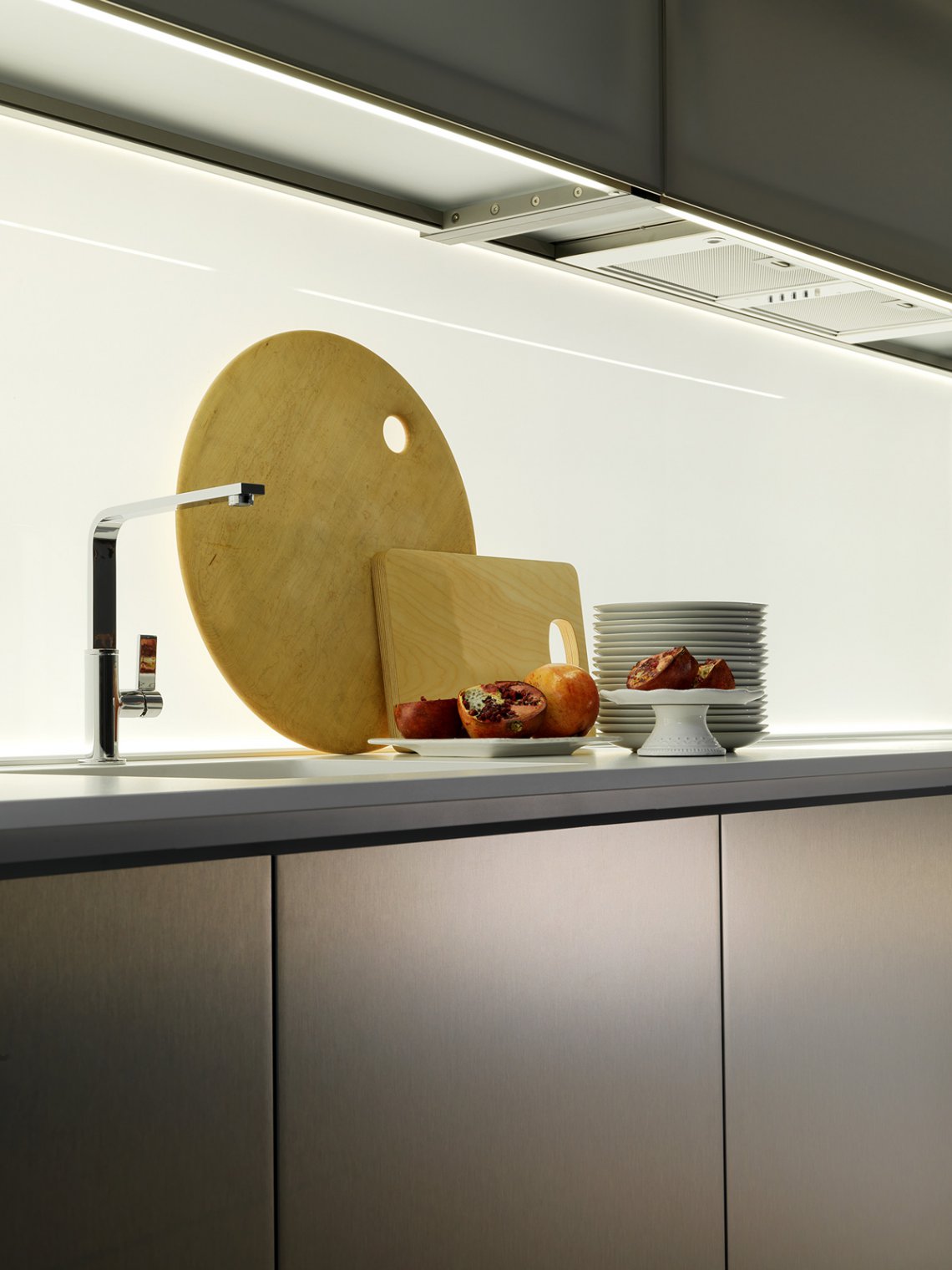 be done (as an option) in white glass, ending in height with D|Frame wall unit or the hood shelf in aluminum.