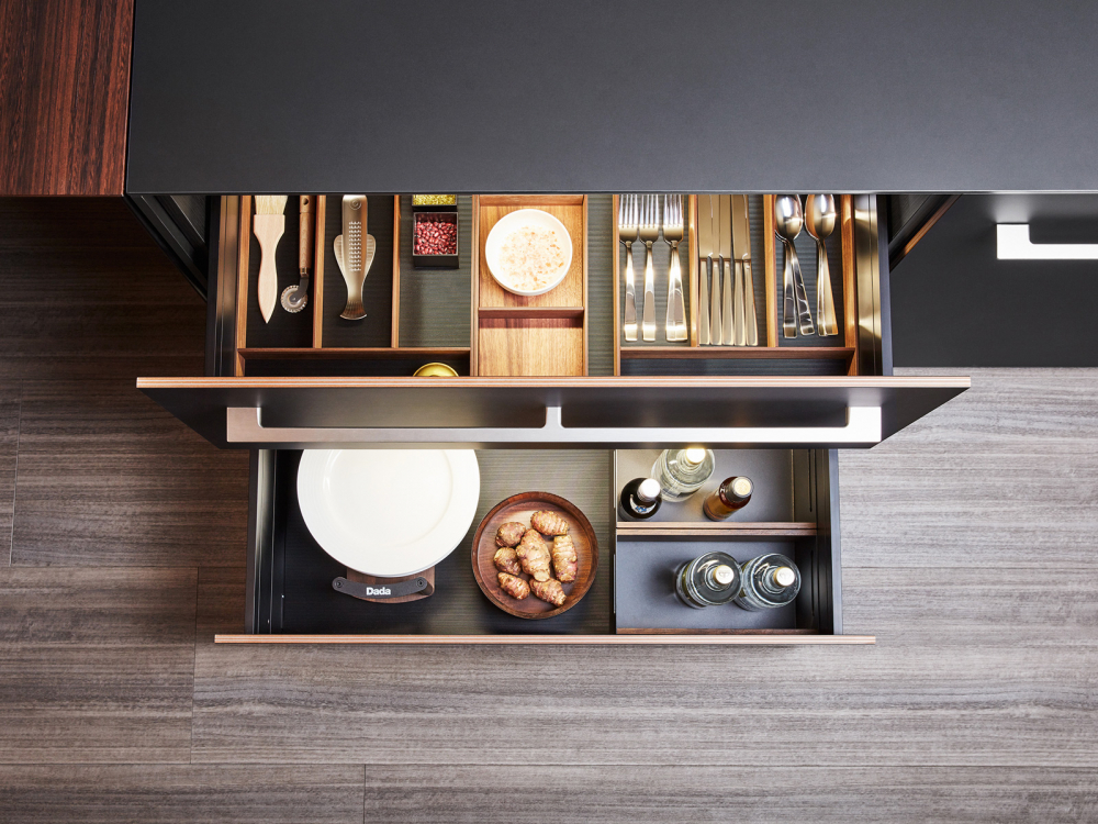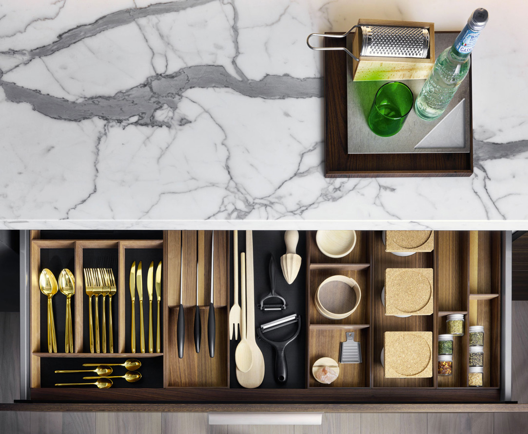 Walnut modular accessories to organize the interior space of drawers: trays, dividers, cutlery grids, jars
