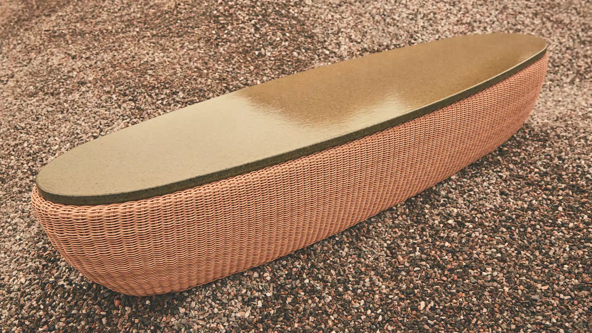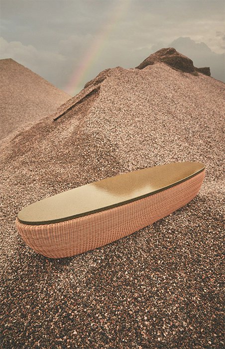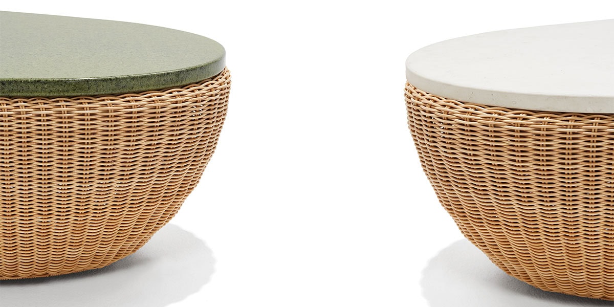 Reminiscent of sunny summer afternoons and the slow passing of time. Afternoons is an outdoor lounge set featuring an armchair, sofa, bench and oval coffee table with a choice of top in Pietra Lavica Smaltata, Pietra Bianco or Grigio Pece. Supported by an outdoor painted aluminium frame upholstered with natural-coloured, hand-woven PVC, the chair collection is padded with cushions in quick-drying polyurethane foam that fit perfectly into the silhouette. The collection is completed by a pouffe with Polimex and polyurethane frame and upholstered with a water-repellent cloth.