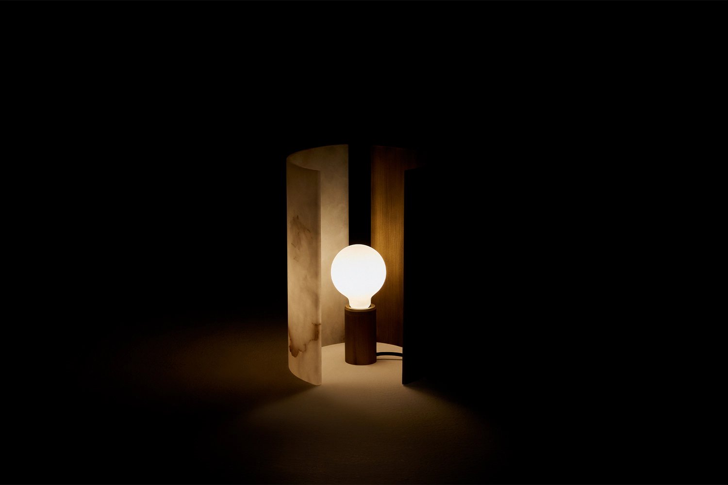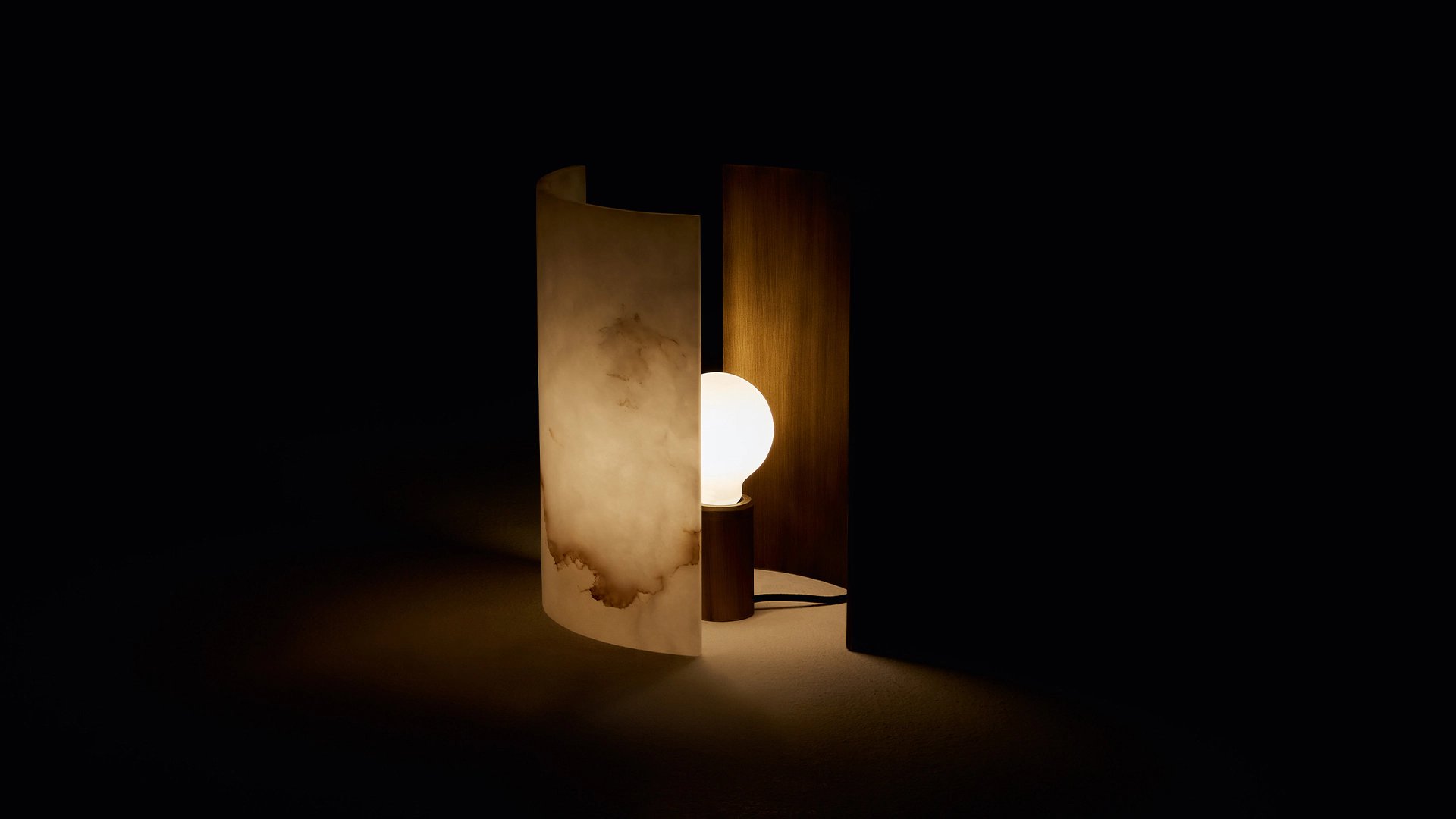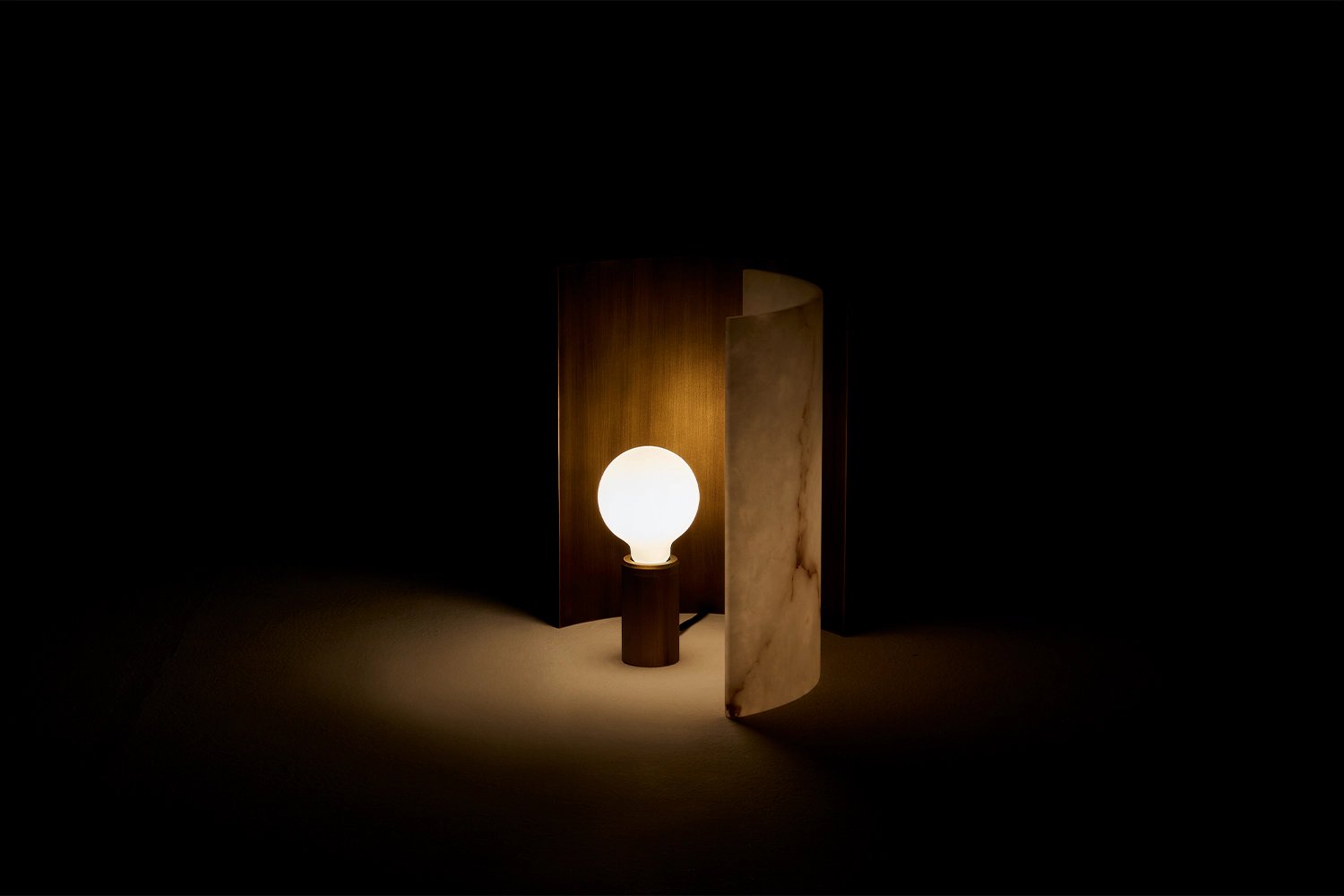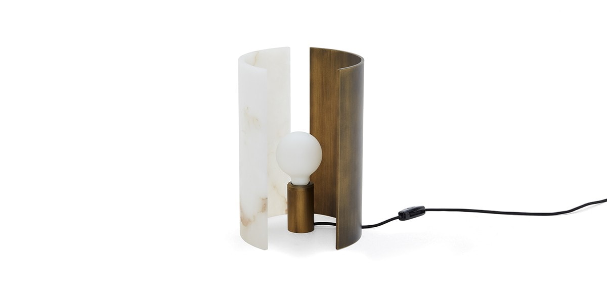 The deconstruction of shadows. An interplay of solids and voids outlines this deconstructed lamp. A light source rested on a bronze cylinder is equipped with two moving panels, one in satin-finish brass-coloured aluminium and another in translucent alabaster, creating elegant light effects. These backdrops made of different materials offer an alternation of warm and delicate lighting. Lastly, the black cotton thread features a dimming system that adjusts the intensity of the light fixture.
