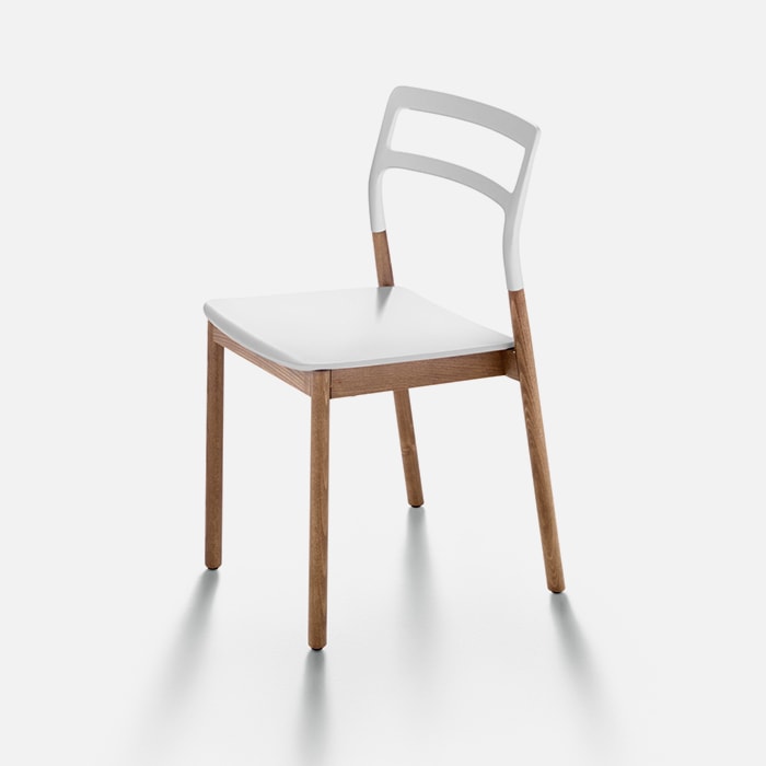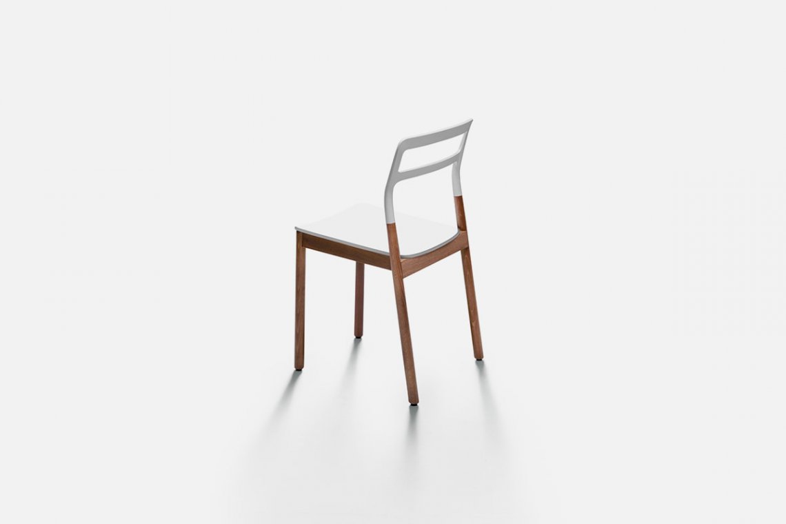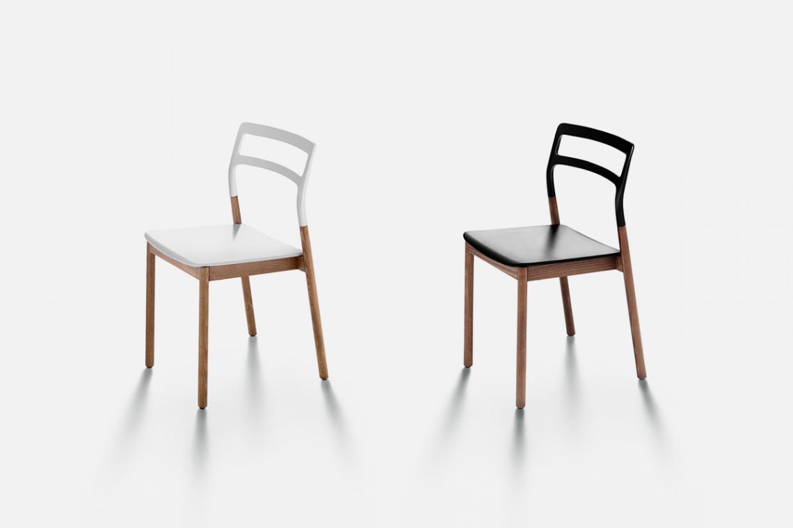 Monica F?rster’s project Florinda lends itself to different interpretations. It passes from the dining area to the study, but it is also perfect for cafes and restaurants due to its agile, contemporary style that makes it unique. Made of natural or mocha stained solid beech wood with a plastic seat and backrest in a variety of colors, it comes with or without armrests and is also stackable.