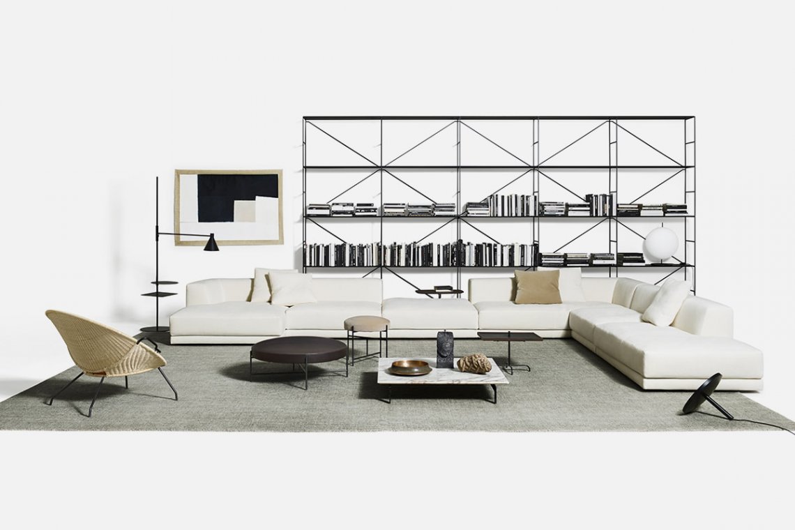 They set the mood at home and underline the geometrical shapes of the living room, used at the center of the space in the freestanding version or placed in an intermediate, corner or end position. Flying Landscape accent tables complete and add character to the seating system with the same name. The wood or marble top in a variety of finishes sits on an unpolished gray steel structure with brass feet.