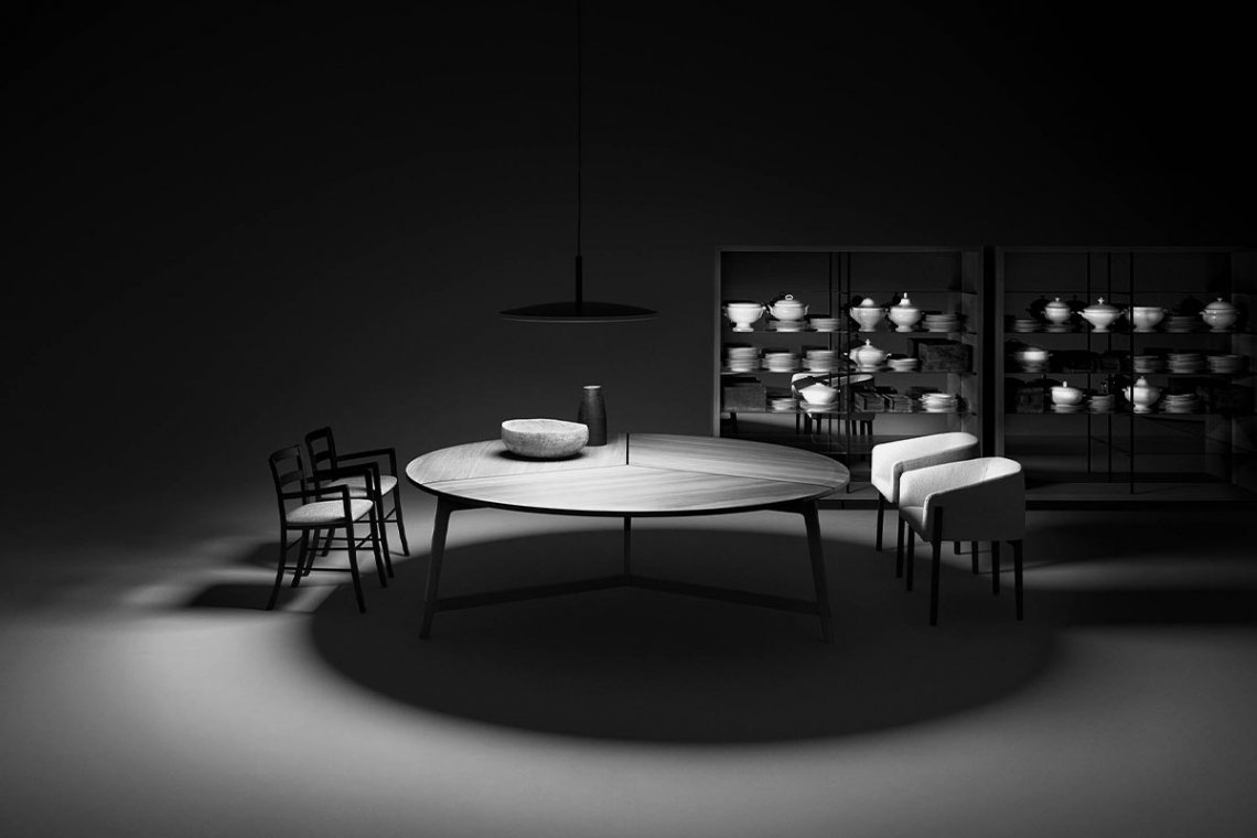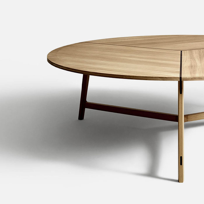 Three sections meet at junction points with a contrasting insert: the round Mawari table, a project by designer Gunther Pelgrims, is solid yet light. Made of natural oak with wengé inserts, it has a strong artisan vibe and a vocation for excellence that starts with the choice of the finest wood.